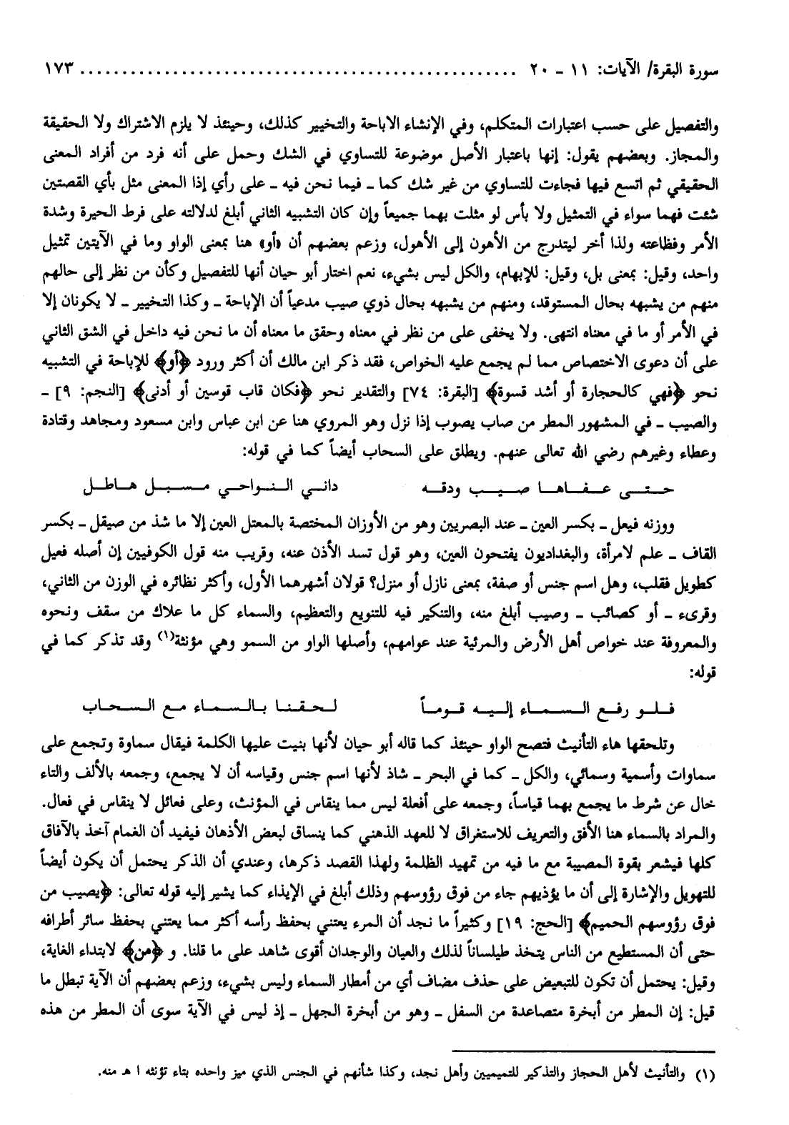 ووزنه فيعل- بكسر العين- عند البصريين وهو من الأوزان المختصة بالمعتل العين إلا ما شذ من صيقل- بكسر القاف- علم لامرأة، والبغداديون يفتحون العين، وهو قول تسد الأذن عنه، وقريب منه قول الكوفيين إن أصله فعيل كطويل فقلب، وهل اسم جنس أو صفة، بمعنى نازل أو منزل؟ قولان أشهرهما الأول، وأكثر نظائره في الوزن من الثاني، وقرىء- أو كصائب- وصيب أبلغ منه، والتنكير فيه للتنويع والتعظيم، والسماء كل ما علاك من سقف ونحوه والمعروفة عند خواص أهل الأرض والمرئية عند عوامهم، وأصلها الواو من السمو وهي مؤنثة (¬1) وقد تذكر كما في قوله: