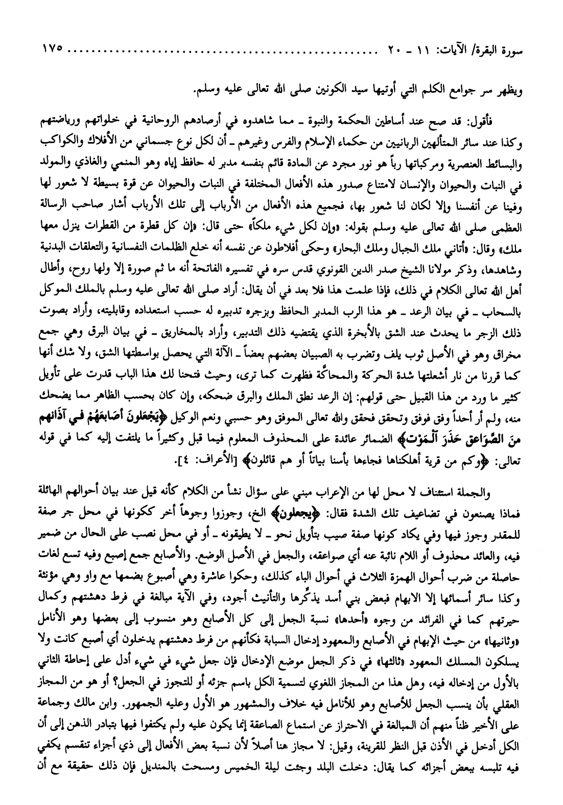 وحكى أفلاطون عن نفسه أنه خلع الظلمات النفسانية والتعلقات البدنية وشاهدها، وذكر مولانا الشيخ صدر الدين القونوي قدس سره في تفسيره الفاتحة أنه ما ثم صورة إلا ولها روح، وأطال أهل الله تعالى الكلام في ذلك، فإذا علمت هذا فلا بعد في أن يقال: أراد صلى الله تعالى عليه وسلم بالملك الموكل بالسحاب- في بيان الرعد- هو هذا الرب المدبر الحافظ وبزجره تدبيره له حسب استعداده وقابليته، وأراد بصوت ذلك الزجر ما يحدث عند الشق بالأبخرة الذي يقتضيه ذلك التدبير، وأراد بالمخاريق- في بيان البرق وهي جمع مخراق وهو في الأصل ثوب يلف وتضرب به الصبيان بعضهم بعضا- الآلة التي يحصل بواسطتها الشق، ولا شك أنها كما قررنا من نار أشعلتها شدة الحركة والمحاكّة فظهرت كما ترى، وحيث فتحنا لك هذا الباب قدرت على تأويل كثير ما ورد من هذا القبيل حتى قولهم: إن الرعد نطق الملك والبرق ضحكه، وإن كان بحسب الظاهر مما يضحك منه، ولم أر أحدا وفق فوفق وتحقق فحقق والله تعالى الموفق وهو حسبي ونعم الوكيل يَجْعَلُونَ أَصابِعَهُمْ فِي آذانِهِمْ مِنَ الصَّواعِقِ حَذَرَ الْمَوْتِ الضمائر عائدة على المحذوف المعلوم فيما قبل وكثيرا ما يلتفت إليه كما في قوله تعالى: وَكَمْ مِنْ قَرْيَةٍ أَهْلَكْناها فَجاءَها بَأْسُنا بَياتاً أَوْ هُمْ قائِلُونَ [الأعراف: 4] .