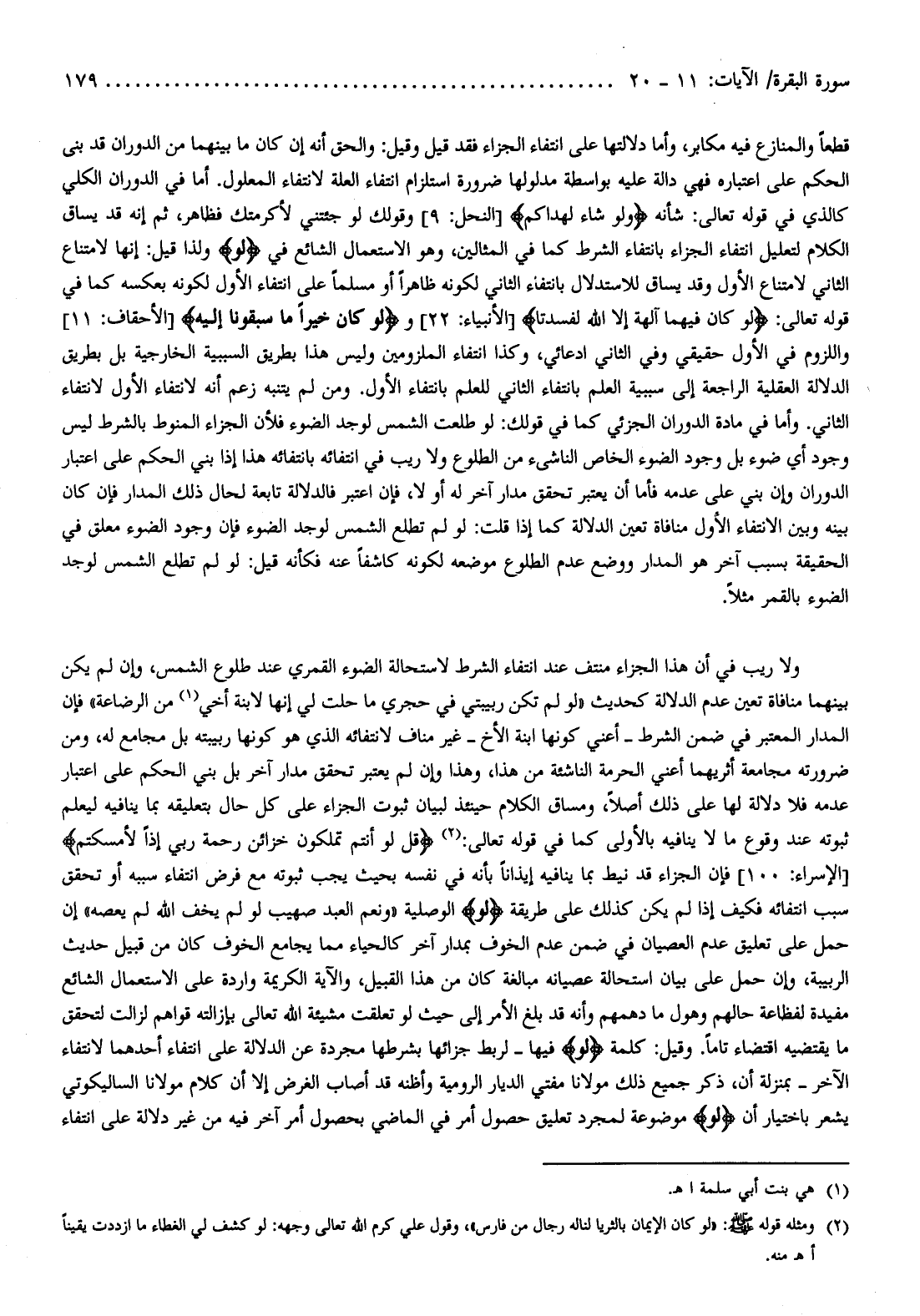قطعا والمنازع فيه مكابر، وأما دلالتها على انتفاء الجزاء فقد قيل وقيل: والحق أنه إن كان ما بينهما من الدوران قد بنى الحكم على اعتباره فهي دالة عليه بواسطة مدلولها ضرورة استلزام انتفاء العلة لانتفاء المعلول. أما في الدوران الكلي كالذي في قوله تعالى: شأنه وَلَوْ شاءَ لَهَداكُمْ [النحل: 9] وقولك لو جئتني لأكرمتك فظاهر، ثم إنه قد يساق الكلام لتعليل انتفاء الجزاء بانتفاء الشرط كما في المثالين، وهو الاستعمال الشائع في لَوْ ولذا قيل: إنها لامتناع الثاني لامتناع الأول وقد يساق للاستدلال بانتفاء الثاني لكونه ظاهرا أو مسلما على انتفاء الأول لكونه بعكسه كما في قوله تعالى: لَوْ كانَ فِيهِما آلِهَةٌ إِلَّا اللَّهُ لَفَسَدَتا [الأنبياء: 22] ولَوْ كانَ خَيْراً ما سَبَقُونا إِلَيْهِ [الأحقاف: 11] واللزوم في الأول حقيقي وفي الثاني ادعائي، وكذا انتفاء الملزومين وليس هذا بطريق السببية الخارجية بل بطريق الدلالة العقلية الراجعة إلى سببية العلم بانتفاء الثاني للعلم بانتفاء الأول. ومن لم يتنبه زعم أنه لانتفاء الأول لانتفاء الثاني. وأما في مادة الدوران الجزئي كما في قولك: لو طلعت الشمس لوجد الضوء فلأن الجزاء المنوط بالشرط ليس وجود أي ضوء بل وجود الضوء الخاص الناشئ من الطلوع ولا ريب في انتفائه بانتفائه هذا إذا بني الحكم على اعتبار الدوران وإن بني على عدمه فأما أن يعتبر تحقق مدار آخر له أو لا، فإن اعتبر فالدلالة تابعة لحال ذلك المدار فإن كان بينه وبين الانتفاء الأول منافاة تعين الدلالة كما إذا قلت: لو لم تطلع الشمس لوجد الضوء فإن وجود الضوء معلق في الحقيقة بسبب آخر هو المدار ووضع عدم الطلوع موضعه لكونه كاشفا عنه فكأنه قيل: لو لم تطلع الشمس لوجد الضوء بالقمر مثلا.
