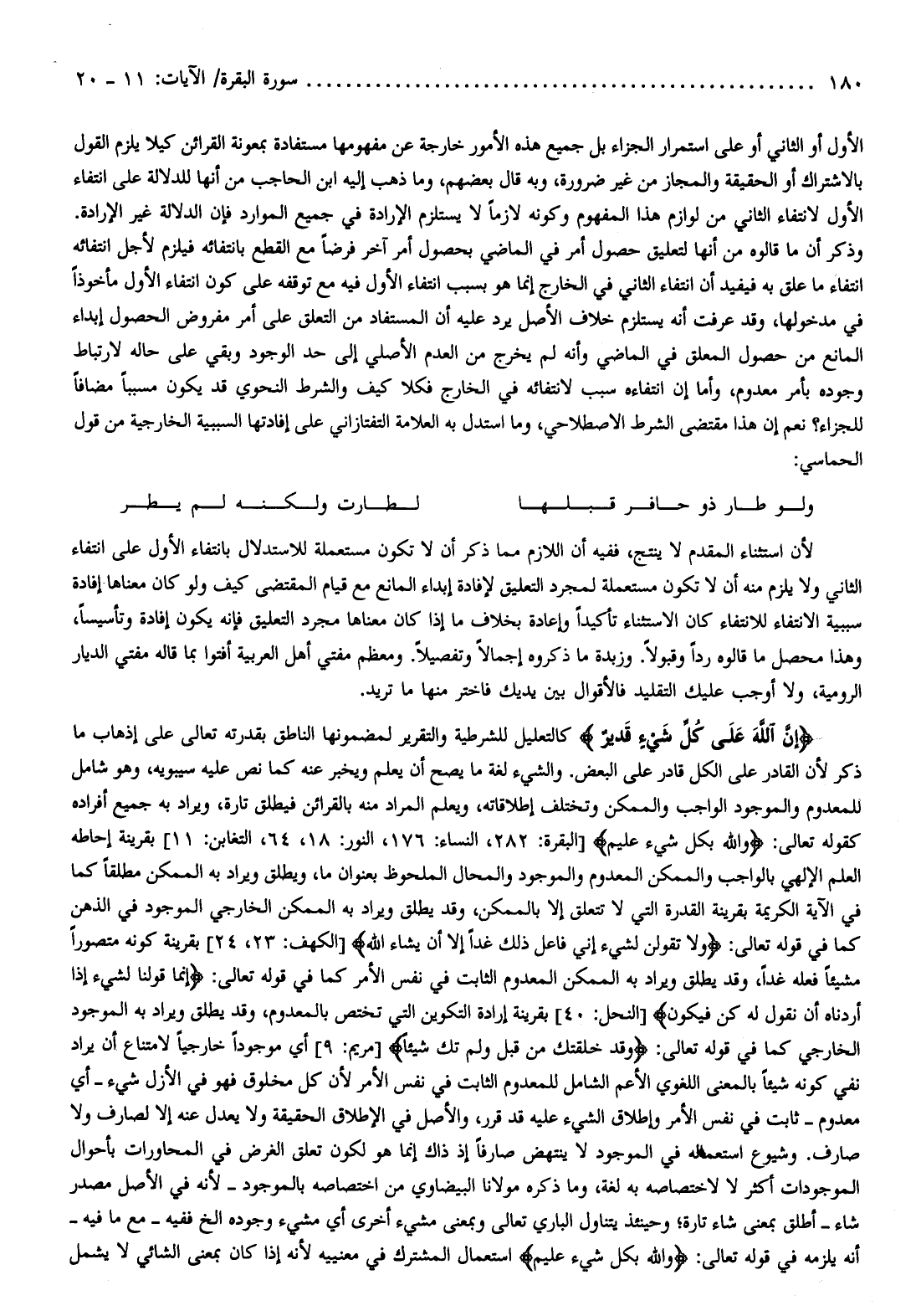 إِنَّ اللَّهَ عَلى كُلِّ شَيْءٍ قَدِيرٌ كالتعليل للشرطية والتقرير لمضمونها الناطق بقدرته تعالى على إذهاب ما ذكر لأن القادر على الكل قادر على البعض. والشيء لغة ما يصح أن يعلم ويخبر عنه كما نص عليه سيبويه، وهو شامل للمعدوم والموجود الواجب والممكن وتختلف إطلاقاته، ويعلم المراد منه بالقرائن فيطلق تارة، ويراد به جميع أفراده كقوله تعالى: وَاللَّهُ بِكُلِّ شَيْءٍ عَلِيمٌ [البقرة: 282، النساء: 176، النور: 18، 64، التغابن: 11] بقرينة إحاطة العلم الإلهي بالواجب والممكن المعدوم والموجود والمحال الملحوظ بعنوان ما، ويطلق ويراد به الممكن مطلقا كما في الآية الكريمة بقرينة القدرة التي لا تتعلق إلا بالممكن، وقد يطلق ويراد به الممكن الخارجي الموجود في الذهن كما في قوله تعالى: وَلا تَقُولَنَّ لِشَيْءٍ إِنِّي فاعِلٌ ذلِكَ غَداً إِلَّا أَنْ يَشاءَ اللَّهُ [الكهف: 23، 24] بقرينة كونه متصورا مشيئا فعله غدا، وقد يطلق ويراد به الممكن المعدوم الثابت في نفس الأمر كما في قوله تعالى: إِنَّما قَوْلُنا لِشَيْءٍ إِذا أَرَدْناهُ أَنْ نَقُولَ لَهُ كُنْ فَيَكُونُ [النحل: 40] بقرينة إرادة التكوين التي تختص بالمعدوم، وقد يطلق ويراد به الموجود الخارجي كما في قوله تعالى: وَقَدْ خَلَقْتُكَ مِنْ قَبْلُ وَلَمْ تَكُ شَيْئاً [مريم: 9] أي موجودا خارجيا لامتناع أن يراد نفي كونه شيئا بالمعنى اللغوي الأعم الشامل للمعدوم الثابت في نفس الأمر لأن كل مخلوق فهو في الأزل شيء- أي معدوم- ثابت في نفس الأمر وإطلاق الشيء عليه قد قرر، والأصل في الإطلاق الحقيقة ولا يعدل عنه إلا لصارف ولا صارف. وشيوع استعماله في الموجود لا ينتهض صارفا إذ ذاك إنما هو لكون تعلق الغرض في المحاورات بأحوال الموجودات أكثر لا لاختصاصه به لغة، وما ذكره مولانا البيضاوي من اختصاصه بالموجود- لأنه في الأصل مصدر شاء- أطلق بمعنى شاء تارة وحينئذ يتناول الباري تعالى وبمعنى مشيء أخرى أي مشيء وجوده إلخ ففيه- مع ما فيه- أنه يلزمه في قوله تعالى: وَاللَّهُ بِكُلِّ شَيْءٍ عَلِيمٌ استعمال المشترك في معنييه لأنه إذا كان بمعنى الشائي لا يشمل