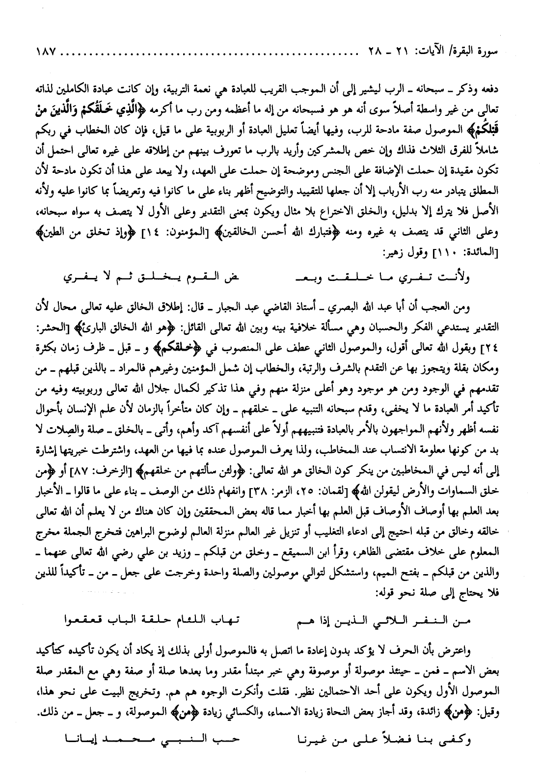 دفعه وذكر- سبحانه- الرب ليشير إلى أن الموجب القريب للعبادة هي نعمة التربية، وإن كانت عبادة الكاملين لذاته تعالى من غير واسطة أصلا سوى أنه هو هو فسبحانه من إله ما أعظمه ومن رب ما أكرمه الَّذِي خَلَقَكُمْ وَالَّذِينَ مِنْ قَبْلِكُمْ الموصول صفة مادحة للرب، وفيها أيضا تعليل العبادة أو الربوبية على ما قيل، فإن كان الخطاب في ربكم شاملا للفرق الثلاث فذاك وإن خص بالمشركين وأريد بالرب ما تعورف بينهم من إطلاقه على غيره تعالى احتمل أن تكون مقيدة إن حملت الإضافة على الجنس وموضحة إن حملت على العهد، ولا يبعد على هذا أن تكون مادحة لأن المطلق يتبادر منه رب الأرباب إلا أن جعلها للتقييد والتوضيح أظهر بناء على ما كانوا فيه وتعريضا بما كانوا عليه ولأنه الأصل فلا يترك إلا بدليل، والخلق الاختراع بلا مثال ويكون بمعنى التقدير وعلى الأول لا يتصف به سواه سبحانه، وعلى الثاني قد يتصف به غيره ومنه فَتَبارَكَ اللَّهُ أَحْسَنُ الْخالِقِينَ [المؤمنون: 14] وَإِذْ تَخْلُقُ مِنَ الطِّينِ [المائدة: 110] وقول زهير: