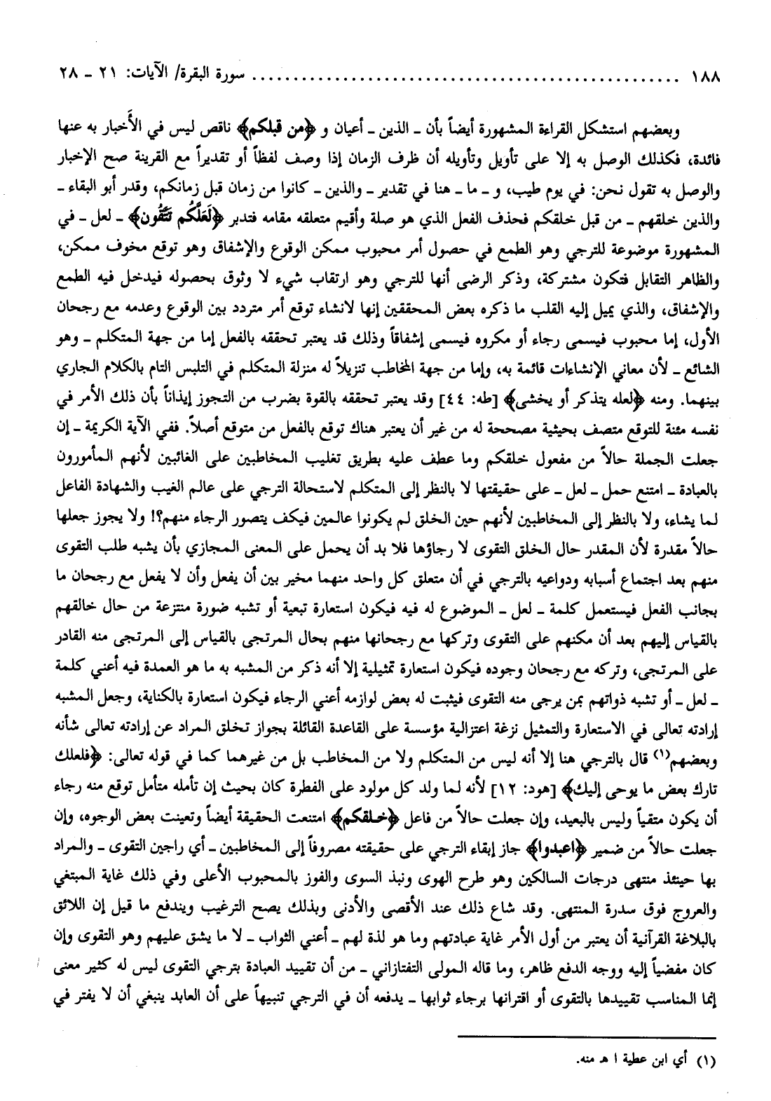 وبعضهم استشكل القراءة المشهورة أيضا بأن- الذين- أعيان ومِنْ قَبْلِكُمْ ناقص ليس في الأخبار به عنها فائدة، فكذلك الوصل به إلا على تأويل وتأويله أن ظرف الزمان إذا وصف لفظا أو تقديرا مع القرينة صح الإخبار والوصل به تقول نحن: في يوم طيب، وما- هنا في تقدير- والذين- كانوا من زمان قبل زمانكم، وقدر أبو البقاء- والذين خلقهم- من قبل خلقكم فحذف الفعل الذي هو صلة وأقيم متعلقه مقامه فتدبر لَعَلَّكُمْ تَتَّقُونَ- لعل- في المشهورة موضوعة للترجي وهو الطمع في حصول أمر محبوب ممكن الوقوع والإشفاق وهو توقع مخوف ممكن، والظاهر التقابل فتكون مشتركة، وذكر الرضى أنها للترجي وهو ارتقاب شيء لا وثوق بحصوله فيدخل فيه الطمع والإشفاق، والذي يميل إليه القلب ما ذكره بعض المحققين إنها لانشاء توقع أمر متردد بين الوقوع وعدمه مع رجحان الأول، إما محبوب فيسمى رجاء أو مكروه فيسمى إشفاقا وذلك قد يعتبر تحققه بالفعل إما من جهة المتكلم- وهو الشائع- لأن معاني الإنشاءات قائمة به، وإما من جهة المخاطب تنزيلا له منزلة المتكلم في التلبس التام بالكلام الجاري بينهما. ومنه لَعَلَّهُ يَتَذَكَّرُ أَوْ يَخْشى [طه: 44] وقد يعتبر تحققه بالقوة بضرب من التجوز إيذانا بأن ذلك الأمر في نفسه مئنة للتوقع متصف بحيثية مصححة له من غير أن يعتبر هناك توقع بالفعل من متوقع أصلا. ففي الآية الكريمة- إن جعلت الجملة حالا من مفعول خلقكم وما عطف عليه بطريق تغليب المخاطبين على الغائبين لأنهم المأمورون بالعبادة- امتنع حمل- لعل- على حقيقتها لا بالنظر إلى المتكلم لاستحالة الترجي على عالم الغيب والشهادة الفاعل لما يشاء، ولا بالنظر إلى المخاطبين لأنهم حين الخلق لم يكونوا عالمين فيكف يتصور الرجاء منهم؟! ولا يجوز جعلها حالا مقدرة لأن المقدر حال الخلق التقوى لا رجاؤها فلا بد أن يحمل على المعنى المجازي بأن يشبه طلب التقوى منهم بعد اجتماع أسبابه ودواعيه بالترجي في أن متعلق كل واحد منهما مخير بين أن يفعل وأن لا يفعل مع رجحان ما بجانب الفعل فيستعمل كلمة- لعل- الموضوع له فيه فيكون استعارة تبعية أو تشبه ضورة منتزعة من حال خالقهم بالقياس إليهم بعد أن مكنهم على التقوى وتركها مع رجحانها منهم بحال المرتجى بالقياس إلى المرتجى منه القادر على المرتجى، وتركه مع رجحان وجوده فيكون استعارة تمثيلية إلا أنه ذكر من المشبه به ما هو العمدة فيه أعني كلمة- لعل- أو تشبه ذواتهم بمن يرجى منه التقوى فيثبت له بعض لوازمه أعني الرجاء فيكون استعارة بالكناية، وجعل المشبه إرادته تعالى في الاستعارة والتمثيل نزغة اعتزالية مؤسسة على القاعدة القائلة بجواز تخلق المراد عن إرادته تعالى شأنه وبعضهم (¬1) قال بالترجي هنا إلا أنه ليس من المتكلم ولا من المخاطب بل من غيرهما كما في قوله تعالى: فَلَعَلَّكَ تارِكٌ بَعْضَ ما يُوحى إِلَيْكَ [هود: 12] لأنه لما ولد كل مولود على الفطرة كان بحيث إن تأمله متأمل توقع منه رجاء أن يكون متقيا وليس بالبعيد، وإن جعلت حالا من فاعل خَلَقَكُمْ امتنعت الحقيقة أيضا وتعينت بعض الوجوه، وإن جعلت حالا من ضمير اعْبُدُوا جاز إبقاء الترجي على حقيقته مصروفا إلى المخاطبين- أي راجين التقوى- والمراد بها حينئذ منتهى درجات السالكين وهو طرح الهوى ونبذ السوي والفوز بالمحبوب الأعلى وفي ذلك غاية المبتغي والعروج فوق سدرة المنتهى. وقد شاع ذلك عند الأقصى والأدنى وبذلك يصح الترغيب ويندفع ما قيل إن اللائق بالبلاغة القرآنية أن يعتبر من أول الأمر غاية عبادتهم وما هو لذة لهم- أعني الثواب- لا ما يشق عليهم وهو التقوى وإن كان مفضيا إليه ووجه الدفع ظاهر، وما قاله المولى التفتازاني- من أن تقييد العبادة بترجي التقوى ليس له كثير معنى إنما المناسب تقييدها بالتقوى أو اقترانها برجاء ثوابها- يدفعه أن في الترجي تنبيها على أن العابد ينبغي أن لا يفتر في