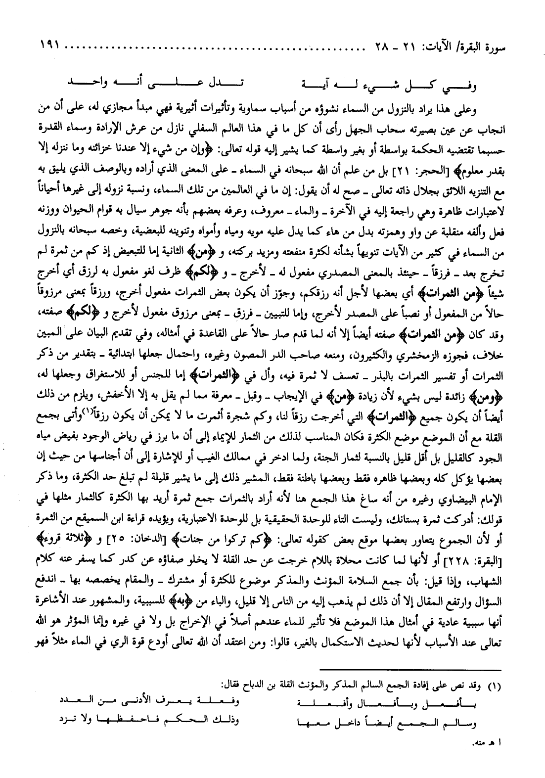 وعلى هذا يراد بالنزول من السماء نشوؤه من أسباب سماوية وتأثيرات أثيرية فهي مبدأ مجازي له، على أن من انجاب عن عين بصيرته سحاب الجهل رأى أن كل ما في هذا العالم السفلي نازل من عرش الإرادة وسماء القدرة حسبما تقتضيه الحكمة بواسطة أو بغير واسطة كما يشير إليه قوله تعالى: وَإِنْ مِنْ شَيْءٍ إِلَّا عِنْدَنا خَزائِنُهُ وَما نُنَزِّلُهُ إِلَّا بِقَدَرٍ مَعْلُومٍ [الحجر: 21] بل من علم أن الله سبحانه في السماء- على المعنى الذي أراده وبالوصف الذي يليق به مع التنزيه اللائق بجلال ذاته تعالى- صح له أن يقول: إن ما في العالمين من تلك السماء، ونسبة نزوله إلى غيرها أحيانا لاعتبارات ظاهرة وهي راجعة إليه في الآخرة- والماء- معروف، وعرفه بعضهم بأنه جوهر سيال به قوام الحيوان ووزنه فعل وألفه منقلبة عن واو وهمزته بدل من هاء كما يدل عليه مويه ومياه وأمواه وتنوينه للبعضية، وخصه سبحانه بالنزول من السماء في كثير من الآيات تنويها بشأنه لكثرة منفعته ومزيد بركته، ومِنَ الثانية إما للتبعيض إذ كم من ثمرة لم تخرج بعد- فرزقا- حينئذ بالمعنى المصدري مفعول له- لأخرج- ولَكُمُ ظرف لغو مفعول به لرزق أي أخرج شيئا مِنَ الثَّمَراتِ أي بعضها لأجل أنه رزقكم، وجوّز أن يكون بعض الثمرات مفعول أخرج، ورزقا بمعنى مرزوقا حالا من المفعول أو نصبا على المصدر لأخرج، وإما للتبيين- فرزق- بمعنى مرزوق مفعول لأخرج ولَكُمُ صفته، وقد كان مِنَ الثَّمَراتِ صفته أيضا إلا أنه لما قدم صار حالا على القاعدة في أمثاله، وفي تقديم البيان على المبين خلاف، فجوزه الزمخشري والكثيرون، ومنعه صاحب الدر المصون وغيره، واحتمال جعلها ابتدائية- بتقدير من ذكر الثمرات أو تفسير الثمرات بالبذر- تعسف لا ثمرة فيه، وأل في الثَّمَراتِ إما للجنس أو للاستغراق وجعلها له، ومِنَ زائدة ليس بشيء لأن زيادة مِنَ في الإيجاب- وقبل- معرفة مما لم يقل به إلا الأخفش، ويلزم من ذلك أيضا أن يكون جميع الثَّمَراتِ التي أخرجت رزقا لنا، وكم شجرة أثمرت ما لا يمكن أن يكون رزقا (¬1) وأتى بجمع القلة مع أن الموضع موضع الكثرة فكان المناسب لذلك من الثمار للإيماء إلى أن ما برز في رياض الوجود بفيض مياه الجود كالقليل بل أقل قليل بالنسبة لثمار الجنة، ولما ادخر في ممالك الغيب أو للإشارة إلى أن أجناسها من حيث إن بعضها يؤكل كله وبعضها ظاهره فقط وبعضها باطنة فقط، المشير ذلك إلى ما يشير قليلة لم تبلغ حد الكثرة، وما ذكر الإمام البيضاوي وغيره من أنه ساغ هذا الجمع هنا لأنه أراد بالثمرات جمع ثمرة أريد بها الكثرة كالثمار مثلها في قولك: أدركت ثمرة بستانك، وليست التاء للوحدة الحقيقية بل للوحدة الاعتبارية، ويؤيده قراءة ابن السميقع من الثمرة أو لأن الجموع يتعاور بعضها موقع بعض كقوله تعالى: كَمْ تَرَكُوا مِنْ جَنَّاتٍ [الدخان: 25] وثَلاثَةَ قُرُوءٍ [البقرة: 228] أو لأنها لما كانت محلاة باللام خرجت عن حد القلة لا يخلو صفاؤه عن كدر كما يسفر عنه كلام الشهاب، وإذا قيل: بأن جمع السلامة المؤنث والمذكر موضوع للكثرة أو مشترك- والمقام يخصصه بها- اندفع السؤال وارتفع المقال إلا أن ذلك لم يذهب إليه من الناس إلا قليل، والباء من بِهِ للسببية، والمشهور عند الأشاعرة أنها سببية عادية في أمثال هذا الموضع فلا تأثير للماء عندهم أصلا في الإخراج بل ولا في غيره وإنما المؤثر هو الله تعالى عند الأسباب لأنها لحديث الاستكمال بالغير، قالوا: ومن اعتقد أن الله تعالى أودع قوة الري في الماء مثلا فهو