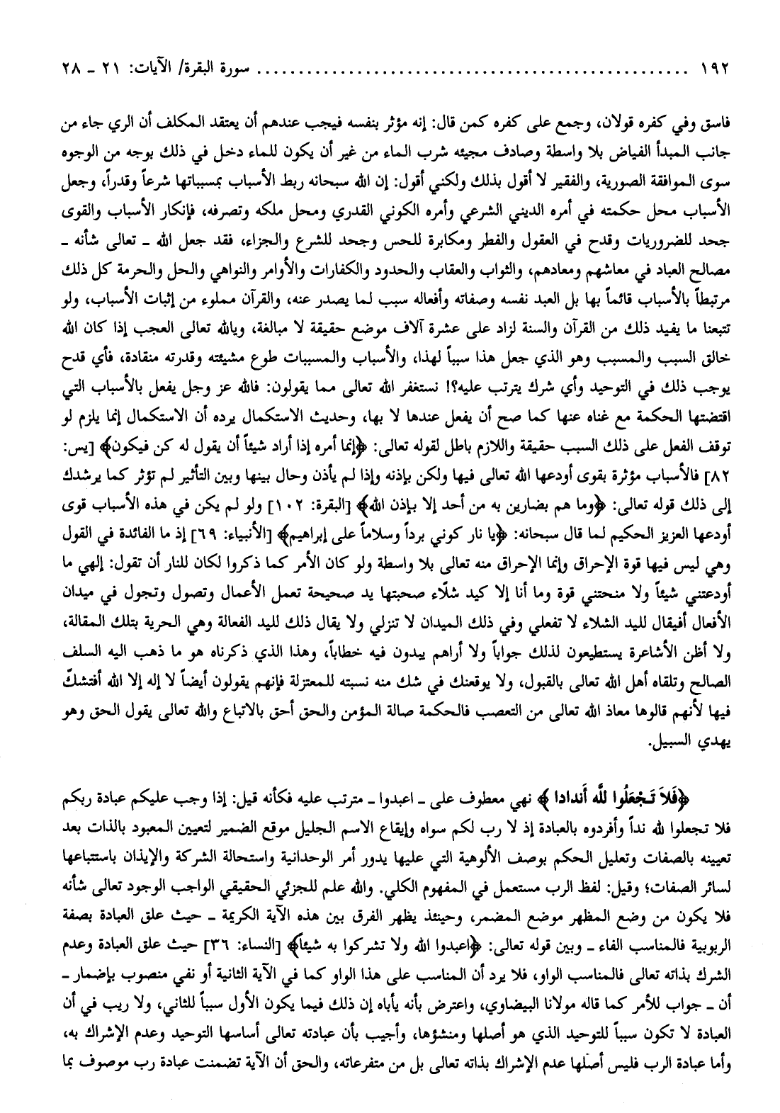 82] فالأسباب مؤثرة بقوى أودعها الله تعالى فيها ولكن بإذنه وإذا لم يأذن وحال بينها وبين التأثير لم تؤثر كما يرشدك إلى ذلك قوله تعالى: وَما هُمْ بِضارِّينَ بِهِ مِنْ أَحَدٍ إِلَّا بِإِذْنِ اللَّهِ [البقرة: 102] ولو لم يكن في هذه الأسباب قوى أودعها العزيز الحكيم لما قال سبحانه: يا نارُ كُونِي بَرْداً وَسَلاماً عَلى إِبْراهِيمَ [الأنبياء: 69] إذ ما الفائدة في القول وهي ليس فيها قوة الإحراق وإنما الإحراق منه تعالى بلا واسطة ولو كان الأمر كما ذكروا لكان للنار أن تقول: إلهي ما أودعتني شيئا ولا منحتني قوة وما أنا إلا كيد شلّاء صحبتها يد صحيحة تعمل الأعمال وتصول وتجول في ميدان الأفعال أفيقال لليد الشلاء لا تفعلي وفي ذلك الميدان لا تنزلي ولا يقال ذلك لليد الفعالة وهي الحرية بتلك المقالة، ولا أظن الأشاعرة يستطيعون لذلك جوابا ولا أراهم يبدون فيه خطابا، وهذا الذي ذكرناه هو ما ذهب إليه السلف الصالح وتلقاه أهل الله تعالى بالقبول، ولا يوقعنك في شك منه نسبته للمعتزلة فإنهم يقولون أيضا لا إله إلا الله أفتشكّ فيها لأنهم قالوها معاذ الله تعالى من التعصب فالحكمة صالة المؤمن والحق أحق بالاتباع والله تعالى يقول الحق وهو يهدي السبيل.
