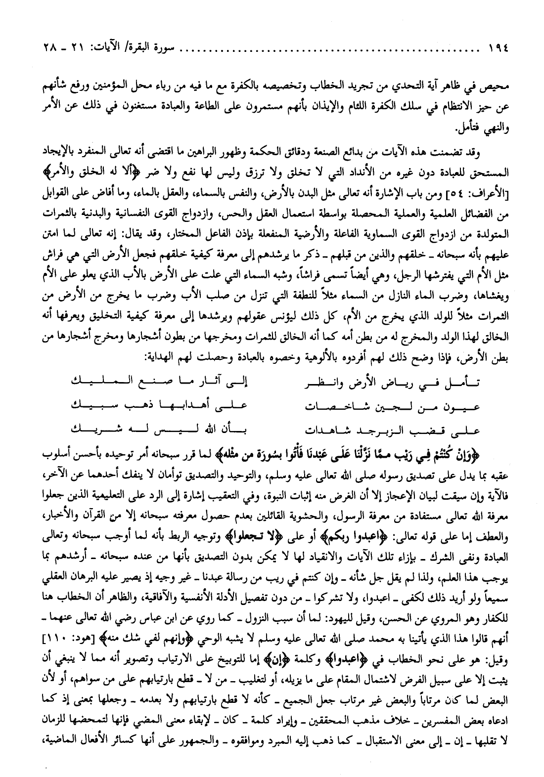 وَإِنْ كُنْتُمْ فِي رَيْبٍ مِمَّا نَزَّلْنا عَلى عَبْدِنا فَأْتُوا بِسُورَةٍ مِنْ مِثْلِهِ لما قرر سبحانه أمر توحيده بأحسن أسلوب عقبه بما يدل على تصديق رسوله صلى الله تعالى عليه وسلم، والتوحيد والتصديق توأمان لا ينفك أحدهما عن الآخر، فالآية وإن سيقت لبيان الإعجاز إلا أن الغرض منه إثبات النبوة، وفي التعقيب إشارة إلى الرد على التعليمية الذين جعلوا معرفة الله تعالى مستفادة من معرفة الرسول، والحشوية القائلين بعدم حصول معرفته سبحانه إلا من القرآن والأخبار، والعطف إما على قوله تعالى: اعْبُدُوا رَبَّكُمُ أو على فَلا تَجْعَلُوا وتوجيه الربط بأنه لما أوجب سبحانه وتعالى العبادة ونفى الشرك- بإزاء تلك الآيات والانقياد لها لا يمكن بدون التصديق بأنها من عنده سبحانه- أرشدهم بما يوجب هذا العلم، ولذا لم يقل جل شأنه- وإن كنتم في ريب من رسالة عبدنا- غير وجيه إذ يصير عليه البرهان العقلي سميعا ولو أريد ذلك لكفى- اعبدوا، ولا تشركوا- من دون تفصيل الأدلة الأنفسية والآفاقية، والظاهر أن الخطاب هنا للكفار وهو المروي عن الحسن، وقيل لليهود: لما أن سبب النزول- كما روي عن ابن عباس رضي الله تعالى عنهما- أنهم قالوا هذا الذي يأتينا به محمد صلى الله تعالى عليه وسلم لا يشبه الوحي وَإِنَّهُمْ لَفِي شَكٍّ مِنْهُ [هود: 110] وقيل: هو على نحو الخطاب في اعْبُدُوا وكلمة إِنْ إما للتوبيخ على الارتياب وتصوير أنه مما لا ينبغي أن يثبت إلا على سبيل الفرض لاشتمال المقام على ما يزيله، أو لتغليب- من لا- قطع بارتيابهم على من سواهم، أو لأن البعض لما كان مرتابا والبعض غير مرتاب جعل الجميع- كأنه لا قطع بارتيابهم ولا بعدمه- وجعلها بمعنى إذ كما ادعاه بعض المفسرين- خلاف مذهب المحققين- وإيراد كلمة- كان- لإبقاء معنى المضي فإنها لتمحضها للزمان لا تقلبها- إن- إلى معنى الاستقبال- كما ذهب إليه المبرد وموافقوه- والجمهور على أنها كسائر الأفعال الماضية،