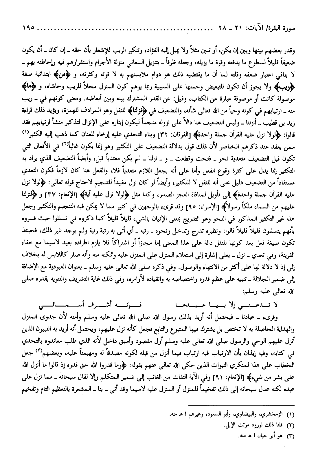وقدر بعضهم بينها وبين إن يكن، أو تبين مثلا ولا يميل إليه الفؤاد، وتنكير الريب للإشعار بأن حقه- إن كان- أن يكون ضعيفا قليلا لسطوع ما يدفعه وقوة ما يزيله، وجعله ظرفا- بتنزيل المعاني منزلة الأجرام واستقرارهم فيه وإحاطته بهم- لا ينافي اعتبار ضعفه وقلته لما أن ما يقتضيه ذلك هو دوام ملابستهم به لا قوته وكثرته، ومن ابتدائية صفة رَيْبٍ ولا يجوز أن تكون للتبعيض وحملها على السببية ربما يوهم كون المنزل محلا للريب وحاشاه، وما موصولة كانت أو موصوفة عبارة عن الكتاب، وقيل: عن القدر المشترك بينه وبين أبعاضه. ومعنى كونهم في- ريب منه- ارتيابهم في كونه وحيا من الله تعالى شأنه، والتضعيف في نَزَّلْنا للنقل وهو المرادف للهمزة، ويؤيد ذلك قراءة زيد بن قطيب- أنزلنا- وليس التضعيف هنا دالا على نزوله منجما ليكون إيثاره على الإنزال لتذكير منشأ ارتيابهم فقد قالوا: لَوْلا نُزِّلَ عَلَيْهِ الْقُرْآنُ جُمْلَةً واحِدَةً [الفرقان: 32] وبناء التحدي عليه إرخاء للعنان كما ذهب إليه الكثير (¬1) ممن يعقد عند ذكرهم الخناصر لأن ذلك قول بدلالة التضعيف على التكثير وهو إنما يكون غالبا (¬2) في الأفعال التي تكون قبل التضعيف متعدية نحو- فتحت وقطعت- ونزلنا- لم يكن معتديا قبل، وأيضا التضعيف الذي يراد به التكثير إنما يدل على كثرة وقوع الفعل وأما على أنه يجعل اللازم متعديا فلا، والفعل هنا كان لازما فكون التعدي مستفادا من التضعيف دليل على أنه للنقل لا للتكثير، وأيضا لو كان نزل مفيدا للتنجيم لاحتاج قوله تعالى: لَوْلا نُزِّلَ عَلَيْهِ الْقُرْآنُ جُمْلَةً واحِدَةً إلى تأويل لمنافاة العجز الصدر، وكذا مثل لَوْلا نُزِّلَ عَلَيْهِ آيَةٌ [الأنعام: 37] ولَنَزَّلْنا عَلَيْهِمْ مِنَ السَّماءِ مَلَكاً رَسُولًا [الإسراء: 95] وقد قرىء بالوجهين في كثير مما لا يمكن فيه التنجيم والتكثير وجعل هذا غير التكثير المذكور في النحو وهو التدريج بمعنى الإتيان بالشيء قليلا قليلا كما ذكروه في تسللوا حيث فسروه بأنهم يتسللون قليلا قليلا قالوا: ونظيره تدرج وتدخل ونحوه- رتبه- أي أتى به رتبة رتبة ولم يوجد غير ذلك، فحينئذ تكون صيغة فعل بعد كونها للنقل دالة على هذا المعنى إما مجازا أو اشتراكا فلا يلزم اطراده بعيد لا سيما مع خفاء القرينة، وفي تعدي- نزل- بعلى إشارة إلى استعلاء المنزل على المنزل