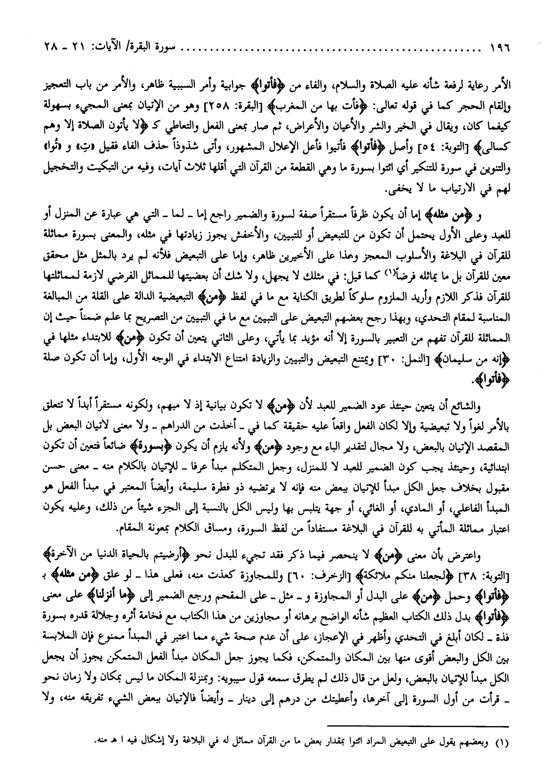 (¬1) وبعضهم يقول على التبعيض المراد ائتوا بمقدار بعض ما من القرآن مماثل له في البلاغة ولا إشكال فيه اهـ منه.