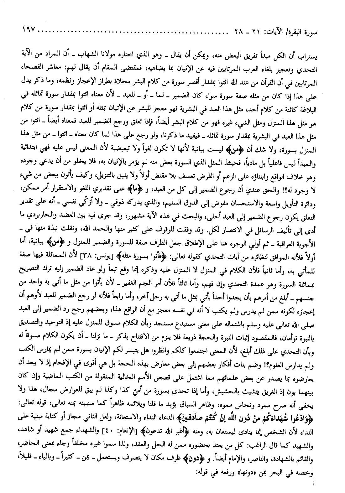 يستراب أن الكل مبدأ تفريق البعض منه، ويمكن أن يقال- وهو الذي اختاره مولانا الشهاب- أن المراد من الآية التحدي وتعجيز بلغاء العرب المرتابين فيه عن الإتيان بما يضاهيه، فمقتضى المقام أن يقال لهم: معاشر الفصحاء المرتابين في أن القرآن من عند الله ائتوا بمقدار أقصر سورة من كلام البشر محلاة بطراز الإعجاز ونظمه، وما ذكر يدل على هذا إذا كان من مثله صفة سورة سواء كان الضمير- لما- أو- للعبد- لأن معناه ائتوا بمقدار سورة تماثله في البلاغة كائنة من كلام أحد، مثل هذا العبد في البشرية فهو معجز للبشر عن الإتيان بمثله أو ائتوا بمقدار سورة من كلام هو مثل هذا المنزل ومثل الشيء غيره فهو من كلام البشر أيضا، فإذا تعلق ورجع الضمير للعبد فمعناه أيضا- ائتوا من مثل هذا العبد في البشرية بمقدار سورة تماثله- فيفيد ما ذكرنا، ولو رجع على هذا لما كان معناه- ائتوا- من مثل هذا المنزل بسورة، ولا شك أن مِنْ ليست بيانية لأنها لا تكون لغوا ولا تبعيضية لأن المعنى ليس عليه فهي ابتدائية والمبدأ ليس فاعليا بل ماديا، فحينئذ المثل الذي السورة بعض منه لم يؤمر بالإتيان به، فلا يخلو من أن يدعي وجوده وهو خلاف الواقع وابتناؤه على الزعم أو الفرض تعسف بلا مقتض أولا ولا يليق بالتنزيل، وكيف يأتون ببعض من شيء لا وجود له؟! والحق عندي أن رجوع الضمير إلى كل من العبد، ومِمَّا على تقديري اللغو والاستقرار أمر ممكن، ودائرة التأويل واسعة والاستحسان مفوض إلى الذوق السليم، والذي يدركه ذوقي- ولا أزكّي نفسي- أنه على تقدير التعلق يكون رجوع الضمير إلى العبد أحلى، والبحث في هذه الآية مشهور، وقد جرى فيه بين العضد والجاربردي ما أدى إلى تأليف الرسائل في الانتصار لكل. وقد وفقت للوقوف على كثير منها والحمد لله، ونقلت نبذة منها في- الأجوبة العراقية- ثم أولي الوجوه هنا على الإطلاق جعل الظرف صفة للسورة والضمير للمنزل ومِنْ بيانية، أما أولا فلأنه الموافق لنظائره من آيات التحدي كقوله تعالى: فَأْتُوا بِسُورَةٍ مِثْلِهِ [يونس: 38] لأن المماثلة فيها صفة للمأتي به، وأما ثانيا فلأن الكلام في المنزل لا المنزل عليه وذكره إنما وقع تبعا ولو عاد الضمير إليه ترك التصريح بمماثلة السورة وهو عمدة التحدي وإن فهم، وأما ثالثا فلأن أمر الجم الغفير- لأن يأتوا من مثل ما أتى به واحد من جنسهم- أبلغ من أمرهم بأن يجدوا أحدا يأتي بمثل ما أتى به رجل آخر، وأما رابعا فلأنه لو رجع الضمير للعبد لأوهم أن إعجازه لكونه ممن لم يدرس ولم يكتب لا أنه في نفسه معجز مع أن الواقع هذا، وبعضهم رجح رد الضمير إلى العبد صلى الله تعالى عليه وسلم باشتماله على معنى مستبدع مستجد وبأن الكلام مسوق للمنزل عليه إذ التوحيد والتصديق بالنبوة توأمان، فالمقصود إثبات النبوة والحجة ذريعة فلا يلزم من الافتتاح بذكر- ما نزلنا- أن يكون الكلام مسوقا له وبأن التحدي على ذلك أبلغ، لأن المعنى اجتمعوا كلكم وانظروا هل يتيسر لكم الإتيان بسورة ممن لم يمارس الكتب ولم يدارس العلوم؟! وضم بنات أفكار بعضهم إلى بعض معارض بهذه الحجة بل هي أقوى في الإفحام إذ لا يبعد أن يعارضوه بما يصدر عن بعض علمائهم مما اشتمل على قصص الأمم الخالية المنقولة من الكتب الماضية وإن كان بينهما بون إذ الغريق يتشبث بالحشيش، وأما إذا تحدى بسورة من أمي كذا وكذا لم يبق للعوارض مجال، هذا ولا يخفى أنه صرح ممرد ونحاس مموه، وظاهر السباق يؤيد ما قلنا ويلائمه ظاهرا كما سنبينه بمنه تعالى، قوله تعالى: