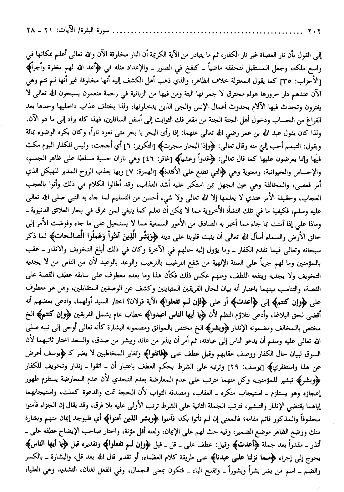 ولذا كان يقول عبد الله بن عمر رضي الله تعالى عنهما: إذا رأى البحر يا بحر متى تعود نارا، وكان يكره الوضوء بمائة ويقول: التيمم أحب إليّ منه وقال تعالى: وَإِذَا الْبِحارُ سُجِّرَتْ [التكوير: 6] أي أججت، وليس للكفار اليوم مكث فيها وإنما يعرضون عليها كما قال تعالى: غُدُوًّا وَعَشِيًّا [غافر: 46] وهي ناران حسية مسلطة على ظاهر الجسم، والإحساس والحيوانية، ومعنوية وهي الَّتِي تَطَّلِعُ عَلَى الْأَفْئِدَةِ [الهمزة: 7] وبها يعذب الروح المدبر للهيكل الذي أمر فعصى، والمخالفة وهي عين الجهل بمن استكبر عليه أشد العذاب، وقد أطالوا الكلام في ذلك وأتوا بالعجب العجاب، وحقيقة الأمر عندي لا يعلمها إلا الله تعالى ولا شيء أحسن من التسليم لما جاء به النبي صلى الله تعالى عليه وسلم، فكيفية ما في تلك النشأة الأخروية مما لا يمكن أن تعلم كما ينبغي لمن غرق في بحار العلائق الدنيوية- وماذا علي إذا آمنت بما جاء مما أخبر به الصادق من الأمور السمعية مما لا يستحيل على ما جاء وفوضت الأمر إلى خالق الأرض والسماء أسأل الله تعالى أن يثبت قلوبنا على دينه وَبَشِّرِ الَّذِينَ آمَنُوا وَعَمِلُوا الصَّالِحاتِ لما ذكر سبحانه وتعالى فيما تقدم الكفار- وما يؤول إليه حالهم في الآخرة وكان في ذلك أبلغ التخويف والانذار- عقب بالمؤمنين وما لهم جريا على السنة الإلهية من شفع الترغيب بالترهيب والوعد بالوعيد لأن من الناس من لا يجديه التخويف ولا يجديه وينفعه اللطف، ومنهم عكس ذلك فكأن هذا وما بعده معطوف على سابقه عطف القصة على القصة، والتناسب بينهما باعتبار أنه بيان لحال الفريقين المتباينين وكشف عن الوصفين المتقابلين، وهل هو معطوف على وَإِنْ كُنْتُمْ إلى أُعِدَّتْ أو على فَإِنْ لَمْ تَفْعَلُوا الآية قولان؟ اختار السيد أولهما، وادعى بعضهم أنه أقضى لحق البلاغة، وأدعى لتلاؤم النظم لأن يا أَيُّهَا النَّاسُ اعْبُدُوا خطاب عام يشمل الفريقين وَإِنْ كُنْتُمْ إلخ مختص بالمخالف ومضمونه الإنذار وَبَشِّرِ إلخ مختص بالموافق ومضمونه البشارة كأنه تعالى أوحى إلى نبيه صلى الله تعالى عليه وسلم أن يدعو الناس إلى عبادته، ثم أمر أن ينذر من عاند ويبشر من صدق، والسعد اختار ثانيهما لأن السوق لبيان حال الكفار ووصف عقابهم وقيل عطف على فَاتَّقُوا وتغاير المخاطبين لا يضر ك يُوسُفُ أَعْرِضْ عَنْ هذا وَاسْتَغْفِرِي [يوسف: 29] وترتبه على الشرط بحكم العطف باعتبار أن- اتقوا- إنذار وتخويف للكفار وَبَشِّرِ تبشير للمؤمنين، وكل منهما مترتب على عدم المعارضة بعدم التحدي لأن عدم المعارضة يستلزم ظهور إعجازه وهو يستلزم- استيجاب منكره- العقاب، ومصدقه الثواب لأن الحجة تمت والدعوة كملت، واستيجابهما إياهما يقتضي الإنذار والتبشير، فترتب الجملة الثانية على الشرط ترتب الأولى عليه بلا فرق، وقد يقال إن الجزاء فآمنوا محذوفا والمذكور قائم مقامه فالمعنى إن لم تأتوا بكذا فآمنوا وَبَشِّرِ الَّذِينَ آمَنُوا أي فليوجد إيمان منهم وبشارة منك ووضع الظاهر موضع الضمير، وفيه حث لهم على الإيمان، ولعله أقل مؤنة، واختار صاحب الإيضاح عطفه على- أنذر- مقدرا بعد جملة أُعِدَّتْ وقيل: عطف على- قل- قبل فَإِنْ لَمْ تَفْعَلُوا وتقديره قبل يا أَيُّهَا النَّاسُ يحوج إلى إجراء مِمَّا نَزَّلْنا عَلى عَبْدِنا على طريقة كلام العظماء، أو تقدير قال الله بعد قل، والبشارة- بالكسر والضم- اسم من بشر بشرا وبشورا- وتفتح الباء- فتكون بمعنى الجمال، وفي الفعل لغتان، التشديد وهي العليا،