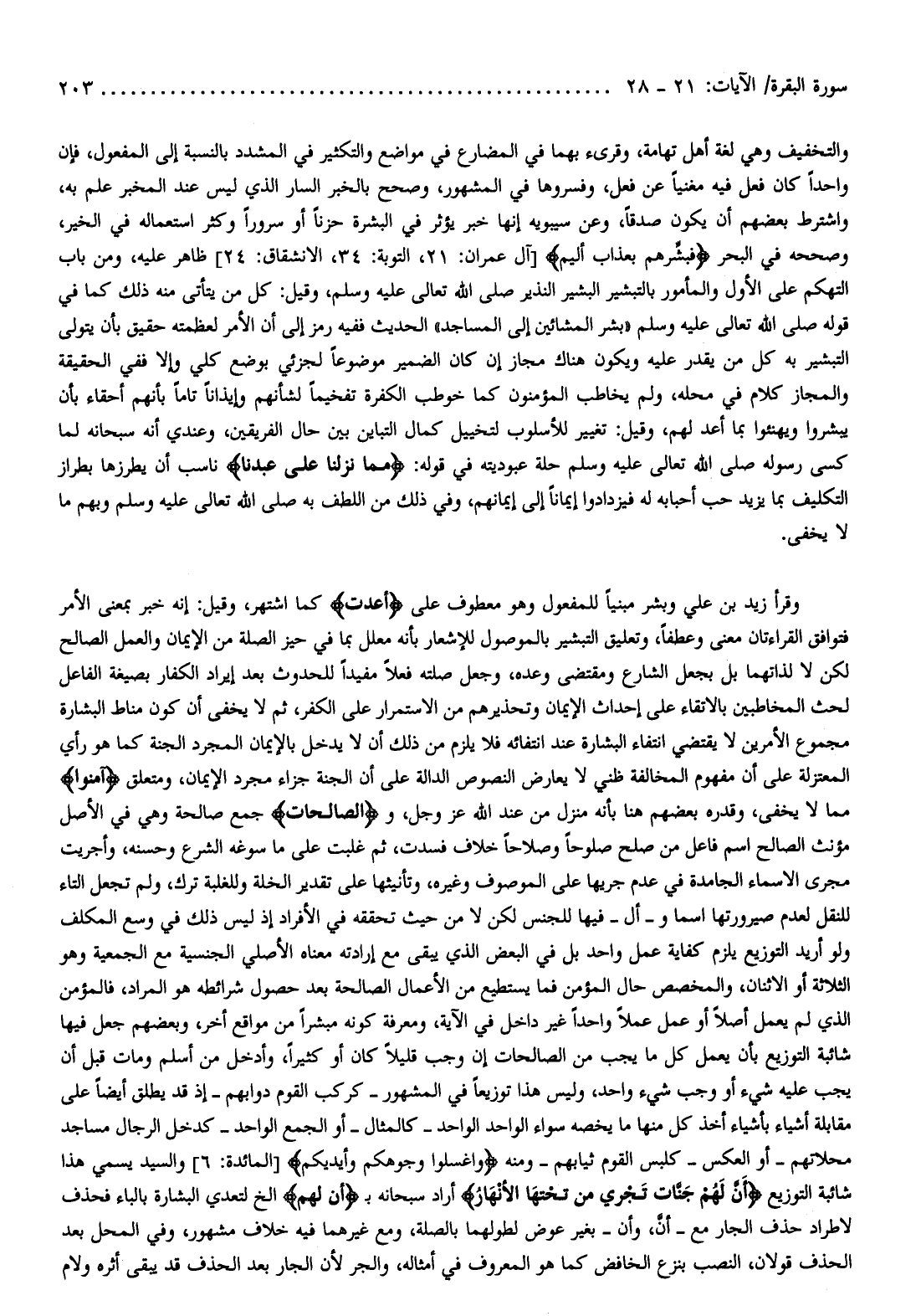 وقرأ زيد بن علي وبشر مبنيا للمفعول وهو معطوف على أُعِدَّتْ كما اشتهر، وقيل: إنه خبر بمعنى الأمر فتوافق القراءتان معنى وعطفا، وتعليق التبشير بالموصول للإشعار بأنه معلل بما في حيز الصلة من الإيمان والعمل الصالح لكن لا لذاتهما بل بجعل الشارع ومقتضى وعده، وجعل صلته فعلا مفيدا للحدوث بعد إيراد الكفار بصيغة الفاعل لحث المخاطبين بالاتقاء على إحداث الإيمان وتحذيرهم من الاستمرار على الكفر، ثم لا يخفى أن كون مناط البشارة مجموع الأمرين لا يقتضي انتفاء البشارة عند انتفائه فلا يلزم من ذلك أن لا يدخل بالإيمان المجرد الجنة كما هو رأي المعتزلة على أن مفهوم المخالفة ظني لا يعارض النصوص الدالة على أن الجنة جزاء مجرد الإيمان، ومتعلق آمَنُوا مما لا يخفى، وقدره بعضهم هنا بأنه منزل من عند الله عز وجل، والصَّالِحاتِ جمع صالحة وهي في الأصل مؤنث الصالح اسم فاعل من صلح صلوحا وصلاحا خلاف فسدت، ثم غلبت على ما سوغه الشرع وحسنه، وأجريت مجرى الأسماء الجامدة في عدم جريها على الموصوف وغيره، وتأنيثها على تقدير الخلة وللغلبة ترك، ولم تجعل التاء للنقل لعدم صيرورتها اسما وأل- فيها للجنس لكن لا من حيث تحققه في الأفراد إذ ليس ذلك في وسع المكلف ولو أريد التوزيع يلزم كفاية عمل واحد بل في البعض الذي يبقى مع إرادته معناه الأصلي الجنسية مع الجمعية وهو الثلاثة أو الاثنان، والمخصص حال المؤمن فما يستطيع من الأعمال الصالحة بعد حصول شرائطه هو المراد، فالمؤمن الذي لم يعمل أصلا أو عمل عملا واحدا غير داخل في الآية، ومعرفة كونه مبشرا من مواقع أخر، وبعضهم جعل فيها شائبة التوزيع بأن يعمل كل ما يجب من الصالحات إن وجب قليلا كان أو كثيرا، وأدخل من أسلم ومات قبل أن يجب عليه شيء أو وجب شيء واحد، وليس هذا توزيعا في المشهور- كركب القوم دوابهم- إذ قد يطلق أيضا على مقابلة أشياء بأشياء أخذ كل منها ما يخصه سواء الواحد الواحد- كالمثال- أو الجمع الواحد- كدخل الرجال مساجد محلاتهم- أو العكس- كلبس القوم ثيابهم- ومنه فَاغْسِلُوا وُجُوهَكُمْ وَأَيْدِيَكُمْ [المائدة: 6] والسيد يسمي هذا شائبة التوزيع أَنَّ لَهُمْ جَنَّاتٍ تَجْرِي مِنْ تَحْتِهَا الْأَنْهارُ أراد سبحانه ب أَنَّ لَهُمْ إلخ لتعدي البشارة بالباء فحذف لاطراد حذف الجار مع- أنّ، وأن- بغير عوض لطولهما بالصلة، ومع غيرهما فيه خلاف مشهور، وفي المحل بعد الحذف قولان، النصب بنزع الخافض كما هو المعروف في أمثاله، والجر لأن الجار بعد الحذف قد يبقى أثره ولام