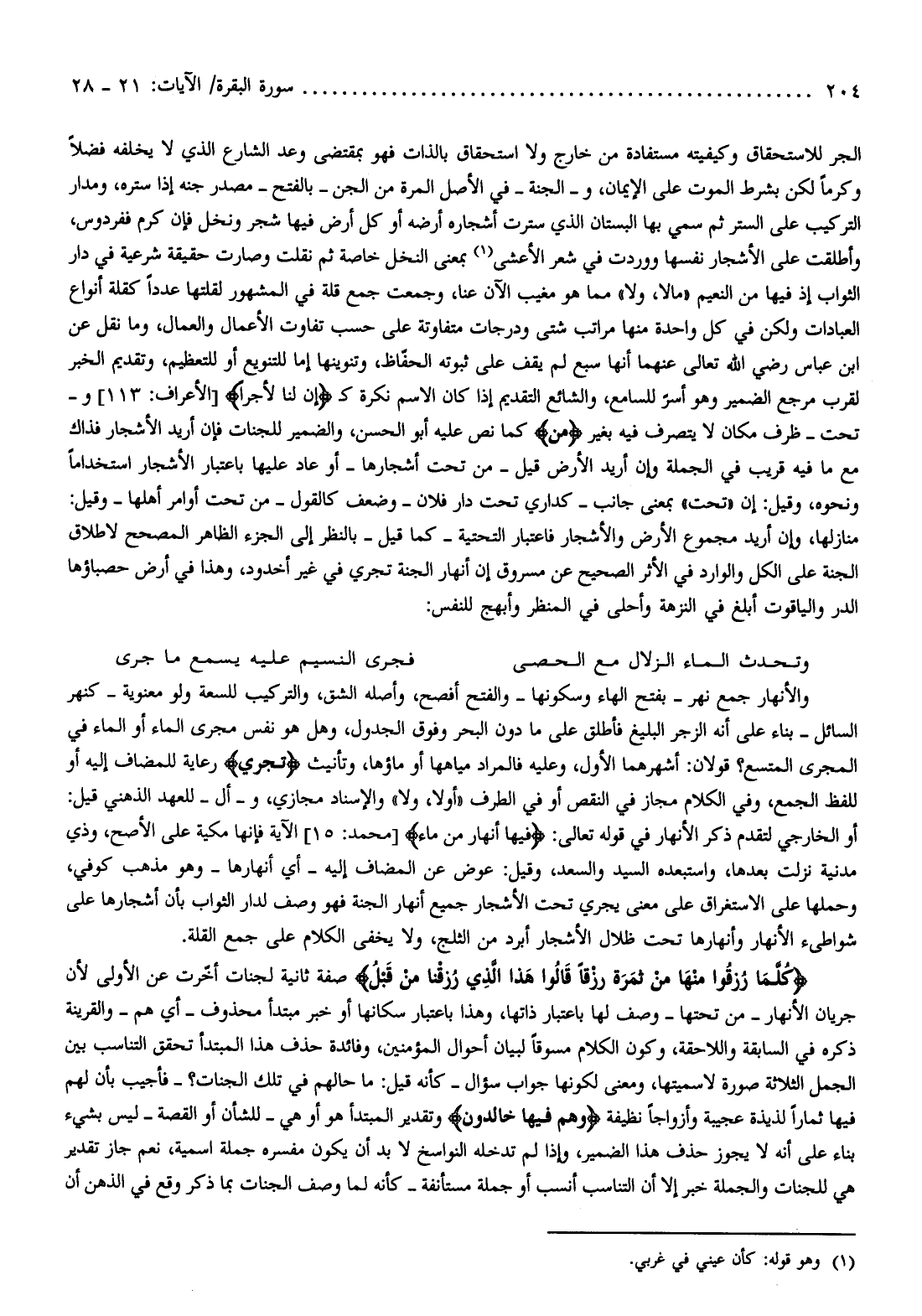 الجر للاستحقاق وكيفيته مستفادة من خارج ولا استحقاق بالذات فهو بمقتضى وعد الشارع الذي لا يخلفه فضلا وكرما لكن بشرط الموت على الإيمان، والجنة- في الأصل المرة من الجن- بالفتح- مصدر جنه إذا ستره، ومدار التركيب على الستر ثم سمي بها البستان الذي سترت أشجاره أرضه أو كل أرض فيها شجر ونخل فإن كرم ففردوس، وأطلقت على الأشجار نفسها ووردت في شعر الأعشى (¬1) بمعنى النخل خاصة ثم نقلت وصارت حقيقة شرعية في دار الثواب إذ فيها من النعيم «مالا، ولا» مما هو مغيب الآن عنا، وجمعت جمع قلة في المشهور لقلتها عددا كقلة أنواع العبادات ولكن في كل واحدة منها مراتب شتى ودرجات متفاوتة على حسب تفاوت الأعمال والعمال، وما نقل عن ابن عباس رضي الله تعالى عنهما أنها سبع لم يقف على ثبوته الحفّاظ، وتنوينها إما للتنويع أو للتعظيم، وتقديم الخبر لقرب مرجع الضمير وهو أسرّ للسامع، والشائع التقديم إذا كان الاسم نكرة ك إِنَّ لَنا لَأَجْراً [الأعراف: 113] وتحت- ظرف مكان لا يتصرف فيه بغير مِنْ كما نص عليه أبو الحسن، والضمير للجنات فإن أريد الأشجار فذاك مع ما فيه قريب في الجملة وإن أريد الأرض قيل- من تحت أشجارها- أو عاد عليها باعتبار الأشجار استخداما ونحوه، وقيل: إن «تحت» بمعنى جانب- كداري تحت دار فلان- وضعف كالقول- من تحت أوامر أهلها- وقيل: