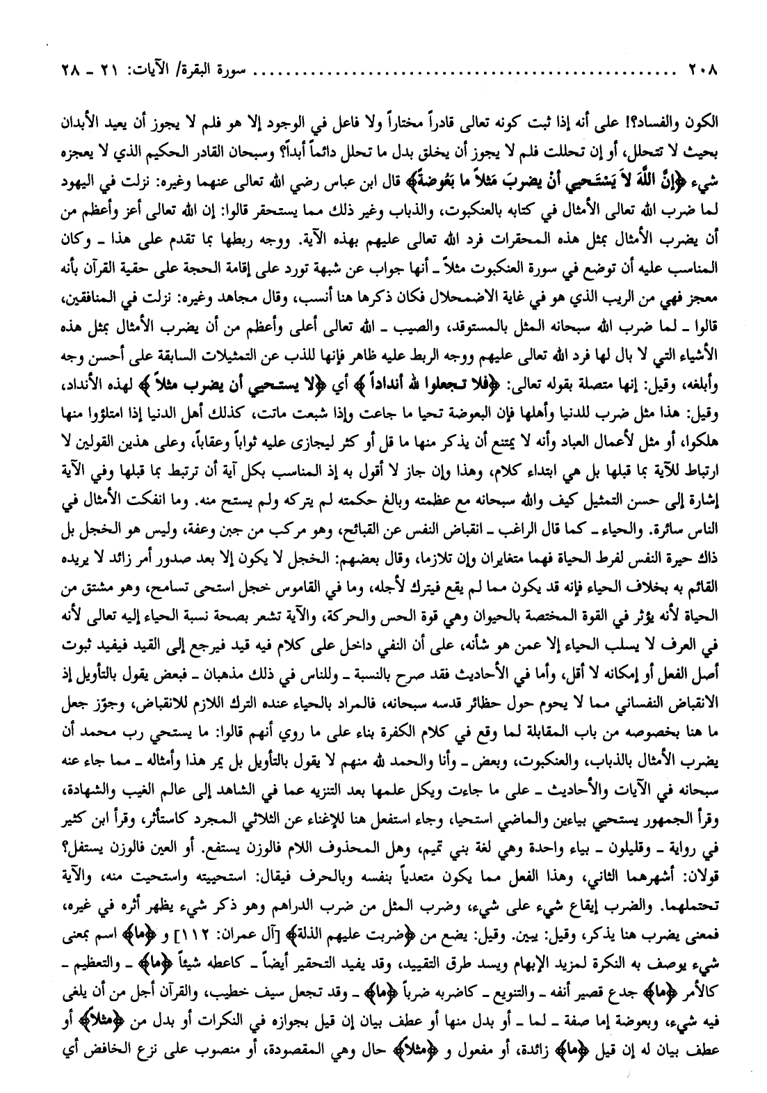 الكون والفساد؟! على أنه إذا ثبت كونه تعالى قادرا مختارا ولا فاعل في الوجود إلا هو فلم لا يجوز أن يعيد الأبدان بحيث لا تتحلل، أو إن تحللت فلم لا يجوز أن يخلق بدل ما تحلل دائما أبدا؟ وسبحان القادر الحكيم الذي لا يعجزه شيء إِنَّ اللَّهَ لا يَسْتَحْيِي أَنْ يَضْرِبَ مَثَلًا ما بَعُوضَةً قال ابن عباس رضي الله تعالى عنهما وغيره: نزلت في اليهود لما ضرب الله تعالى الأمثال في كتابه بالعنكبوت، والذباب وغير ذلك مما يستحقر قالوا: إن الله تعالى أعز وأعظم من أن يضرب الأمثال بمثل هذه المحقرات فرد الله تعالى عليهم بهذه الآية. ووجه ربطها بما تقدم على هذا- وكان المناسب عليه أن توضع في سورة العنكبوت مثلا- أنها جواب عن شبهة تورد على إقامة الحجة على حقية القرآن بأنه معجز فهي من الريب الذي هو في غاية الاضمحلال فكان ذكرها هنا أنسب، وقال مجاهد وغيره: نزلت في المنافقين، قالوا- لما ضرب الله سبحانه المثل بالمستوقد، والصيب- الله تعالى أعلى وأعظم من أن يضرب الأمثال بمثل هذه الأشياء التي لا بال لها فرد الله تعالى عليهم ووجه الربط عليه ظاهر فإنها للذب عن التمثيلات السابقة على أحسن وجه وأبلغه، وقيل: إنها متصلة بقوله تعالى: فَلا تَجْعَلُوا لِلَّهِ أَنْداداً أي لا يَسْتَحْيِي أَنْ يَضْرِبَ مَثَلًا لهذه الأنداد، وقيل: هذا مثل ضرب للدنيا وأهلها فإن البعوضة تحيا ما جاعت وإذا شبعت ماتت، كذلك أهل الدنيا إذا امتلؤوا منها هلكوا، أو مثل لأعمال العباد وأنه لا يمتنع أن يذكر منها ما قل أو كثر ليجازى عليه ثوابا وعقابا، وعلى هذين القولين لا ارتباط للآية بما قبلها بل هي ابتداء كلام، وهذا وإن جاز لا أقول به إذ المناسب بكل آية أن ترتبط بما قبلها وفي الآية إشارة إلى حسن التمثيل كيف والله سبحانه مع عظمته وبالغ حكمته لم يتركه ولم يستح منه. وما انفكت الأمثال في الناس سائرة. والحياء- كما قال الراغب- انقباض النفس عن القبائح، وهو مركب من جبن وعفة، وليس هو الخجل بل ذاك حيرة النفس لفرط الحياة فهما متغايران وإن تلازما، وقال بعضهم: الخجل لا يكون إلا بعد صدور أمر زائد لا يريده القائم به بخلاف الحياء فإنه قد يكون مما لم يقع فيترك لأجله، وما في القاموس خجل استحى تسامح، وهو مشتق من الحياة لأنه يؤثر في القوة المختصة بالحيوان وهي قوة الحس والحركة، والآية تشعر بصحة نسبة الحياء إليه تعالى لأنه في العرف لا يسلب الحياء إلا عمن هو شأنه، على أن النفي داخل على كلام فيه قيد فيرجع إلى القيد فيفيد ثبوت أصل الفعل أو إمكانه لا أقل، وأما في الأحاديث فقد صرح بالنسبة- وللناس في ذلك مذهبان- فبعض يقول بالتأويل إذ الانقباض النفساني مما لا يحوم حول حظائر قدسه سبحانه، فالمراد بالحياء عنده الترك اللازم للانقباض، وجوّز جعل ما هنا بخصوصه من باب المقابلة لما وقع في كلام الكفرة بناء على ما روي أنهم قالوا: ما يستحي رب محمد أن يضرب الأمثال بالذباب، والعنكبوت، وبعض- وأنا والحمد لله منهم لا يقول بالتأويل بل يمر هذا وأمثاله- مما جاء عنه سبحانه في الآيات والأحاديث- على ما جاءت ويكل علمها بعد التنزيه عما في الشاهد إلى عالم الغيب والشهادة، وقرأ الجمهور يستحيي بياءين والماضي استحيا، وجاء استفعل هنا للإغناء عن الثلاثي المجرد كاستأثر، وقرأ ابن كثير في رواية- وقليلون- بياء واحدة وهي لغة بني تميم، وهل المحذوف اللام فالوزن يستفع. أو