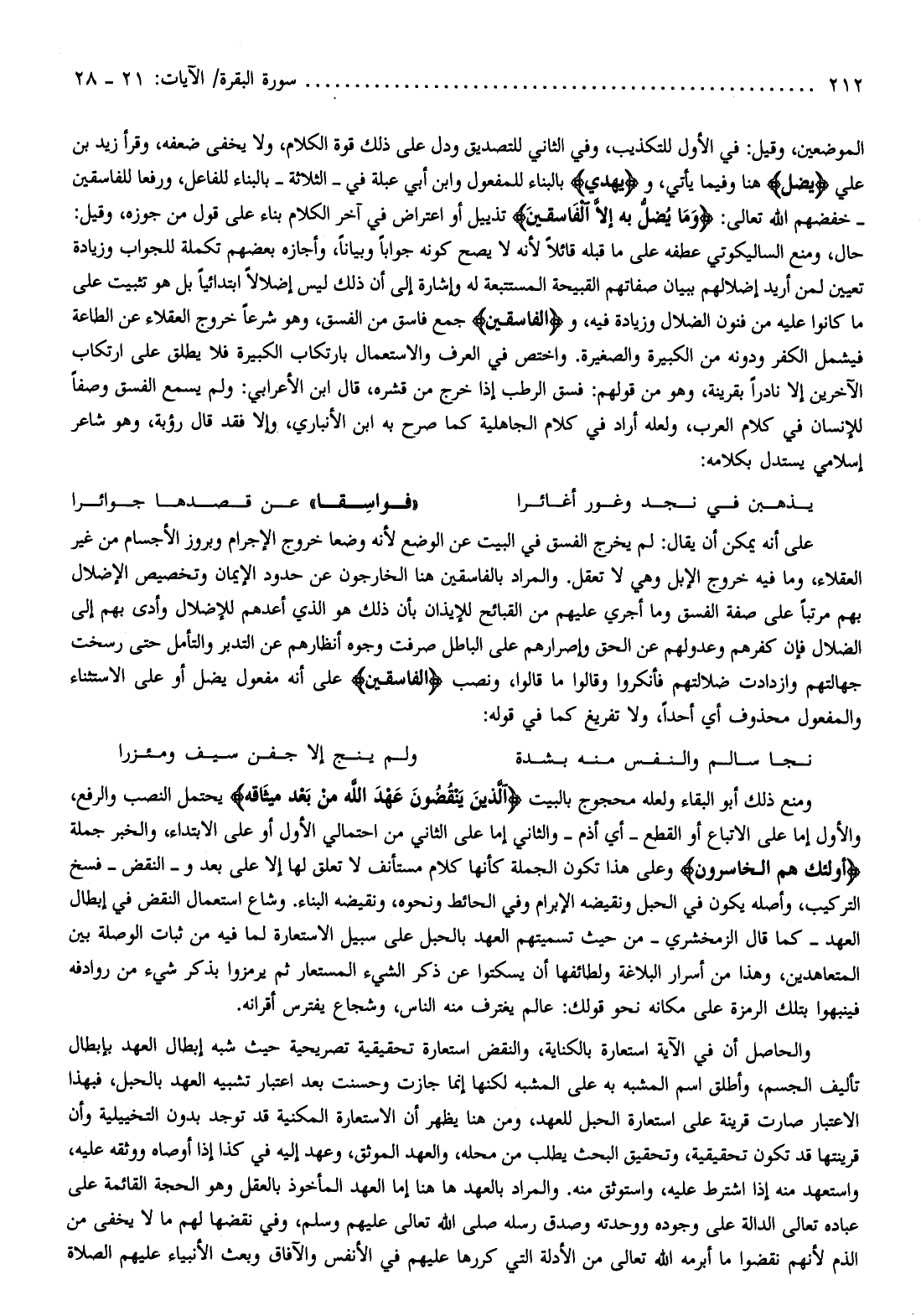 ومنع ذلك أبو البقاء ولعله محجوج بالبيت الَّذِينَ يَنْقُضُونَ عَهْدَ اللَّهِ مِنْ بَعْدِ مِيثاقِهِ يحتمل النصب والرفع، والأول إما على الاتباع أو القطع- أي أذم- والثاني إما على الثاني من احتمالي الأول أو على الابتداء، والخبر جملة أُولئِكَ هُمُ الْخاسِرُونَ وعلى هذا تكون الجملة كأنها كلام مستأنف لا تعلق لها إلا على بعد والنقض- فسخ التركيب، وأصله يكون في الحبل ونقيضه الإبرام وفي الحائط ونحوه، ونقيضه البناء. وشاع استعمال النقض في إبطال العهد- كما قال الزمخشري- من حيث تسميتهم العهد بالحبل على سبيل الاستعارة لما فيه من ثبات الوصلة بين المتعاهدين، وهذا من أسرار البلاغة ولطائفها أن يسكتوا عن ذكر الشيء المستعار ثم يرمزوا بذكر شيء من روادفه فينبهوا بتلك الرمزة على مكانه نحو قولك: عالم يغترف منه الناس، وشجاع يفترس أقرانه.