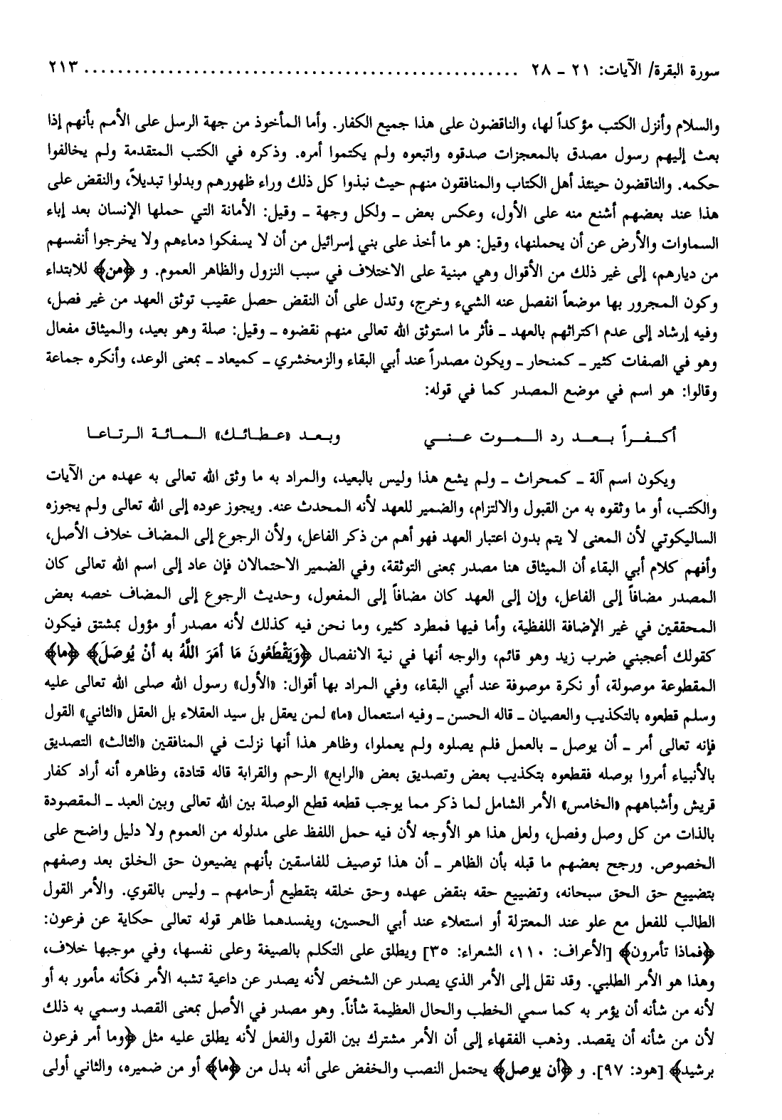 ويكون اسم آلة- كمحراث- ولم يشع هذا وليس بالبعيد، والمراد به ما وثق الله تعالى به عهده من الآيات والكتب، أو ما وثقوه به من القبول والالتزام، والضمير للعهد لأنه المحدث عنه. ويجوز عوده إلى الله تعالى ولم يجوزه الساليكوتي لأن المعنى لا يتم بدون اعتبار العهد فهو أهم من ذكر الفاعل، ولأن الرجوع إلى المضاف خلاف الأصل، وأفهم كلام أبي البقاء أن الميثاق هنا مصدر بمعنى التوثقة، وفي الضمير الاحتمالان فإن عاد إلى اسم الله تعالى كان المصدر مضافا إلى الفاعل، وإن إلى العهد كان مضافا إلى المفعول، وحديث الرجوع إلى المضاف خصه بعض المحققين في غير الإضافة اللفظية، وأما فيها فمطرد كثير، وما نحن فيه كذلك لأنه مصدر أو مؤول بمشتق فيكون كقولك أعجبني ضرب زيد وهو قائم، والوجه أنها في نية الانفصال وَيَقْطَعُونَ ما أَمَرَ اللَّهُ بِهِ أَنْ يُوصَلَ ما المقطوعة موصولة، أو نكرة موصوفة عند أبي البقاء، وفي المراد بها أقوال: «الأول» رسول الله صلى الله تعالى عليه وسلم قطعوه بالتكذيب والعصيان- قاله الحسن- وفيه استعمال «ما» لمن يعقل بل سيد العقلاء بل العقل «الثاني» القول فإنه تعالى أمر- أن يوصل- بالعمل فلم يصلوه ولم يعملوا، وظاهر هذا أنها نزلت في المنافقين «الثالث» التصديق بالأنبياء أمروا بوصله فقطعوه بتكذيب بعض وتصديق بعض «الرابع» الرحم والقرابة قاله قتادة، وظاهره أنه أراد كفار قريش وأشباههم «الخامس» الأمر الشامل لما ذكر مما يوجب قطعه قطع الوصلة بين الله تعالى وبين العبد- المقصودة بالذات من كل وصل وفصل، ولعل هذا هو الأوجه لأن فيه حمل اللفظ على مدلوله من العموم ولا دليل واضح على الخصوص. ورجح بعضهم ما قبله بأن الظاهر- أن هذا توصيف للفاسقين بأنهم يضيعون حق الخلق بعد وصفهم بتضييع حق الحق سبحانه، وتضييع حقه بنقض عهده وحق خلقه بتقطيع أرحامهم- وليس بالقوي. والأمر القول الطالب للفعل مع علو عند المعتزلة أو استعلاء عند أبي الحسين، ويفسدهما ظاهر قوله تعالى حكاية عن فرعون:
