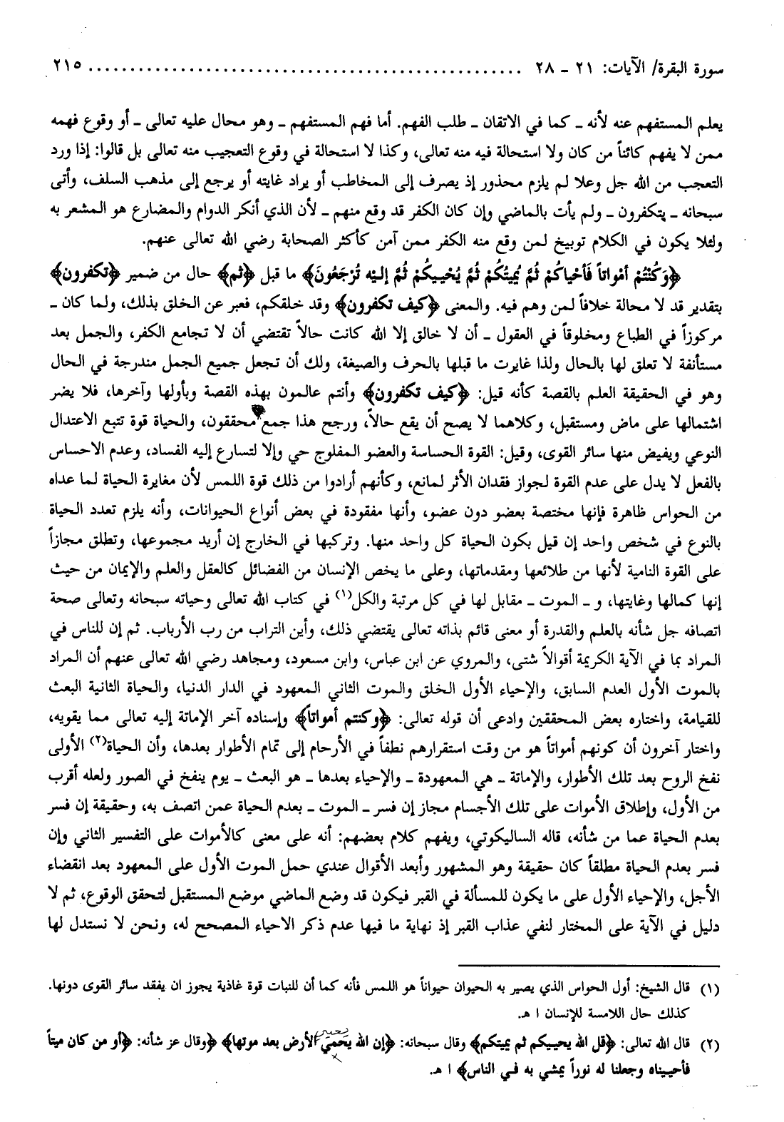 وَكُنْتُمْ أَمْواتاً فَأَحْياكُمْ ثُمَّ يُمِيتُكُمْ ثُمَّ يُحْيِيكُمْ ثُمَّ إِلَيْهِ تُرْجَعُونَ ما قبل ثُمَّ حال من ضمير تَكْفُرُونَ بتقدير قد لا محالة خلافا لمن وهم فيه. والمعنى كَيْفَ تَكْفُرُونَ وقد خلقكم، فعبر عن الخلق بذلك، ولما كان- مركوزا في الطباع ومخلوقا في العقول- أن لا خالق إلا الله كانت حالا تقتضي أن لا تجامع الكفر، والجمل بعد مستأنفة لا تعلق لها بالحال ولذا غايرت ما قبلها بالحرف والصيغة، ولك أن تجعل جميع الجمل مندرجة في الحال وهو في الحقيقة العلم بالقصة كأنه قيل: كَيْفَ تَكْفُرُونَ وأنتم عالمون بهذه القصة وبأولها وآخرها، فلا يضر اشتمالها على ماض ومستقبل، وكلاهما لا يصح أن يقع حالا، ورجح هذا جمع محققون، والحياة قوة تتبع الاعتدال النوعي ويفيض منها سائر القوى، وقيل: القوة الحساسة والعضو المفلوج حي وإلا لتسارع إليه الفساد، وعدم الاحساس بالفعل لا يدل على عدم القوة لجواز فقدان الأثر لمانع، وكأنهم أرادوا من ذلك قوة اللمس لأن مغايرة الحياة لما عداه من الحواس ظاهرة فإنها مختصة بعضو دون عضو، وأنها مفقودة في بعض أنواع الحيوانات، وأنه يلزم تعدد الحياة بالنوع في شخص واحد إن قيل بكون الحياة كل واحد منها. وتركبها في الخارج إن أريد مجموعها، وتطلق مجازا على القوة النامية لأنها من طلائعها ومقدماتها، وعلى ما يخص الإنسان من الفضائل كالعقل والعلم والإيمان من حيث إنها كمالها وغايتها، والموت- مقابل لها في كل مرتبة والكل (¬1) في كتاب الله تعالى وحياته سبحانه وتعالى صحة اتصافه جل شأنه بالعلم والقدرة أو معنى قائم بذاته تعالى يقتضي ذلك، وأين التراب من رب الأرباب. ثم إن للناس في المراد بما في الآية الكريمة أقوالا شتى، والمروي عن ابن عباس، وابن مسعود، ومجاهد رضي الله تعالى عنهم أن المراد بالموت الأول العدم السابق، والإحياء الأول الخلق والموت الثاني المعهود في الدار الدنيا، والحياة الثانية البعث للقيامة، واختاره بعض المحققين وادعى أن قوله تعالى: وَكُنْتُمْ أَمْواتاً وإسناده آخر الإماتة إليه تعالى مما يقويه، واختار آخرون أن كونهم أمواتا هو من وقت استقرارهم نطفا في الأرحام إلى تمام الأطوار بعدها، وأن الحياة (¬2) الأولى نفخ الروح بعد تلك الأطوار، والإماتة- هي المعهودة- والإحياء بعدها- هو البعث- يوم ينفخ في الصور ولعله أقرب من الأول، وإطلاق الأموات على تلك الأجسام مجاز إن فسر- الموت- بعدم الحياة عمن اتصف به، وحقيقة إن فسر بعدم الحياة عما من شأنه، قاله الساليكوتي، ويفهم كلام بعضهم: أنه على معنى كالأموات على التفسير الثاني وإن فسر بعدم الحياة مطلقا كان حقيقة وهو المشهور وأبعد الأقوال عندي حمل الموت الأول على المعهود بعد انقضاء الأجل، والإحياء الأول على ما يكون للمسألة في القبر فيكون قد وضع الماضي موضع المستقبل لتحقق الوقوع، ثم لا دليل في الآية على المختار لنفي عذاب القبر إذ نهاية ما فيها عدم ذكر الاحياء المصحح له، ونحن لا نستدل لها