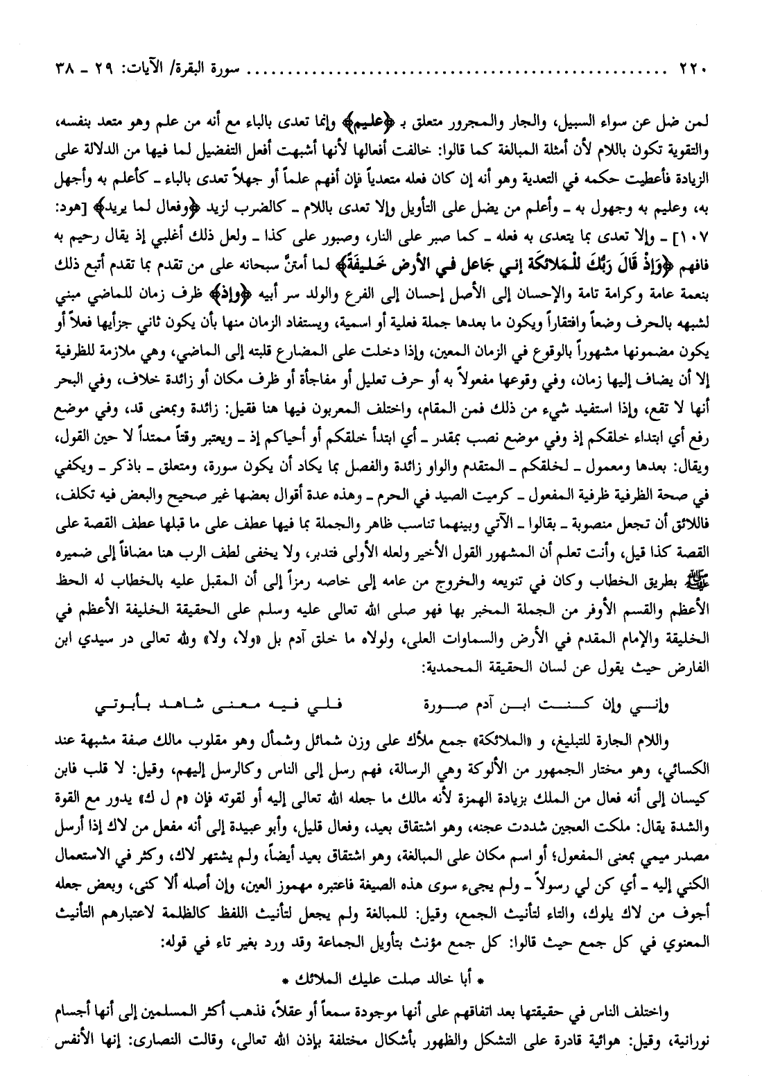 107]- وإلا تعدى بما يتعدى به فعله- كما صبر على النار، وصبور على كذا- ولعل ذلك أغلبي إذ يقال رحيم به فافهم وَإِذْ قالَ رَبُّكَ لِلْمَلائِكَةِ إِنِّي جاعِلٌ فِي الْأَرْضِ خَلِيفَةً لما امتنّ سبحانه على من تقدم بما تقدم أتبع ذلك بنعمة عامة وكرامة تامة والإحسان إلى الأصل إحسان إلى الفرع والولد سر أبيه وَإِذْ ظرف زمان للماضي مبني لشبهه بالحرف وضعا وافتقارا ويكون ما بعدها جملة فعلية أو اسمية، ويستفاد الزمان منها بأن يكون ثاني جزأيها فعلا أو يكون مضمونها مشهورا بالوقوع في الزمان المعين، وإذا دخلت على المضارع قلبته إلى الماضي، وهي ملازمة للظرفية إلا أن يضاف إليها زمان، وفي وقوعها مفعولا به أو حرف تعليل أو مفاجأة أو ظرف مكان أو زائدة خلاف، وفي البحر أنها لا تقع، وإذا استفيد شيء من ذلك فمن المقام، واختلف المعربون فيها هنا فقيل: زائدة وبمعنى قد، وفي موضع رفع أي ابتداء خلقكم إذ وفي موضع نصب بمقدر- أي ابتدأ خلقكم أو أحياكم إذ- ويعتبر وقتا ممتدا لا حين القول، ويقال: بعدها ومعمول- لخلقكم- المتقدم والواو زائدة والفصل بما يكاد أن يكون سورة، ومتعلق- باذكر- ويكفي في صحة الظرفية ظرفية المفعول- كرميت الصيد في الحرم- وهذه عدة أقوال بعضها غير صحيح والبعض فيه تكلف، فاللائق أن تجعل منصوبة- بقالوا- الآتي وبينهما تناسب ظاهر والجملة بما فيها عطف على ما قبلها عطف القصة على القصة كذا قيل، وأنت تعلم أن المشهور القول الأخير ولعله الأولى فتدبر، ولا يخفى لطف الرب هنا مضافا إلى ضميره صلّى الله عليه وسلّم بطريق الخطاب وكان في تنويعه والخروج من عامه إلى خاصه رمزا إلى أن المقبل عليه بالخطاب له الحظ الأعظم والقسم الأوفر من الجملة المخبر بها فهو صلى الله تعالى عليه وسلم على الحقيقة الخليفة الأعظم في الخليقة والإمام المقدم في الأرض والسماوات العلى، ولولاه ما خلق آدم بل «ولا، ولا» ولله تعالى در سيدي ابن الفارض حيث يقول عن لسان الحقيقة المحمدية: