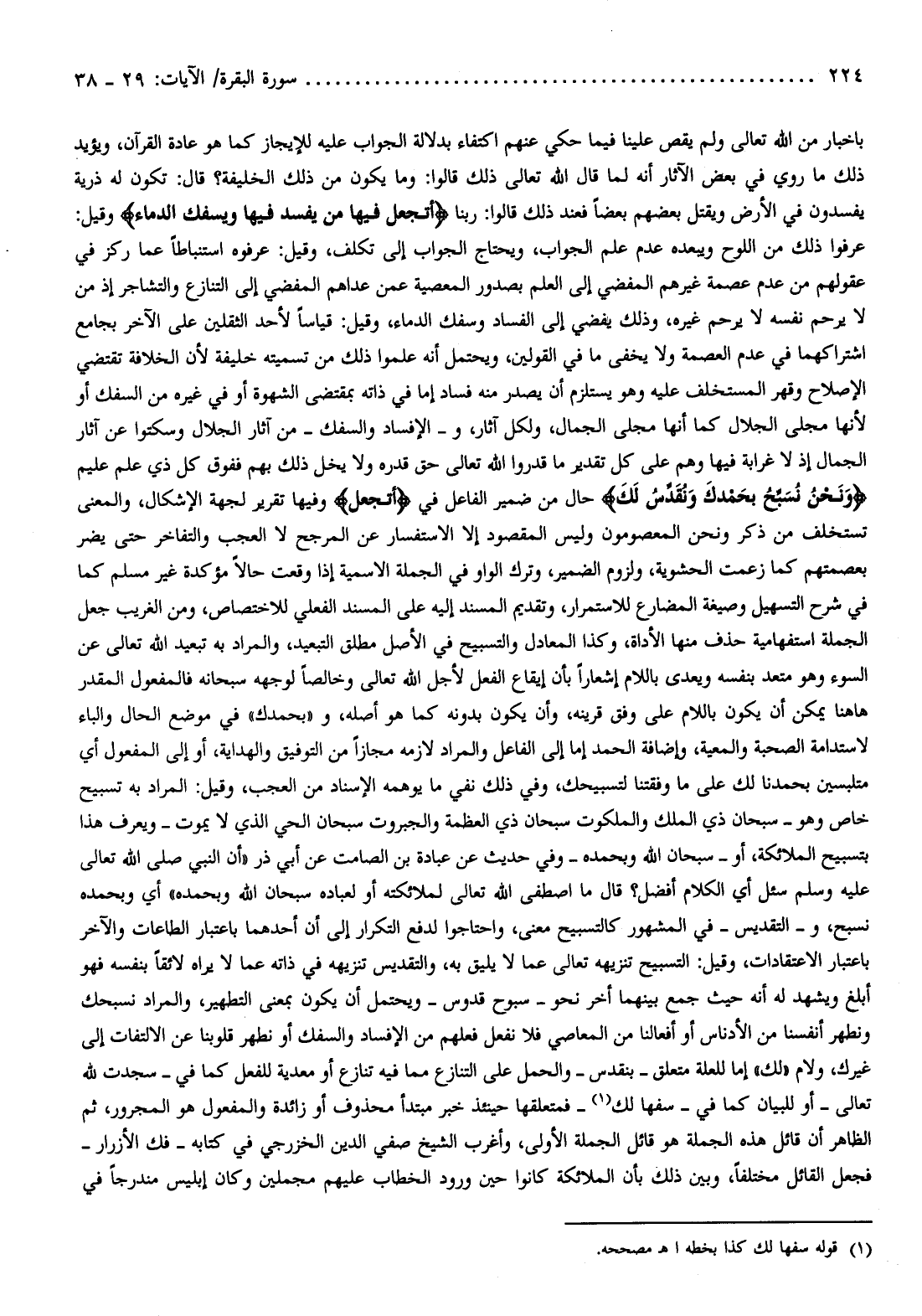 أي وبحمده نسبح، والتقديس- في المشهور كالتسبيح معنى، واحتاجوا لدفع التكرار إلى أن أحدهما باعتبار الطاعات والآخر باعتبار الاعتقادات، وقيل: التسبيح تنزيهه تعالى عما لا يليق به، والتقديس تنزيهه في ذاته عما لا يراه لائقا بنفسه فهو أبلغ ويشهد له أنه حيث جمع بينهما أخر نحو- سبوح قدوس- ويحتمل أن يكون بمعنى التطهير، والمراد نسبحك ونطهر أنفسنا من الأدناس أو أفعالنا من المعاصي فلا نفعل فعلهم من الإفساد والسفك أو نطهر قلوبنا عن الالتفات إلى غيرك، ولام «لك» إما للعلة متعلق- بنقدس- والحمل على التنازع مما فيه تنازع أو معدية للفعل كما في- سجدت لله تعالى- أو للبيان كما في- سفها لك (¬1) - فمتعلقها حينئذ خبر مبتدأ محذوف أو زائدة والمفعول هو المجرور، ثم الظاهر أن قائل هذه الجملة هو قائل الجملة الأولى، وأغرب الشيخ صفي الدين الخزرجي في كتابه- فك الأزرار- فجعل القائل مختلفا، وبين ذلك بأن الملائكة كانوا حين ورود الخطاب عليهم مجملين وكان إبليس مندرجا في