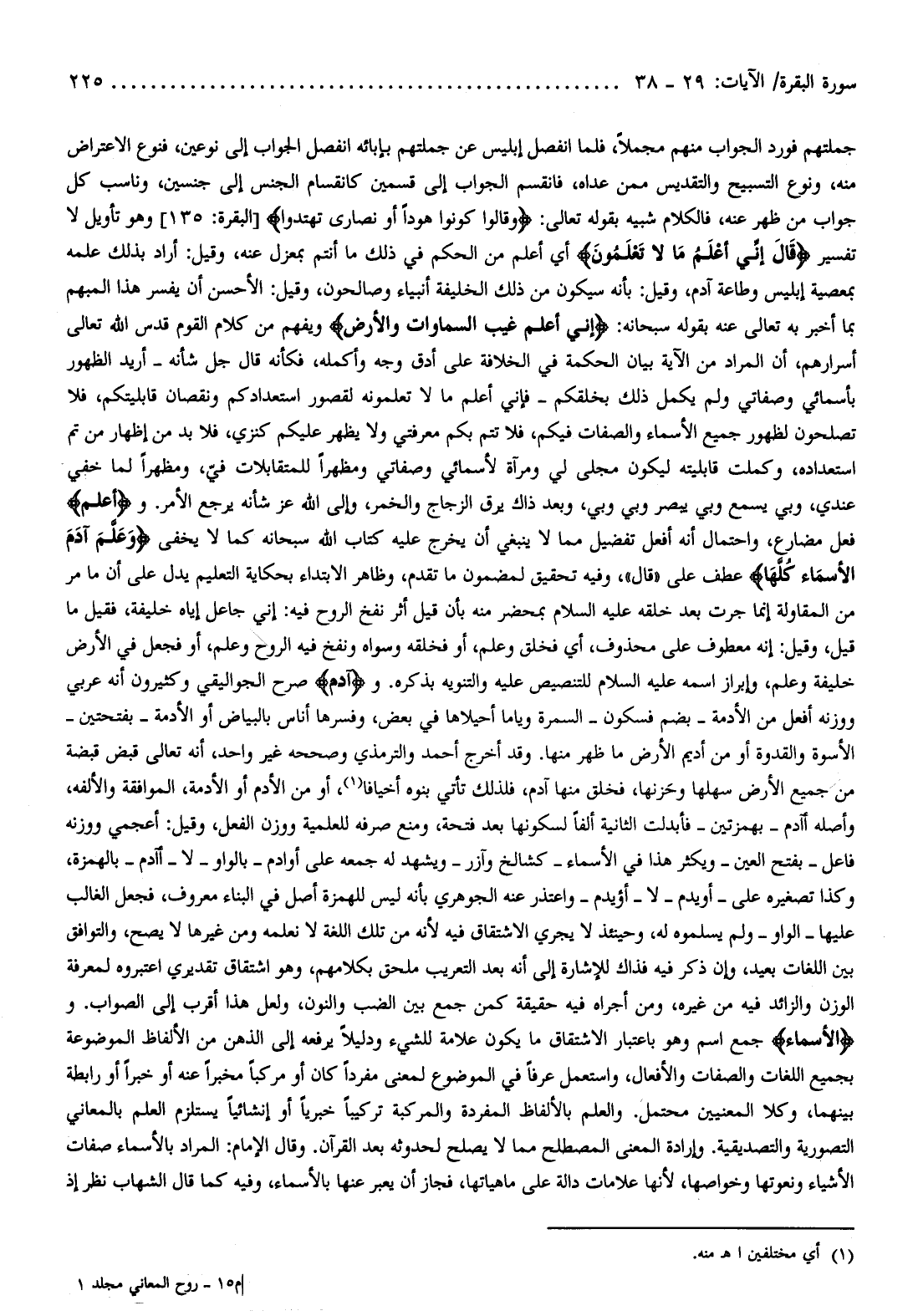 جملتهم فورد الجواب منهم مجملا، فلما انفصل إبليس عن جملتهم بإبائه انفصل الجواب إلى نوعين، فنوع الاعتراض منه، ونوع التسبيح والتقديس ممن عداه، فانقسم الجواب إلى قسمين كانقسام الجنس إلى جنسين، وناسب كل جواب من ظهر عنه، فالكلام شبيه بقوله تعالى: وَقالُوا كُونُوا هُوداً أَوْ نَصارى تَهْتَدُوا [البقرة: 135] وهو تأويل لا تفسير قالَ إِنِّي أَعْلَمُ ما لا تَعْلَمُونَ أي أعلم من الحكم في ذلك ما أنتم بمعزل عنه، وقيل: أراد بذلك علمه بمعصية إبليس وطاعة آدم، وقيل: بأنه سيكون من ذلك الخليفة أنبياء وصالحون، وقيل: الأحسن أن يفسر هذا المبهم بما أخبر به تعالى عنه بقوله سبحانه: إِنِّي أَعْلَمُ غَيْبَ السَّماواتِ وَالْأَرْضِ ويفهم من كلام القوم قدس الله تعالى أسرارهم، أن المراد من الآية بيان الحكمة في الخلافة على أدق وجه وأكمله، فكأنه قال جل شأنه- أريد الظهور بأسمائي وصفاتي ولم يكمل ذلك بخلقكم- فإني أعلم ما لا تعلمونه لقصور استعدادكم ونقصان قابليتكم، فلا تصلحون لظهور جميع الأسماء والصفات فيكم، فلا تتم بكم معرفتي ولا يظهر عليكم كنزي، فلا بد من إظهار من تم استعداده، وكملت قابليته ليكون مجلى لي ومرآة لأسمائي وصفاتي ومظهرا للمتقابلات فيّ، ومظهرا لما خفي عندي، وبي يسمع وبي يبصر وبي وبي، وبعد ذاك يرق الزجاج والخمر، وإلى الله عز شأنه يرجع الأمر. وأَعْلَمُ فعل مضارع، واحتمال أنه أفعل تفضيل مما لا ينبغي أن يخرج عليه كتاب الله سبحانه كما لا يخفى وَعَلَّمَ آدَمَ الْأَسْماءَ كُلَّها عطف على «قال» ، وفيه تحقيق لمضمون ما تقدم، وظاهر الابتداء بحكاية التعليم يدل على أن ما مر من المقاولة إنما جرت بعد خلقه عليه السلام بمحضر منه بأن قيل أثر نفخ الروح فيه: إني جاعل إياه خليفة، فقيل ما قيل، وقيل: إنه معطوف على محذوف، أي فخلق وعلم، أو فخلقه وسواه ونفخ فيه الروح وعلم، أو فجعل في الأرض خليفة وعلم، وإبراز اسمه عليه السلام للتنصيص عليه والتنويه بذكره. وآدَمَ صرح الجواليقي وكثيرون أنه عربي ووزنه أفعل من الأدمة- بضم فسكون- السمرة وياما أحيلاها في بعض، وفسرها أناس بالبياض أو الأدمة- بفتحتين- الأسوة والقدوة أو من أديم الأرض ما ظهر منها. وقد أخرج أحمد والترمذي وصححه غير واحد، أنه تعالى قبض قبضة من جميع الأرض سهلها وحزنها، فخلق منها آدم، فلذلك تأتي بنوه أخيافا (¬1) ، أو من الأدم أو الأدمة، الموافقة والألفه، وأصله أآدم- بهمزتين- فأبدلت الثانية ألفا لسكونها بعد فتحة، ومنع صرفه للعلمية ووزن الفعل، وقيل: أعجمي ووزنه فاعل- بفتح العين- ويكثر هذا في الأسماء- كشالخ وآزر- ويشهد له جمعه على أوادم- بالواو- لا- أآدم- بالهمزة، وكذا تصغيره على- أويدم- لا- أؤيدم- واعتذر عنه الجوهري بأنه ليس للهمزة أصل في البناء معروف، فجعل الغالب عليها- الواو- ولم يسلموه له، وحينئذ لا يجري الاشتقاق فيه لأنه من تلك اللغة لا نعلمه ومن غيرها لا يصح، والتوافق بين اللغات بعيد، وإن ذكر فيه فذاك للإشارة إلى أنه بعد التعريب ملحق بكلامهم، وهو اشتقاق تقديري اعتبروه لمعرفة الوزن والزائد فيه من غيره، ومن أجراه فيه حقيقة كمن جمع بين الضب والنون، ولعل هذا أقرب إلى الصواب. والْأَسْماءَ جمع اسم وهو باعتبار الاشتقاق ما يكون علامة للشيء ودليلا يرفعه إلى الذهن من الألفاظ الموضوعة بجميع اللغات والصفات والأفعال، واستعمل عرفا في الموضوع لمعنى مفردا كان أو مركبا مخبرا عنه أو خبرا أو رابطة بينهما، وكلا المعنيين محتمل. والعلم بالألفاظ المفردة والمركبة تركيبا خبريا أو إنشائيا يستلزم العلم بالمعاني التصورية والتصديقية. وإرادة المعنى المصطلح مما لا يصلح لحدوثه بعد القرآن. وقال الإمام: المراد بالأسماء صفات الأشياء ونعوتها وخواصها، لأنها علامات دالة على ماهياتها، فجاز أن يعبر عنها بالأسماء، وفيه كما قال الشهاب نظر إذ