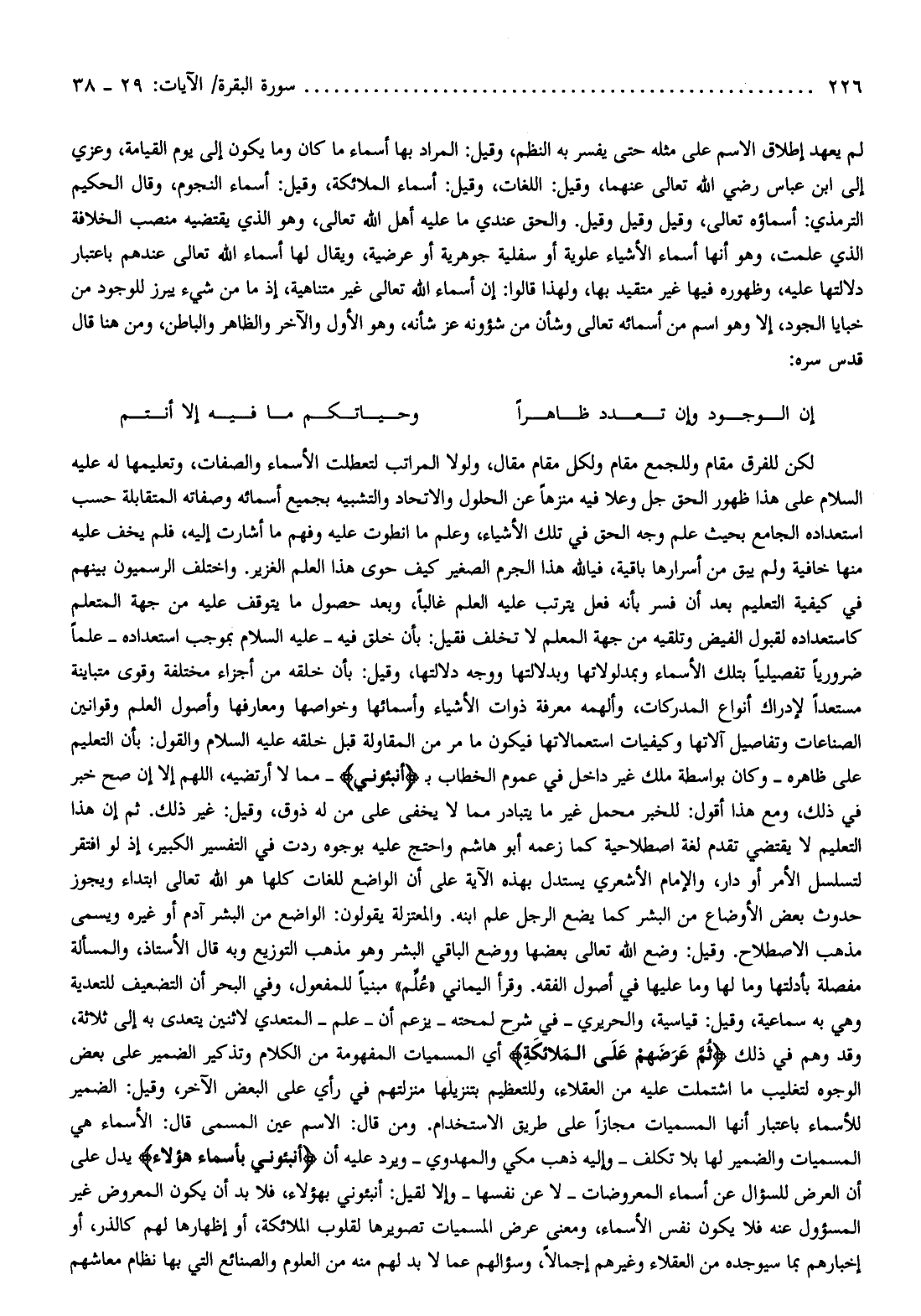 لكن للفرق مقام وللجمع مقام ولكل مقام مقال، ولولا المراتب لتعطلت الأسماء والصفات، وتعليمها له عليه السلام على هذا ظهور الحق جل وعلا فيه منزها عن الحلول والاتحاد والتشبيه بجميع أسمائه وصفاته المتقابلة حسب استعداده الجامع بحيث علم وجه الحق في تلك الأشياء، وعلم ما انطوت عليه وفهم ما أشارت إليه، فلم يخف عليه منها خافية ولم يبق من أسرارها باقية، فيا لله هذا الجرم الصغير كيف حوى هذا العلم الغزير. واختلف الرسميون بينهم في كيفية التعليم بعد أن فسر بأنه فعل يترتب عليه العلم غالبا، وبعد حصول ما يتوقف عليه من جهة المتعلم كاستعداده لقبول الفيض وتلقيه من جهة المعلم لا تخلف فقيل: بأن خلق فيه- عليه السلام- بموجب استعداده- علما ضروريا تفصيليا بتلك الأسماء وبمدلولاتها وبدلالتها ووجه دلالتها، وقيل: بأن خلقه من أجزاء مختلفة وقوى متباينة مستعدا لإدراك أنواع المدركات، وألهمه معرفة ذوات الأشياء وأسمائها وخواصها ومعارفها وأصول العلم وقوانين الصناعات وتفاصيل آلاتها وكيفيات استعمالاتها فيكون ما مر من المقاولة قبل خلقه عليه السلام والقول: بأن التعليم على ظاهره- وكان بواسطة ملك غير داخل في عموم الخطاب ب أَنْبِئُونِي- مما لا أرتضيه، اللهم إلا إن صح خبر في ذلك، ومع هذا أقول: للخبر محمل غير ما يتبادر مما لا يخفى على من له ذوق، وقيل: غير ذلك. ثم إن هذا التعليم لا يقتضي تقدم لغة اصطلاحية كما زعمه أبو هاشم واحتج عليه بوجوه ردت في التفسير الكبير، إذ لو افتقر لتسلسل الأمر أو دار، والإمام الأشعري يستدل بهذه الآية على أن الواضع للغات كلها هو الله تعالى ابتداء ويجوز حدوث بعض الأوضاع من البشر كما يضع الرجل علم ابنه. والمعتزلة يقولون: الواضع من البشر آدم أو غيره ويسمى مذهب الاصطلاح. وقيل: وضع الله تعالى بعضها ووضع الباقي البشر وهو مذهب التوزيع وبه قال الأستاذ، والمسألة مفصلة بأدلتها وما لها وما عليها في أصول الفقه. وقرأ اليماني «علّم» مبنيا للمفعول، وفي البحر أن التضعيف للتعدية وهي به سماعية، وقيل: قياسية، والحريري- في شرح لمحته- يزعم أن- علم- المتعدي لاثنين يتعدى به إلى ثلاثة، وقد وهم في ذلك ثُمَّ عَرَضَهُمْ عَلَى الْمَلائِكَةِ