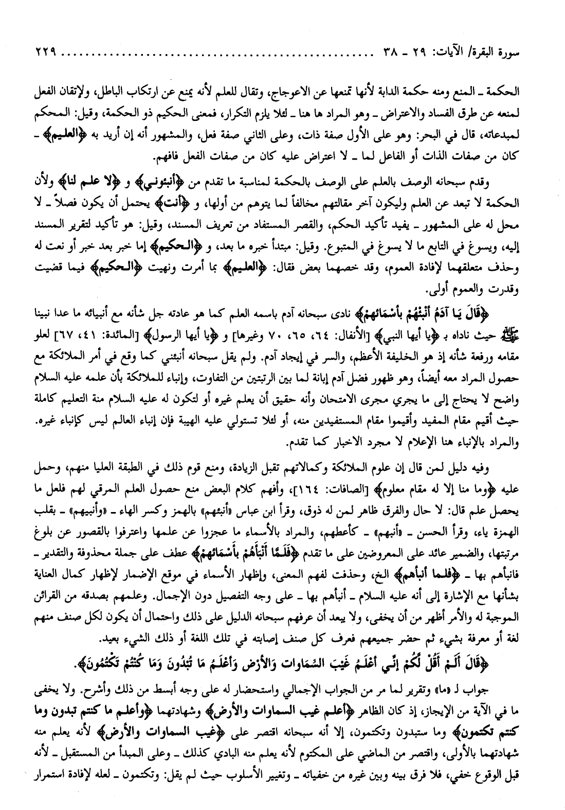 قالَ يا آدَمُ أَنْبِئْهُمْ بِأَسْمائِهِمْ نادى سبحانه آدم باسمه العلم كما هو عادته جل شأنه مع أنبيائه ما عدا نبينا صلّى الله عليه وسلّم حيث ناداه ب يا أَيُّهَا النَّبِيُّ [الأنفال: 64، 65، 70 وغيرها] ويا أَيُّهَا الرَّسُولُ [المائدة: 41، 67] لعلو مقامه ورفعة شأنه إذ هو الخليفة الأعظم، والسر في إيجاد آدم. ولم يقل سبحانه أنبئني كما وقع في أمر الملائكة مع حصول المراد معه أيضا، وهو ظهور فضل آدم إبانة لما بين الرتبتين من التفاوت، وإنباء للملائكة بأن علمه عليه السلام واضح لا يحتاج إلى ما يجري مجرى الامتحان وأنه حقيق أن يعلم غيره أو لتكون له عليه السلام منة التعليم كاملة حيث أقيم مقام المفيد وأقيموا مقام المستفيدين منه، أو لئلا تستولي عليه الهيبة فإن إنباء العالم ليس كإنباء غيره.