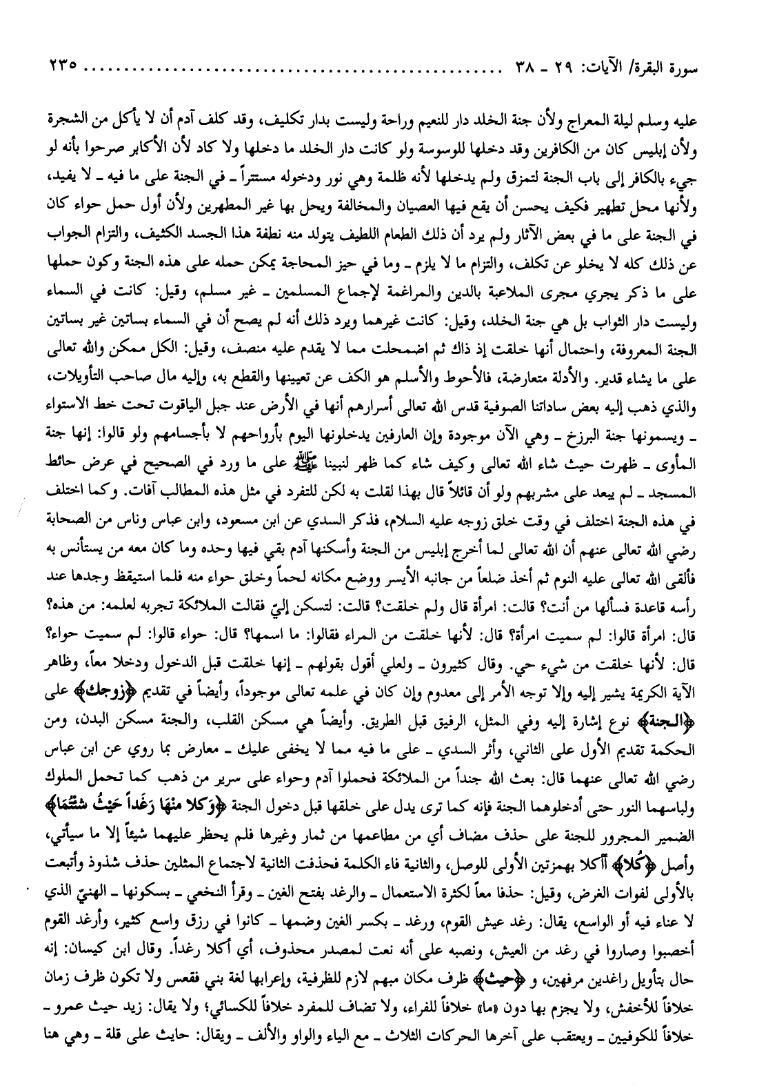 التأويلات، والذي ذهب إليه بعض ساداتنا الصوفية قدس الله تعالى أسرارهم أنها في الأرض عند جبل الياقوت تحت خط الاستواء- ويسمونها جنة البرزخ- وهي الآن موجودة وإن العارفين يدخلونها اليوم بأرواحهم لا بأجسامهم ولو قالوا: إنها جنة المأوى- ظهرت حيث شاء الله تعالى وكيف شاء كما ظهر لنبينا صلّى الله عليه وسلّم على ما ورد في الصحيح في عرض حائط المسجد- لم يبعد على مشربهم ولو أن قائلا قال بهذا لقلت به لكن للتفرد في مثل هذه المطالب آفات. وكما اختلف في هذه الجنة اختلف في وقت خلق زوجه عليه السلام، فذكر السدي عن ابن مسعود، وابن عباس وناس من الصحابة رضي الله تعالى عنهم أن الله تعالى لما أخرج إبليس من الجنة وأسكنها آدم بقي فيها وحده وما كان معه من يستأنس به فألقى الله تعالى عليه النوم ثم أخذ ضلعا من جانبه الأيسر ووضع مكانه لحما وخلق حواء منه فلما استيقظ وجدها عند رأسه قاعدة فسألها من أنت؟ قالت: امرأة قال ولم خلقت؟ قالت: لتسكن إليّ فقالت الملائكة تجربه لعلمه: من هذه؟