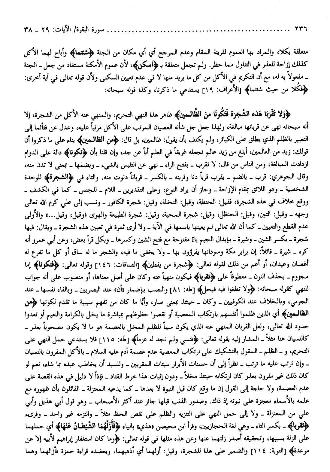 وقيل: التين، وقيل: الحنظل، وقيل: شجرة المحبة، وقيل: شجرة الطبيعة والهوى «وقيل، وقيل ... » والأولى عدم القطع والتعيين- كما أن الله تعالى لم يعينها باسمها في الآية- ولا أرى ثمرة في تعيين هذه الشجرة- ويقال: فيها شجرة- بكسر الشين- وشيرة- بإبدال الجيم ياء مفتوحة مع فتح الشين وكسرها- وبكل قرأ بعض، وعن أبي عمرو أنه كره- شيرة- قائلا: إن برابر مكة وسودانها يقرؤون بها- ولا يخفى ما فيه، والشجر ما له ساق أو كل ما تفرع له أغصان وعيدان، أو أعم من ذلك لقوله تعالى: شَجَرَةً مِنْ يَقْطِينٍ [الصافات: 146] وقوله تعالى: فَتَكُونا إما مجزوم- بحذف النون- معطوفا على تَقْرَبا فيكون منهيا عنه وكان على أصل معناها، أو منصوب على أنه جواب للنهي كقوله سبحانه: وَلا تَطْغَوْا فِيهِ فَيَحِلَّ [طه: 81] والنصب بإضمار «أن» عند البصريين- وبالفاء نفسها- عند الجرمي، وبالخلاف عند الكوفيين- وكان- حينئذ بمعنى صار، وأيّا ما كان من تفهم سببية ما تقدم لكونها مِنَ الظَّالِمِينَ أي الذين ظلموا أنفسهم بارتكاب المعصية أو نقصوا حظوظهم بمباشرة ما يخل بالكرامة والنعيم أو تعدوا حدود الله تعالى، ولعل القربان المنهي عنه الذي يكون سببا للظلم المخل بالعصمة هو ما لا يكون مصحوبا بعذر- كالنسيان هنا مثلا- المشار إليه بقوله تعالى: فَنَسِيَ وَلَمْ نَجِدْ لَهُ عَزْماً [طه: 115] فلا يستدعي حمل النهي على التحريم، والظلم- المقول بالتشكيك على ارتكاب المعصية عدم عصمة آدم عليه السلام- بالأكل المقرون بالنسيان- وإن ترتب عليه ما ترتب- نظرا إلى أن حسنات الأبرار سيئات المقربين- وللسيد أن يخاطب عبده بما شاء، نعم لو كان ذلك غير مقرون بعذر كان ارتكابه حينئذ مخلا- ودون إثبات هذا خرط القتاد- فإذا لا دليل في هذه القصة على عدم العصمة، ولا حاجة إلى القول إن ما وقع كان قبل النبوة لا بعدها- كما يدعيه المعتزلة- القائلون بأن ظهوره مع علمه بالأسماء معجزة على نبوته إذ ذاك. وصدور الذنب قبلها جائز عند أكثر الأصحاب- وهو قول أبي هذيل وأبي علي من المعتزلة- ولا إلى حمل النهي على التنزيه والظلم على نقص الحظ مثلا- والتزمه غير واحد- وقرىء تَقْرَبا- بكسر التاء- وهي لغة الحجازيين، وقرأ ابن محيصن «هذي» بالياء فَأَزَلَّهُمَا الشَّيْطانُ عَنْها أي حملهما على الزلة بسببها، وتحقيقه أصدر زلتهما عنها وعن هذه مثلها في قوله تعالى: وَما كانَ اسْتِغْفارُ إِبْراهِيمَ لِأَبِيهِ إِلَّا عَنْ مَوْعِدَةٍ [التوبة: 114] والضمير على هذا للشجرة، وقيل: أزلهما أي أذهبهما، ويعضده قراءة حمزة فأزالهما وهما