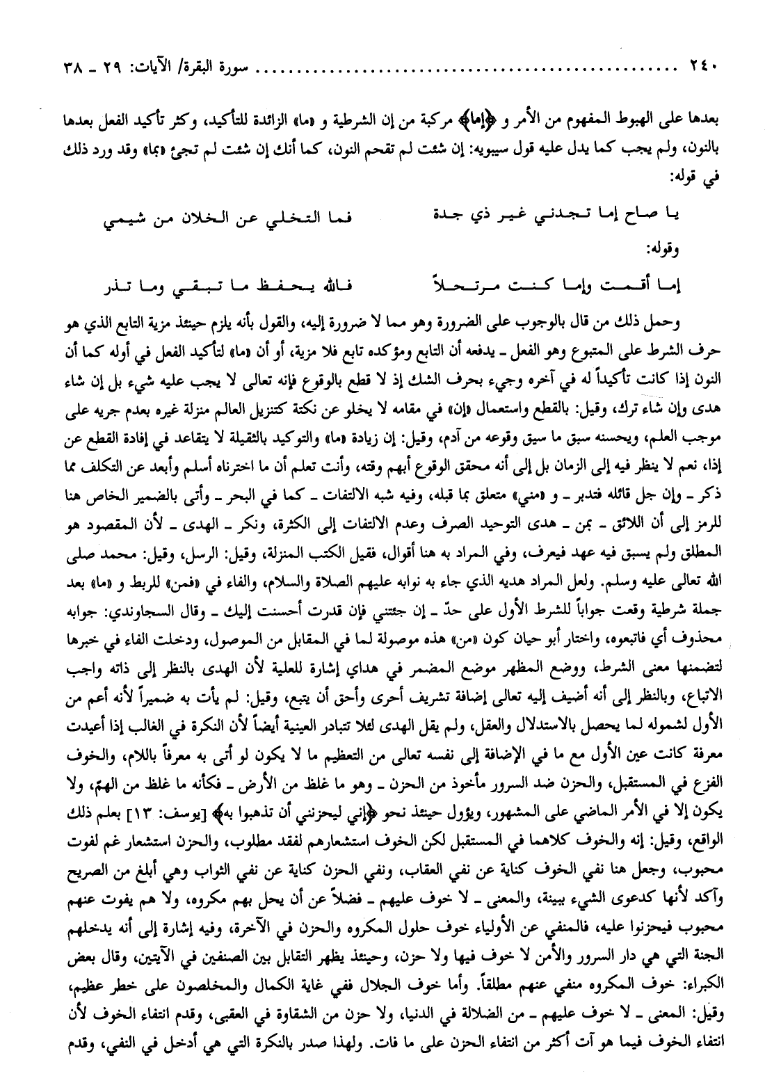وحمل ذلك من قال بالوجوب على الضرورة وهو مما لا ضرورة إليه، والقول بأنه يلزم حينئذ مزية التابع الذي هو حرف الشرط على المتبوع وهو الفعل- يدفعه أن التابع ومؤكده تابع فلا مزية، أو أن «ما» لتأكيد الفعل في أوله كما أن النون إذا كانت تأكيدا له في آخره وجيء بحرف الشك إذ لا قطع بالوقوع فإنّه تعالى لا يجب عليه شيء بل إن شاء هدى وإن شاء ترك، وقيل: بالقطع واستعمال «إن» في مقامه لا يخلو عن نكتة كتنزيل العالم منزلة غيره بعدم جريه على موجب العلم، ويحسنه سبق ما سيق وقوعه من آدم، وقيل: إن زيادة «ما» والتوكيد بالثقيلة لا يتقاعد في إفادة القطع عن إذا، نعم لا ينظر فيه إلى الزمان بل إلى أنه محقق الوقوع أبهم وقته، وأنت تعلم أن ما اخترناه أسلم وأبعد عن التكلف مما ذكر- وإن جل قائله فتدبر- و «مني» متعلق بما قبله، وفيه شبه الالتفات- كما في البحر- وأتى بالضمير الخاص هنا للرمز إلى أن اللائق- بمن- هدى التوحيد الصرف وعدم الالتفات إلى الكثرة، ونكر- الهدى- لأن المقصود هو المطلق ولم يسبق فيه عهد فيعرف، وفي المراد به هنا أقوال، فقيل الكتب المنزلة، وقيل: الرسل، وقيل: محمد صلى الله تعالى عليه وسلم. ولعل المراد هديه الذي جاء به نوابه عليهم الصلاة والسلام، والفاء في «فمن» للربط و «ما» بعد جملة شرطية وقعت جوابا للشرط الأول على حدّ- إن جئتني فإن قدرت أحسنت إليك- وقال السجاوندي: جوابه محذوف أي فاتبعوه، واختار أبو حيان كون «من» هذه موصولة لما في المقابل من الموصول، ودخلت الفاء في خبرها لتضمنها معنى الشرط، ووضع المظهر موضع المضمر في هداي إشارة للعلية لأن الهدى بالنظر إلى ذاته واجب الاتباع، وبالنظر إلى أنه أضيف إليه تعالى إضافة تشريف أحرى وأحق أن يتبع، وقيل: لم يأت به ضميرا لأنه أعم من الأول لشموله لما يحصل بالاستدلال والعقل، ولم يقل الهدى لئلا تتبادر العينية أيضا لأن النكرة في الغالب إذا أعيدت معرفة كانت عين الأول مع ما في الإضافة إلى نفسه تعالى من التعظيم ما لا يكون لو أتى به معرفا باللام، والخوف الفزع في المستقبل، والحزن ضد السرور مأخوذ من الحزن- وهو ما غلظ من الأرض- فكأنه ما غلظ من الهمّ، ولا يكون إلا في الأمر الماضي على المشهور، ويؤول حينئذ نحو إِنِّي لَيَحْزُنُنِي أَنْ تَذْهَبُوا بِهِ [يوسف: 13] بعلم ذلك الواقع، وقيل: إنه والخوف كلاهما في المستقبل لكن الخوف استشعارهم لفقد مطلوب، والحزن استشعار غم لفوت محبوب، وجعل هنا نفي الخوف كناية عن نفي العقاب، ونفي الحزن كناية عن نفي الثواب وهي أبلغ من الصريح وآكد لأنها كدعوى الشيء ببينة، والمعنى- لا خوف عليهم- فضلا عن أن يحل بهم مكروه، ولا هم يفوت عنهم محبوب فيحزنوا عليه، فالمنفي عن الأولياء خوف حلول المكروه والحزن في الآخرة، وفيه إشارة إلى أنه يدخلهم الجنة التي هي دار السرور والأمن لا خوف فيها ولا حزن، وحينئذ يظهر التقابل بين الصنفين في الآيتين، وقال بعض الكبراء: خوف المكروه منفي عنهم مطلقا. وأما خوف الجلال ففي غاية الكمال والمخلصون على خطر عظيم، وقيل: المعنى- لا خوف عليهم- من الضلالة في الدنيا، ولا حزن من الشقاوة في العقبى، وقدم انتفاء الخوف لأن انتفاء الخوف فيما هو آت أكثر من انتفاء الحزن على ما فات. ولهذا صدر بالنكرة التي هي أدخل في النفي، وقدم