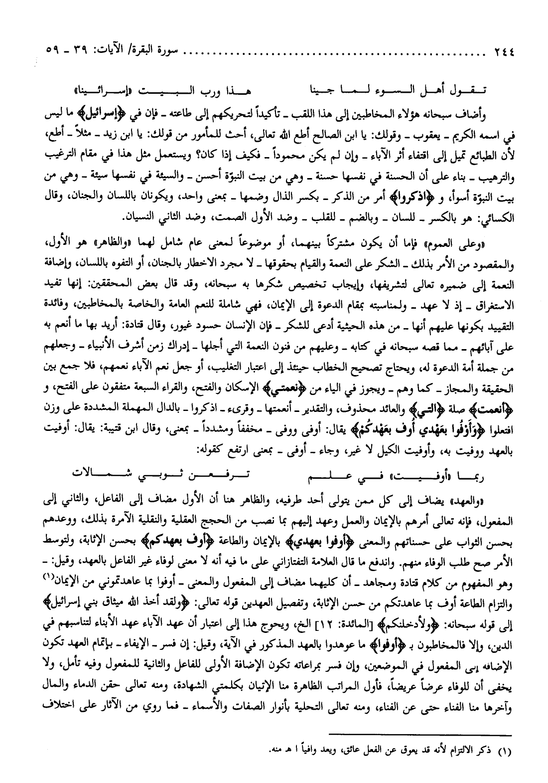 «والعهد» يضاف إلى كل ممن يتولى أحد طرفيه، والظاهر هنا أن الأول مضاف إلى الفاعل، والثاني إلى المفعول، فإنه تعالى أمرهم بالإيمان والعمل وعهد إليهم بما نصب من الحجج العقلية والنقلية الآمرة بذلك، ووعدهم بحسن الثواب على حسناتهم والمعنى أَوْفُوا بِعَهْدِي بالإيمان والطاعة أُوفِ بِعَهْدِكُمْ بحسن الإثابة، ولتوسط الأمر صح طلب الوفاء منهم. واندفع ما قال العلامة التفتازاني على ما فيه أنه لا معنى لوفاء غير الفاعل بالعهد، وقيل:- وهو المفهوم من كلام قتادة ومجاهد- أن كليهما مضاف إلى المفعول والمعنى- أوفوا بما عاهدتموني من الإيمان (¬1) والتزام الطاعة أوف بما عاهدتكم من حسن الإثابة، وتفصيل العهدين قوله تعالى: وَلَقَدْ أَخَذَ اللَّهُ مِيثاقَ بَنِي إِسْرائِيلَ إلى قوله سبحانه: وَلَأُدْخِلَنَّكُمْ [المائدة: 12] إلخ، ويحوج هذا إلى اعتبار أن عهد الآباء عهد الأبناء لتناسبهم في الدين، وإلا فالمخاطبون ب أَوْفُوا ما عوهدوا بالعهد المذكور في الآية، وقيل: إن فسر- الإيفاء- بإتمام العهد تكون الإضافة إلى المفعول في الموضعين، وإن فسر بمراعاته تكون الإضافة الأولى للفاعل والثانية للمفعول وفيه تأمل، ولا يخفى أن للوفاء عرضا عريضا، فأول المراتب الظاهرة منا الإتيان بكلمتي الشهادة، ومنه تعالى حقن الدماء والمال وآخرها منا الفناء حتى عن الفناء، ومنه تعالى التحلية بأنوار الصفات والأسماء- فما روي من الآثار على اختلاف