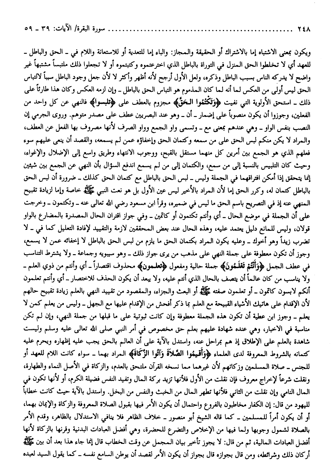 ويكون بمعنى الاشتباه إما بالاشتراك أو الحقيقة والمجاز: والباء إما للتعدية أو للاستعانة واللام في- الحق والباطل- للعهد أي لا تخلطوا الحق المنزل في التوراة بالباطل الذي اخترعتموه وكتبتموه أو لا تجعلوا ذلك ملتبسا مشتبها غير واضح لا يدركه الناس بسبب الباطل وذكره، ولعل الأول أرجح لأنه أظهر وأكثر لا لأن جعل وجود الباطل سببا لالتباس الحق ليس أولى من العكس لما أنه لما كان المذموم هو التباس الحق بالباطل- وإن لزمه العكس وكان هذا طارئا على ذلك- استحق الأولوية التي نفيت وَتَكْتُمُوا الْحَقَّ مجزوم بالعطف على تَلْبِسُوا فالنهي عن كل واحد من الفعلين، وجوزوا أن يكون منصوبا على إضمار- أن- وهو عند البصريين عطف على مصدر متوهم. وروى الجرمي إن النصب بنفس الواو- وهي عندهم بمعنى مع- وتسمى واو الجمع وواو الصرف لأنها مصروف بها الفعل عن العطف، والمراد لا يكن منكم لبس الحق على من سمعه وكتمان الحق وإخفاؤه عمن لم يسمعه، والقصد أن ينعى عليهم سوء فعلهم الذي هو الجمع بين أمرين كل منهما مستقل بالقبح، ووجوب الانتهاء وطريق واسع إلى الإضلال والإغواء، وحيث كان التلبيس بالنسبة إلى من سمع، والكتمان إلى من لم يسمع اندفع السؤال بأن النهي عن الجمع بين شيئين إنما يتحقق إذا أمكن افتراقهما في الجملة وليس- لبس الحق بالباطل مع كتمان الحق كذلك- ضرورة أن لبس الحق بالباطل كتمان له، وكرر الحق إما لأن المراد بالأخير ليس عين الأول بل هو نعت النبي صلّى الله عليه وسلّم خاصة وإما لزيادة تقبيح المنهي عنه إذ في التصريح باسم الحق ما ليس في ضميره، وقرأ ابن مسعود رضي الله تعالى عنه- وتكتمون- وخرجت على أن الجملة في موضع الحال- أي وأنتم تكتمون أو كاتمين- وفي جواز اقتران الحال المصدرة بالمضارع بالواو قولان، وليس للمانع دليل يعتمد عليه، وهذه الحال عند بعض المحققين لازمة والتقييد لإفادة التعليل كما في- لا تضرب زيدا وهو أخوك- وعليه يكون المراد بكتمان الحق ما يلزم من لبس الحق بالباطل لا إخفائه عمن لا يسمع، وجوز أن تكون معطوفة على جملة النهي على مذهب من يرى جواز ذلك- وهو سيبويه وجماعة- ولا يشترط التناسب في عطف الجمل وَأَنْتُمْ تَعْلَمُونَ جملة حالية ومفعول تَعْلَمُونَ محذوف اقتصارا- أي وأنتم من ذوي العلم- ولا يناسب من كان عالما أن يتصف بالحال الذي أنتم عليه، ولا يبعد أن يكون الحذف للاختصار- أي وأنتم تعلمون أنكم لابسون كاتمون- أو تعلمون صفته صلّى الله عليه وسلّم أو البعث والجزاء، والمقصود من تقييد النهي بالعلم زيادة تقبيح حالهم لأن الإقدام على هاتيك الأشياء القبيحة مع العلم بما ذكر أفحش من الإقدام عليها مع الجهل- وليس من يعلم كمن لا يعلم- وجوز ابن عطية أن تكون هذه الجملة معطوفة وإن كانت ثبوتية على ما قبلها من جملة النهي، وإن لم تكن مناسبة في الاخبار، وهي عنده شهادة عليهم بعلم حق مخصوص في أمر النبي صلى الله تعالى عليه وسلم وليست شاهدة بالعلم على الإطلاق إذ هم بمراحل عنه، واستدل بالآية على أن العالم بالحق يجب عليه إظهاره ويحرم عليه كتمانه بالشروط المعروفة لدى العلماء وَأَقِيمُوا الصَّلاةَ وَآتُوا الزَّكاةَ المراد بهما- سواء كانت اللام للعهد أو للجنس- صلاة المسلمين وزكاتهم لأن غيرهما مما نسخه القرآن ملتحق بالعدم، والزكاة في الأصل النماء والطهارة، ونقلت شرعا لإخراج معروف فإن نقلت من الأول فلأنها تزيد بركة المال وتفيد النفس فضيلة الكرم، أو لأنها تكون في المال النامي وإن نقلت من الثاني فلأنها تطهر المال من الخبث والنفس من البخل. واستدل بالآية حيث كانت خطابا لليهود من قال: إن الكفار مخاطبون بالفروع واحتمال أن يكون الأمر فيها بقبول الصلاة المعروفة والزكاة والإيمان بهما، أو أن يكون أمرا للمسلمين- كما قاله الشيخ أبو منصور- خلاف الظاهر فلا ينافي الاستدلال بالظاهر، وقدم الأمر بالصلاة لشمول وجوبها ولما فيها من الإخلاص والتضرع للحضرة، وهي أفضل العبادات البدنية وقرنها بالزكاة لأنها أفضل العبادات المالية، ثم من قال: لا يجوز تأخير بيان ا