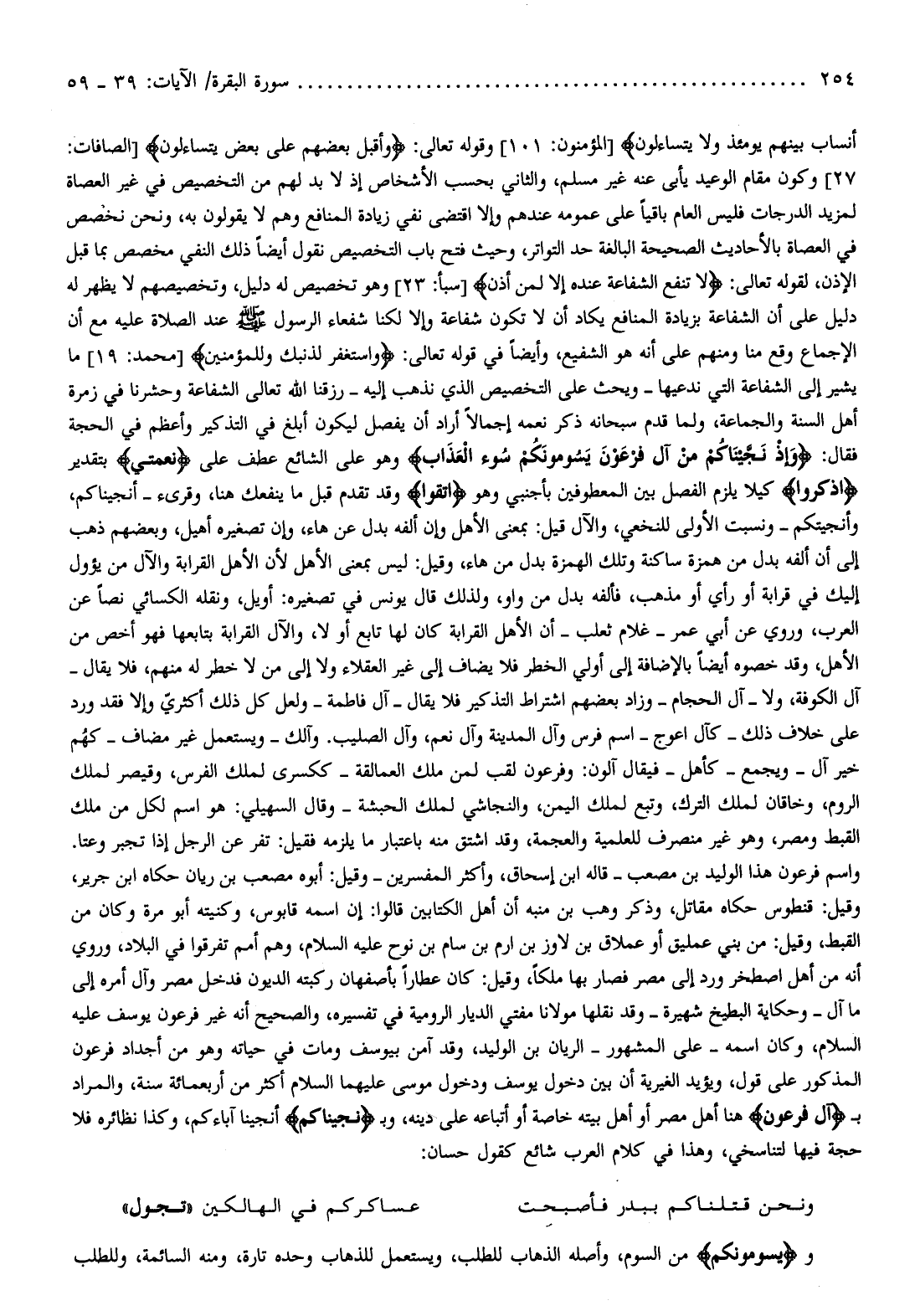 27] وكون مقام الوعيد يأبى عنه غير مسلم، والثاني بحسب الأشخاص إذ لا بد لهم من التخصيص في غير العصاة لمزيد الدرجات فليس العام باقيا على عمومه عندهم وإلا اقتضى نفي زيادة المنافع وهم لا يقولون به، ونحن نخصص في العصاة بالأحاديث الصحيحة البالغة حد التواتر، وحيث فتح باب التخصيص نقول أيضا ذلك النفي مخصص بما قبل الإذن، لقوله تعالى: لا تَنْفَعُ الشَّفاعَةُ عِنْدَهُ إِلَّا لِمَنْ أَذِنَ [سبأ: 23] وهو تخصيص له دليل، وتخصيصهم لا يظهر له دليل على أن الشفاعة بزيادة المنافع يكاد أن لا تكون شفاعة وإلا لكنا شفعاء الرسول صلّى الله عليه وسلم عند الصلاة عليه مع أن الإجماع وقع منا ومنهم على أنه هو الشفيع، وأيضا في قوله تعالى: وَاسْتَغْفِرْ لِذَنْبِكَ وَلِلْمُؤْمِنِينَ [محمد: 19] ما يشير إلى الشفاعة التي ندعيها- ويحث على التخصيص الذي نذهب إليه- رزقنا الله تعالى الشفاعة وحشرنا في زمرة أهل السنة والجماعة، ولما قدم سبحانه ذكر نعمه إجمالا أراد أن يفصل ليكون أبلغ في التذكير وأعظم في الحجة فقال: وَإِذْ نَجَّيْناكُمْ مِنْ آلِ فِرْعَوْنَ يَسُومُونَكُمْ سُوءَ الْعَذابِ وهو على الشائع عطف على نِعْمَتِيَ بتقدير اذْكُرُوا كيلا يلزم الفصل بين المعطوفين بأجنبي وهو اتَّقُوا وقد تقدم قبل ما ينفعك هنا، وقرىء- أنجيناكم، وأنجيتكم- ونسبت الأولى للنخعي، والآل قيل: بمعنى الأهل وإن ألفه بدل عن هاء، وإن تصغيره أهيل، وبعضهم ذهب إلى أن ألفه بدل من همزة ساكنة وتلك الهمزة بدل من هاء، وقيل: ليس بمعنى الأهل لأن الأهل القرابة والآل من يؤول إليك في قرابة أو رأي أو مذهب، فألفه بدل من واو، ولذلك قال يونس في تصغيره: أويل، ونقله الكسائي نصا عن العرب، وروي عن أبي عمر- غلام ثعلب- أن الأهل القرابة كان لها تابع أو لا، والآل القرابة بتابعها فهو أخص من الأهل، وقد خصوه أيضا بالإضافة إلى أولي الخطر فلا يضاف إلى غير العقلاء ولا إلى من لا خطر له منهم، فلا يقال- آل الكوفة، ولا- آل الحجام- وزاد بعضهم اشتراط التذكير فلا يقال- آل فاطمة- ولعل كل ذلك أكثريّ وإلا فقد ورد على خلاف ذلك- كآل اعوج- اسم فرس وآل المدينة وآل نعم، وآل الصليب. وآلك- ويستعمل غير مضاف- كهم خير آل- ويجمع- كأهل- فيقال آلون: وفرعون لقب لمن ملك العمالقة- ككسرى لملك الفرس، وقيصر لملك الروم، وخاقان لملك الترك، وتبع لملك اليمن، والنجاشي لملك الحبشة- وقال السهيلي: هو اسم لكل من ملك القبط ومصر، وهو غير منصرف للعلمية والعجمة، وقد اشتق منه باعتبار ما يلزمه فقيل: تفر عن الرجل إذا تجبر وعتا.
