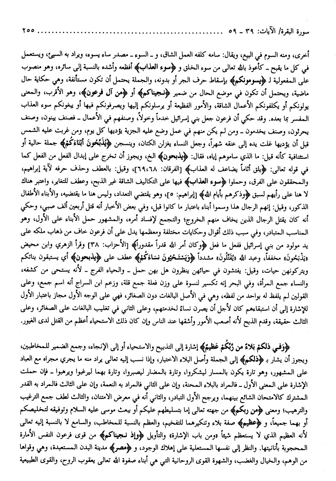 أخرى، ومنه السوم في البيع، ويقال: سامه كلفه العمل الشاق، والسوء- مصدر ساء يسوء، ويراد به السيئ، ويستعمل في كل ما يقبح- كأعوذ بالله تعالى من سوء الخلق وسُوءَ الْعَذابِ أفظعه وأشده بالنسبة إلى سائره، وهو منصوب على المفعولية ل يَسُومُونَكُمْ بإسقاط حرف الجر أو بدونه، والجملة يحتمل أن تكون مستأنفة، وهي حكاية حال ماضية، ويحتمل أن تكون في موضع الحال من ضمير نَجَّيْناكُمْ أو مِنْ آلِ فِرْعَوْنَ، وهو الأقرب، والمعنى يولونكم أو يكلفونكم الأعمال الشاقة، والأمور الفظيعة أو يرسلونكم إليها ويصرفونكم فيها أو يبغونكم سوء العذاب المفسر بما بعده. وقد حكي أن فرعون جعل بني إسرائيل خدما وخولا، وصنفهم في الأعمال- فصنف يبنون، وصنف يحرثون، وصنف يخدمون- ومن لم يكن منهم في عمل وضع عليه الجزية يؤديها كل يوم، ومن غربت عليه الشمس قبل أن يؤديها غلت يده إلى عنقه شهرا، وجعل النساء يغزلن الكتان، وينسجن يُذَبِّحُونَ أَبْناءَكُمْ جملة حالية أو استئنافية كأنه قيل: ما الذي ساموهم إياه، فقال: يُذَبِّحُونَ إلخ، ويجوز أن تخرج على إبدال الفعل من الفعل كما في قوله تعالى: يَلْقَ أَثاماً يُضاعَفْ لَهُ الْعَذابُ [الفرقان: 68، 69] ، وقيل: بالعطف وحذف حرفه لآية إبراهيم، والمحققون على الفرق، وحملوا سُوءَ الْعَذابِ فيها على التكاليف الشاقة غير الذبح، وعطف للتغاير، واعتبر هناك لا هنا على رأيهم لسبق وَذَكِّرْهُمْ بِأَيَّامِ اللَّهِ [إبراهيم: 5] ، وهو يقتضي التعداد، وليس هنا ما يقتضيه، والأبناء الأطفال الذكور، وقيل: إنهم الرجال هذا وسموا أبناء باعتبار ما كانوا قبل، وفي بعض الأخبار أنه قتل أربعين ألف صبي، وحكي أنه كان يقتل الرجال الذين يخاف منهم الخروج والتجمع لإفساد أمره، والمشهور حمل الأبناء على الأول، وهو المناسب المتبادر، وفي سبب ذلك أقوال وحكايات مختلفة ومعظمها يدل على أن فرعون خاف من ذهاب ملكه على يد مولود من بني إسرائيل ففعل ما فعل وَكانَ أَمْرُ اللَّهِ قَدَراً مَقْدُوراً [الأحزاب: 38] وقرأ الزهري وابن محيض «يذبحون» مخففا، وعبد الله «يقتّلون» مشددا وَيَسْتَحْيُونَ نِساءَكُمْ عطف على يُذَبِّحُونَ أي يستبقون بناتكم ويتركونهن حيات، وقيل: يفتشون في حيائهن ينظرون هل بهن حمل- والحياء الفرج- لأنه يستحى من كشفه، والنساء جمع المرأة، وفي البحر إنه تكسير لنسوة على وزن فعلة جمع قلة، وزعم ابن السراج أنه اسم جمع، وعلى القولين لم يلفظ له بواحد من لفظه، وهي في الأصل البالغات دون الصغائر، فهي على الوجه الأول مجاز باعتبار الأول للإشارة إلى أن استبقاءهم كان لأجل أن يصرن نساء لخدمتهم، وعلى الثاني في تغليب البالغات على الصغائر، وعلى الثالث حقيقة، وقدم الذبح لأنه أصعب الأمور وأشقها عند الناس وإن كان ذلك الاستحياء أعظم من القتل لدى الغيور.