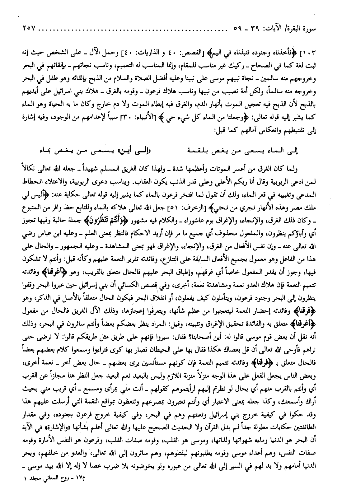 103] فَأَخَذْناهُ وَجُنُودَهُ فَنَبَذْناهُمْ فِي الْيَمِّ [القصص: 40 والذاريات: 40] وحمل الآل- على الشخص حيث إنه ثبت لغة كما في الصحاح- ركيك غير مناسب للمقام، وإنما المناسب له التعميم، وناسب نجاتهم- بإلقائهم في البحر وخروجهم منه سالمين- نجاة نبيهم موسى على نبينا وعليه أفضل الصلاة والسلام من الذبح بإلقائه وهو طفل في البحر وخروجه منه سالما، ولكل أمة نصيب من نبيها وناسب هلاك فرعون- وقومه بالغرق- هلاك بني إسرائيل على أيديهم بالذبح لأن الذبح فيه تعجيل الموت بأنهار الدم، والغرق فيه إبطاء الموت ولا دم خارج وكان ما به الحياة وهو الماء كما يشير إليه قوله تعالى: وَجَعَلْنا مِنَ الْماءِ كُلَّ شَيْءٍ حَيٍّ [الأنبياء: 30] سببا لإعدامهم من الوجود، وفيه إشارة إلى تقنيطهم وانعكاس آمالهم كما قيل: