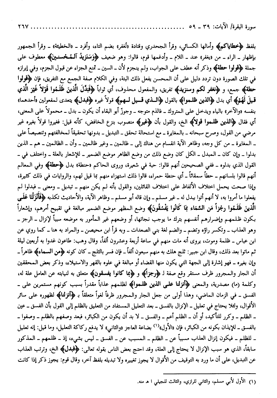 بلفظ خَطاياكُمْ وأمالها الكسائي، وقرأ الجحدري وقتادة «تغفر» بضم التاء، وأفرد- «الخطيئة» - وقرأ الجمهور بإظهار- الراء- من «يغفر» عند- اللام- وأدغمها قوم، قالوا: وهو ضعيف وَسَنَزِيدُ الْمُحْسِنِينَ معطوف على جملة قُولُوا حِطَّةٌ وذكر أنه عطف على الجواب، ولم ينجزم لأن- السين- تمنع الجزاء عن قبول الجزم، وفي إبرازه في تلك الصورة دون تردد دليل على أن المحسن يفعل ذلك البتة، وفي الكلام صفة الجمع مع التفريق، فإن قُولُوا حِطَّةٌ جمع، ونَغْفِرْ لَكُمْ خَطاياكُمْ وَسَنَزِيدُ تفريق، والمفعول محذوف، أي ثوابا فَبَدَّلَ الَّذِينَ ظَلَمُوا قَوْلًا غَيْرَ الَّذِي قِيلَ لَهُمْ أي بدل الَّذِينَ ظَلَمُوا بالقول الَّذِي قِيلَ لَهُمْ قولا غيره فَبَدَّلَ يتعدى لمفعولين «أحدهما» بنفسه «والآخر» بالياء ويدخل على المتروك- فالذم متوجه- وجوزّ أبو البقاء أن يكون- بدل- محمولا على المعنى، أي فقال الَّذِينَ ظَلَمُوا قَوْلًا إلخ، والقول بأن غَيْرَ منصوب بنزع الخافض، كأنه قيل: فغيروا قولا بغيره غير مرضي من القول، وصرح سبحانه- بالمغايرة- مع استحالة تحقق- التبديل- بدونها تحقيقا لمخالفتهم وتنصيصا على- المغايرة- من كل وجه، وظاهر الآية انقسام من هناك إلى- ظالمين- وغير ظالمين- وأن- الظالمين- هم- الذين بدلوا- وإن كان- المبدل- الكل كان وضع ذلك من وضع الظاهر موضع الضمير- للإشعار بالعلة- واختلف في- القول الذي بدلوه- ففي الصحيحين أنهم قالوا: حبة في شعيرة، وروى الحاكم «حنطة» بدل حِطَّةٌ وفي المعالم أنهم قالوا بلسانهم- حطا سمقاثا- أي حنطة حمراء، قالوا ذلك استهزاء منهم بما قيل لهم، والروايات في ذلك كثيرة، وإذا صحت يحمل اختلاف الألفاظ على اختلاف القائلين، والقول بأنه لم يكن منهم- تبديل- ومعنى- فبدلوا لم يفعلوا ما أمروا به، لا أنهم أتوا ببدل له- غير مسلم- وإن قاله أبو مسلم- وظاهر الآية، والأحاديث تكذبه فَأَنْزَلْنا عَلَى الَّذِينَ ظَلَمُوا رِجْزاً مِنَ السَّماءِ بِما كانُوا يَفْسُقُونَ وضع المظهر موضع الضمير مبالغة في تقبيح أمرهم، وإشعارا بكون ظلمهم وإضرارهم أنفسهم بترك ما يوجب نجاتها، أو وضعهم غير المأمور به موضعه سببا لإنزال- الرجز- وهو العذاب- وتكسر راؤه وتضم- والضم لغة بني الصعدات- وبه قرأ ابن محيصن- والمراد به هنا- كما روي عن ابن عباس- ظلمة وموت، يروى أنه مات منهم في ساعة أربعة وعشرون ألفا، وقال وهب: طاعون غدوا به أربعين ليلة ثم