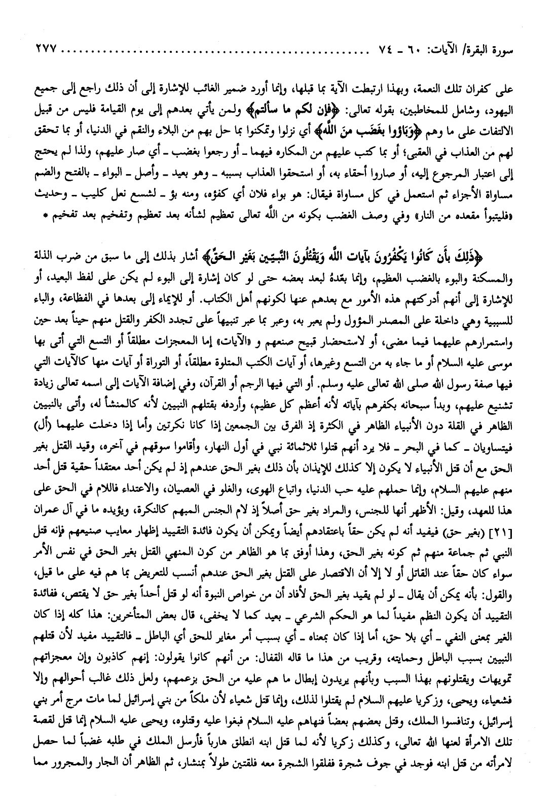 وفي وصف الغضب بكونه من الله تعالى تعظيم لشأنه بعد تعظيم وتفخيم بعد تفخيم ذلِكَ بِأَنَّهُمْ كانُوا يَكْفُرُونَ بِآياتِ اللَّهِ وَيَقْتُلُونَ النَّبِيِّينَ بِغَيْرِ الْحَقِّ أشار بذلك إلى ما سبق من ضرب الذلة والمسكنة والبوء بالغضب العظيم، وإنما بعّده لبعد بعضه حتى لو كان إشارة إلى البوء لم يكن على لفظ البعيد، أو للإشارة إلى أنهم أدركتهم هذه الأمور مع بعدهم عنها لكونهم أهل الكتاب. أو للإيماء إلى بعدها في الفظاعة، والباء للسببية وهي داخلة على المصدر المؤول ولم يعبر به، وعبر بما عبر تنبيها على تجدد الكفر والقتل منهم حينا بعد حين واستمرارهم عليهما فيما مضى، أو لاستحضار قبيح صنعهم و «الآيات» إما المعجزات مطلقا أو التسع التي أتى بها موسى عليه السلام أو ما جاء به من التسع وغيرها، أو آيات الكتب المتلوة مطلقا، أو التوراة أو آيات منها كالآيات التي فيها صفة رسول الله صلى الله تعالى عليه وسلم. أو التي فيها الرجم أو القرآن، وفي إضافة الآيات إلى اسمه تعالى زيادة تشنيع عليهم، وبدأ سبحانه بكفرهم بآياته لأنه أعظم كل عظيم، وأردفه بقتلهم النبيين لأنه كالمنشأ له، وأتى بالنبيين الظاهر في القلة دون الأنبياء الظاهر في الكثرة إذ الفرق بين الجمعين إذا كانا نكرتين وأما إذا دخلت عليهما (أل) فيتساويان- كما في البحر- فلا يرد أنهم قتلوا ثلاثمائة نبي في أول النهار، وأقاموا سوقهم في آخره، وقيد القتل بغير الحق مع أن قتل الأنبياء لا يكون إلا كذلك للإيذان بأن ذلك بغير الحق عندهم إذ لم يكن أحد معتقدا حقية قتل أحد منهم عليهم السلام، وإنما حملهم عليه حب الدنيا، واتباع الهوى، والغلو في العصيان، والاعتداء فاللام في الحق على هذا للعهد، وقيل: الأظهر أنها للجنس، والمراد بغير حق أصلا إذ لام الجنس المبهم كالنكرة، ويؤيده ما في آل عمران [21] (بغير حق) فيفيد أنه لم يكن حقا باعتقادهم أيضا ويمكن أن يكون فائدة التقييد إظهار معايب صنيعهم فإنه قتل النبي ثم جماعة منهم ثم كونه بغير الحق، وهذا أوفق بما هو الظاهر من كون المنهي القتل بغير الحق في نفس الأمر سواء كان حقا عند القاتل أو لا إلا أن الاقتصار على القتل بغير الحق عندهم أنسب للتعريض بما هم فيه على ما قيل، والقول: بأنه يمكن أن يقال- لو لم يقيد بغير الحق لأفاد أن من خواص النبوة أنه لو قتل أحدا بغير حق لا يقتص، ففائدة التقييد أن يكون النظم مفيدا لما هو الحكم الشرعي- بعيد كما لا يخفى، قال بعض المتأخرين: هذا كله إذا كان الغير بمعنى النفي- أي بلا حق، أما إذا كان بمعناه- أي بسبب أمر مغاير للحق أي الباطل- فالتقييد مفيد لأن قتلهم النبيين بسبب الباطل وحمايته، وقريب من هذا ما قاله القفال: من أنهم كانوا يقولون: إنهم كاذبون وإن معجزاتهم تمويهات ويقتلونهم بهذا السبب وبأنهم يريدون إبطال ما هم عليه من الحق بزعمهم، ولعل ذلك غالب أحوالهم وإلا فشعياء، ويحيى، وزكريا عليهم السلام لم يقتلوا لذلك، وإنما قتل شعياء لأن ملكا من بني إسرائيل لما مات مرج أمر بني إسرائيل، وتنافسوا الملك، وقتل بعضهم بعضا فنهاهم عليه السلام فبغوا عليه وقتلوه، ويحيى عليه السلام إنما قتل لقصة تلك الامرأة لعنها الله تعالى، وكذلك زكريا لأنه لما قتل ابنه انطلق هاربا فأرسل الملك في طلبه غضبا لما حصل لامرأته من قتل ابنه فوجد في جوف شجرة ففلقوا الشجرة معه فلقتين طولا بمنشار، ثم الظاهر أن الجار والمجرور مما