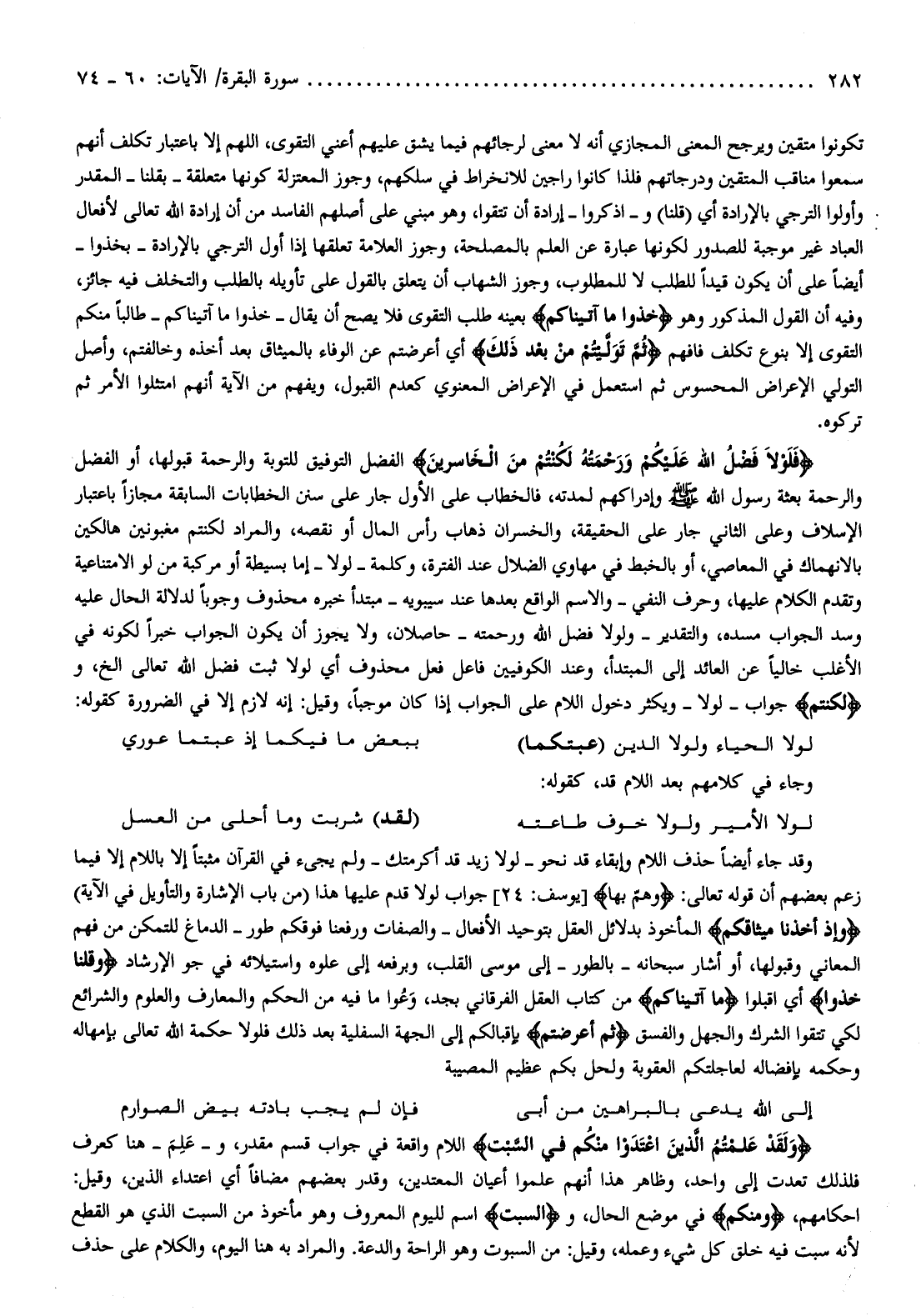 فَلَوْلا فَضْلُ اللَّهِ عَلَيْكُمْ وَرَحْمَتُهُ لَكُنْتُمْ مِنَ الْخاسِرِينَ الفضل التوفيق للتوبة والرحمة قبولها، أو الفضل والرحمة بعثة رسول الله صلّى الله عليه وسلّم وإدراكهم لمدته، فالخطاب على الأول جار على سنن الخطابات السابقة مجازا باعتبار الإسلاف وعلى الثاني جار على الحقيقة، والخسران ذهاب رأس المال أو نقصه، والمراد لكنتم مغبونين هالكين بالانهماك في المعاصي، أو بالخبط في مهاوي الضلال عند الفترة، وكلمة- لولا- إما بسيطة أو مركبة من لو الامتناعية وتقدم الكلام عليها، وحرف النفي- والاسم الواقع بعدها عند سيبويه- مبتدأ خبره محذوف وجوبا لدلالة الحال عليه وسد الجواب مسده، والتقدير- ولولا فضل الله ورحمته- حاصلان، ولا يجوز أن يكون الجواب خبرا لكونه في الأغلب خاليا عن العائد إلى المبتدأ، وعند الكوفيين فاعل فعل محذوف أي لولا ثبت فضل الله تعالى إلخ، ولَكُنْتُمْ جواب- لولا- ويكثر دخول اللام على الجواب إذا كان موجبا، وقيل: إنه لازم إلا في الضرورة كقوله: