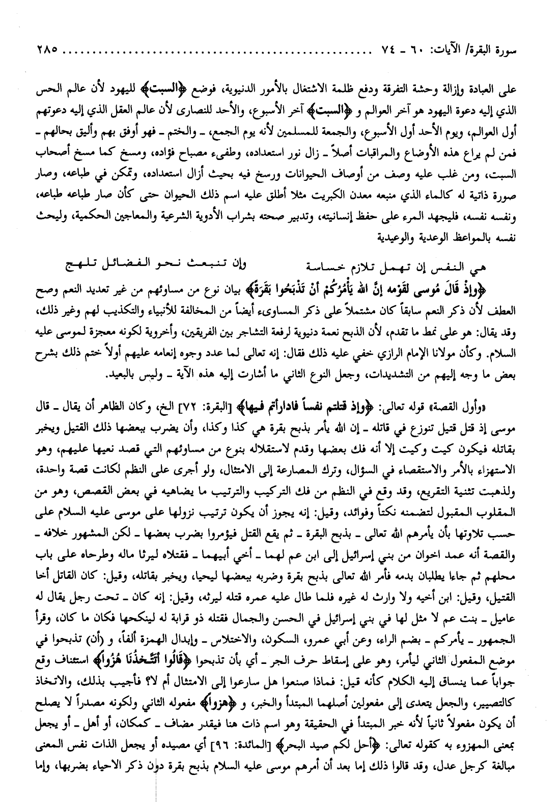 وَإِذْ قالَ مُوسى لِقَوْمِهِ إِنَّ اللَّهَ يَأْمُرُكُمْ أَنْ تَذْبَحُوا بَقَرَةً بيان نوع من مساوئهم من غير تعديد النعم وصح العطف لأن ذكر النعم سابقا كان مشتملا على ذكر المساويء أيضا من المخالفة للأنبياء والتكذيب لهم وغير ذلك، وقد يقال: هو على نمط ما تقدم، لأن الذبح نعمة دنيوية لرفعة التشاجر بين الفريقين، وأخروية لكونه معجزة لموسى عليه السلام. وكأن مولانا الإمام الرازي خفي عليه ذلك فقال: إنه تعالى لما عدد وجوه إنعامه عليهم أولا ختم ذلك بشرح بعض ما وجه إليهم من التشديدات، وجعل النوع الثاني ما أشارت إليه هذه الآية- وليس بالبعيد.