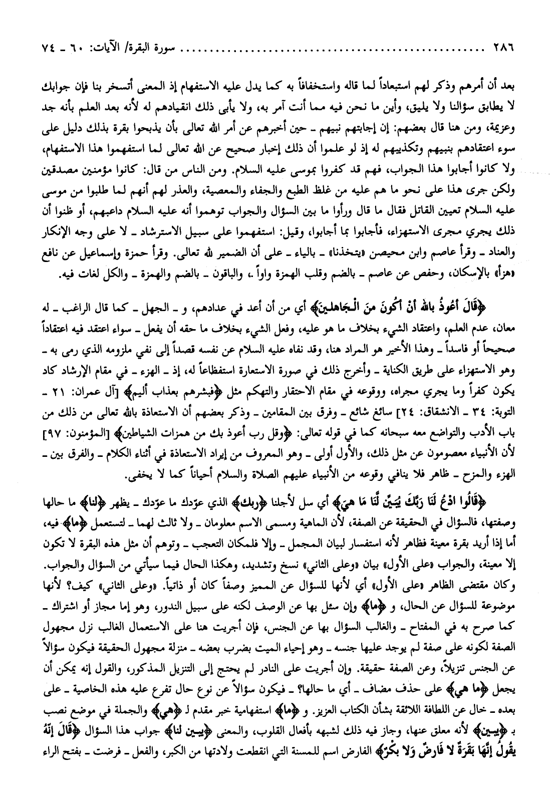 وكان مقتضى الظاهر «على الأول» أي لأنها للسؤال عن المميز وصفا كان أو ذاتيا. «وعلى الثاني» كيف؟ لأنها موضوعة للسؤال عن الحال، وما وإن سئل بها عن الوصف لكنه على سبيل الندور، وهو إما مجاز أو اشتراك- كما صرح به في المفتاح- والغالب السؤال بها عن الجنس، فإن أجريت هنا على الاستعمال الغالب نزل مجهول الصفة لكونه على صفة لم يوجد عليها جنسه- وهو إحياء الميت بضرب بعضه- منزلة مجهول الحقيقة فيكون سؤالا عن الجنس تنزيلا، وعن الصفة حقيقة. وإن أجريت على النادر لم يحتج إلى التنزيل المذكور، والقول إنه يمكن أن يجعل ما هِيَ على حذف مضاف- أي ما حالها؟ - فيكون سؤالا عن نوع حال تفرع عليه هذه الخاصية- على بعده- خال عن اللطافة اللائقة بشأن الكتاب العزيز. وما استفهامية خبر مقدم ل هِيَ والجملة في موضع نصب ب يُبَيِّنْ لأنه معلق عنها، وجاز فيه ذلك لشبهه بأفعال القلوب، والمعنى يُبَيِّنْ لَنا جواب هذا السؤال قالَ إِنَّهُ يَقُولُ إِنَّها بَقَرَةٌ لا فارِضٌ وَلا بِكْرٌ الفارض اسم للمسنة التي انقطعت ولادتها من الكبر، والفعل- فرضت- بفتح الراء