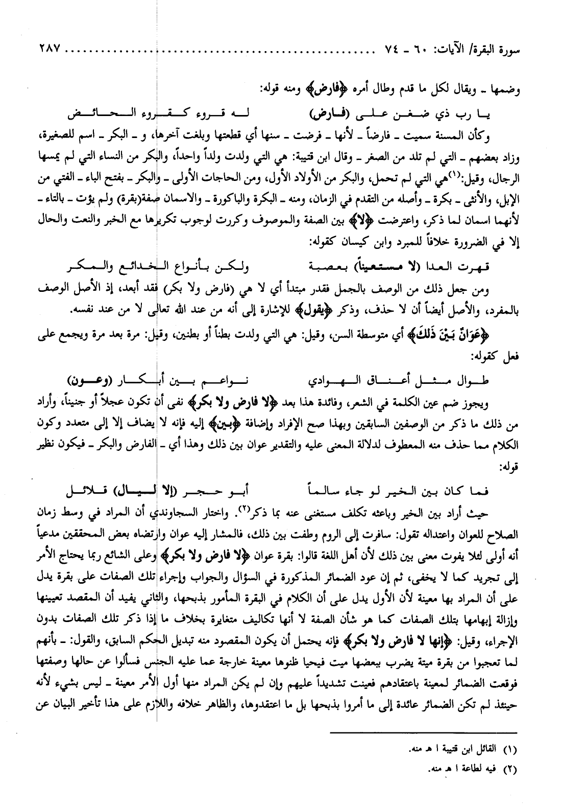 حيث أراد بين الخير وباعثه تكلف مستغنى عنه بما ذكر (¬2) . واختار السجاوندي أن المراد في وسط زمان الصلاح للعوان واعتداله تقول: سافرت إلى الروم وطفت بين ذلك، فالمشار إليه عوان وارتضاه بعض المحققين مدعيا أنه أولى لئلا يفوت معنى بين ذلك لأن أهل اللغة قالوا: بقرة عوان لا فارِضٌ وَلا بِكْرٌ وعلى الشائع ربما يحتاج الأمر إلى تجريدكما لا يخفى، ثم إن عود الضمائر المذكورة في السؤال والجواب وإجراء تلك الصفات على بقرة يدل على أن المراد بها معينة لأن الأول يدل على أن الكلام في البقرة المأمور بذبحها، والثاني يفيد أن المقصد تعيينها وإزالة إبهامها بتلك الصفات كما هو شأن الصفة لا أنها تكاليف متغايرة بخلاف ما إذا ذكر تلك الصفات بدون الإجراء، وقيل: إِنَّها بَقَرَةٌ لا فارِضٌ وَلا بِكْرٌ فإنه يحتمل أن يكون المقصود منه تبديل الحكم السابق، والقول:- بأنهم لما تعجبوا من بقرة ميتة يضرب ببعضها ميت فيحيا ظنوها معينة خارجة عما عليه الجنس فسألوا عن حالها وصفتها فوقعت الضمائر لمعينة باعتقادهم فعينت تشديدا عليهم وإن لم يكن المراد منها أول الأمر معينة- ليس بشيء لأنه حينئذ لم تكن الضمائر عائدة إلى ما أمروا بذبحها بل ما اعتقدوها، والظاهر خلافه واللازم على هذا تأخير البيان عن
