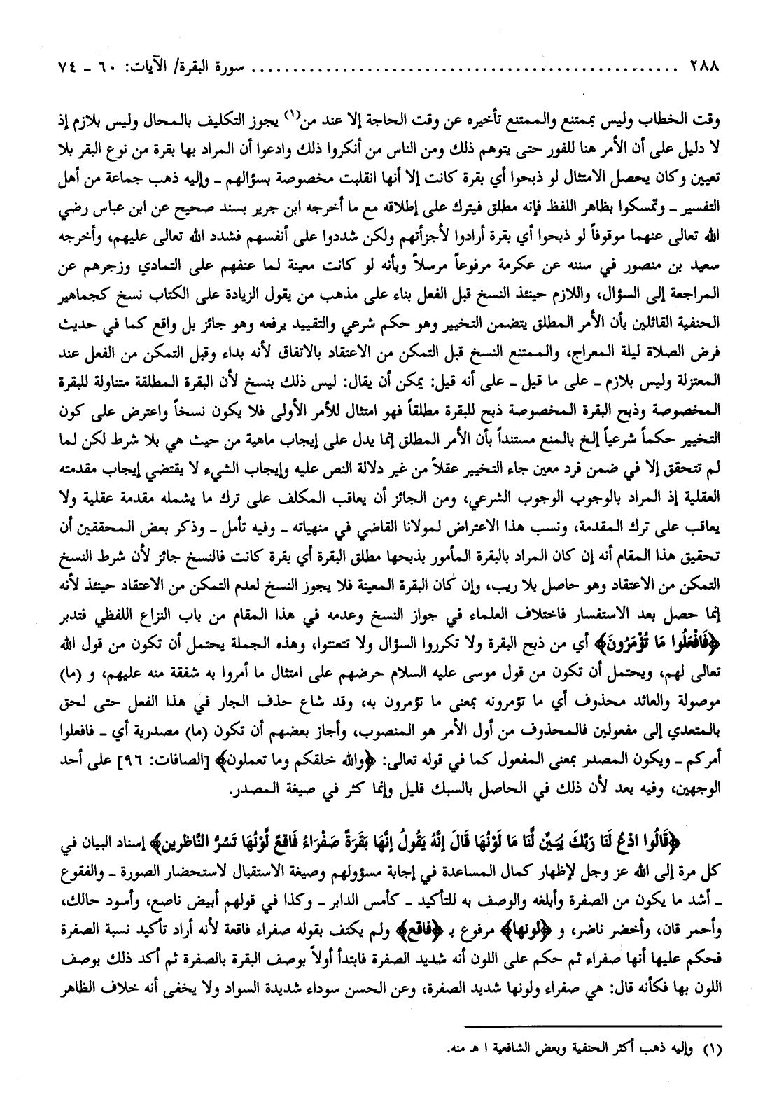 وقت الخطاب وليس بممتنع والممتنع تأخيره عن وقت الحاجة إلا عند من (¬1) يجوز التكليف بالمحال وليس بلازم إذ لا دليل على أن الأمر هنا للفور حتى يتوهم ذلك ومن الناس من أنكروا ذلك وادعوا أن المراد بها بقرة من نوع البقر بلا تعيين وكان يحصل الامتثال لو ذبحوا أي بقرة كانت إلا أنها انقلبت مخصوصة بسؤالهم- وإليه ذهب جماعة من أهل التفسير- وتمسكوا بظاهر اللفظ فإنه مطلق فيترك على إطلاقه مع ما أخرجه ابن جرير بسند صحيح عن ابن عباس رضي الله تعالى عنهما موقوفا لو ذبحوا أي بقرة أرادوا لأجزأتهم ولكن شددوا على أنفسهم فشدد الله تعالى عليهم، وأخرجه سعيد بن منصور في سننه عن عكرمة مرفوعا مرسلا وبأنه لو كانت معينة لما عنفهم على التمادي وزجرهم عن المراجعة إلى السؤال، واللازم حينئذ النسخ قبل الفعل بناء على مذهب من يقول الزيادة على الكتاب نسخ كجماهير الحنفية القائلين بأن الأمر المطلق يتضمن التخيير وهو حكم شرعي والتقييد يرفعه وهو جائز بل واقع كما في حديث فرض الصلاة ليلة المعراج، والممتنع النسخ قبل التمكن من الاعتقاد بالاتفاق لأنه بداء وقبل التمكن من الفعل عند المعتزلة وليس بلازم- على ما قيل- على أنه قيل: يمكن أن يقال: ليس ذلك بنسخ لأن البقرة المطلقة متناولة للبقرة المخصوصة وذبح البقرة المخصوصة ذبح للبقرة مطلقا فهو امتثال للأمر الأولى فلا يكون نسخا واعترض على كون التخيير حكما شرعيا إلخ بالمنع مستندا بأن الأمر المطلق إنما يدل على إيجاب ماهية من حيث هي بلا شرط لكن لما لم تتحقق إلا في ضمن فرد معين جاء التخيير عقلا من غير دلالة النص عليه وإيجاب الشيء لا يقتضي إيجاب مقدمته العقلية إذ المراد بالوجوب الوجوب الشرعي، ومن الجائز أن يعاقب المكلف على ترك ما يشمله مقدمة عقلية ولا يعاقب على ترك المقدمة، ونسب هذا الاعتراض لمولانا القاضي في منهياته- وفيه تأمل- وذكر بعض المحققين أن تحقيق هذا المقام أنه إن كان المراد بالبقرة المأمور بذبحها مطلق البقرة أي بقرة كانت فالنسخ جائز لأن شرط النسخ التمكن من الاعتقاد وهو حاصل بلا ريب، وإن كان البقرة المعينة فلا يجوز النسخ لعدم التمكن من الاعتقاد حينئذ لأنه إنما حصل بعد الاستفسار فاختلاف العلماء في جواز النسخ وعدمه في هذا المقام من باب النزاع اللفظي فتدبر فَافْعَلُوا ما تُؤْمَرُونَ أي من ذبح البقرة ولا تكرروا السؤال ولا تتعنتوا، وهذه الجملة يحتمل أن تكون من قول الله تعالى لهم، ويحتمل أن تكون من قول موسى عليه السلام حرضهم على امتثال ما أمروا به شفقة منه عليهم، و (ما) موصولة والعائد محذوف أي ما تؤمرونه بمعنى ما تؤمرون به، وقد شاع حذف الجار في هذا الفعل حتى لحق بالمتعدي إلى مفعولين فالمحذوف من أول الأمر هو المنصوب، وأجاز بعضهم أن تكون (ما) مصدرية أي- فافعلوا أمركم- ويكون المصدر بمعنى المفعول كما في قوله تعالى: وَاللَّهُ خَلَقَكُمْ وَما تَعْمَلُونَ [الصافات: 96] على أحد الوجهين، وفيه بعد لأن ذلك في الحاصل بالسبك قليل وإنما كثر في صيغة المصدر.