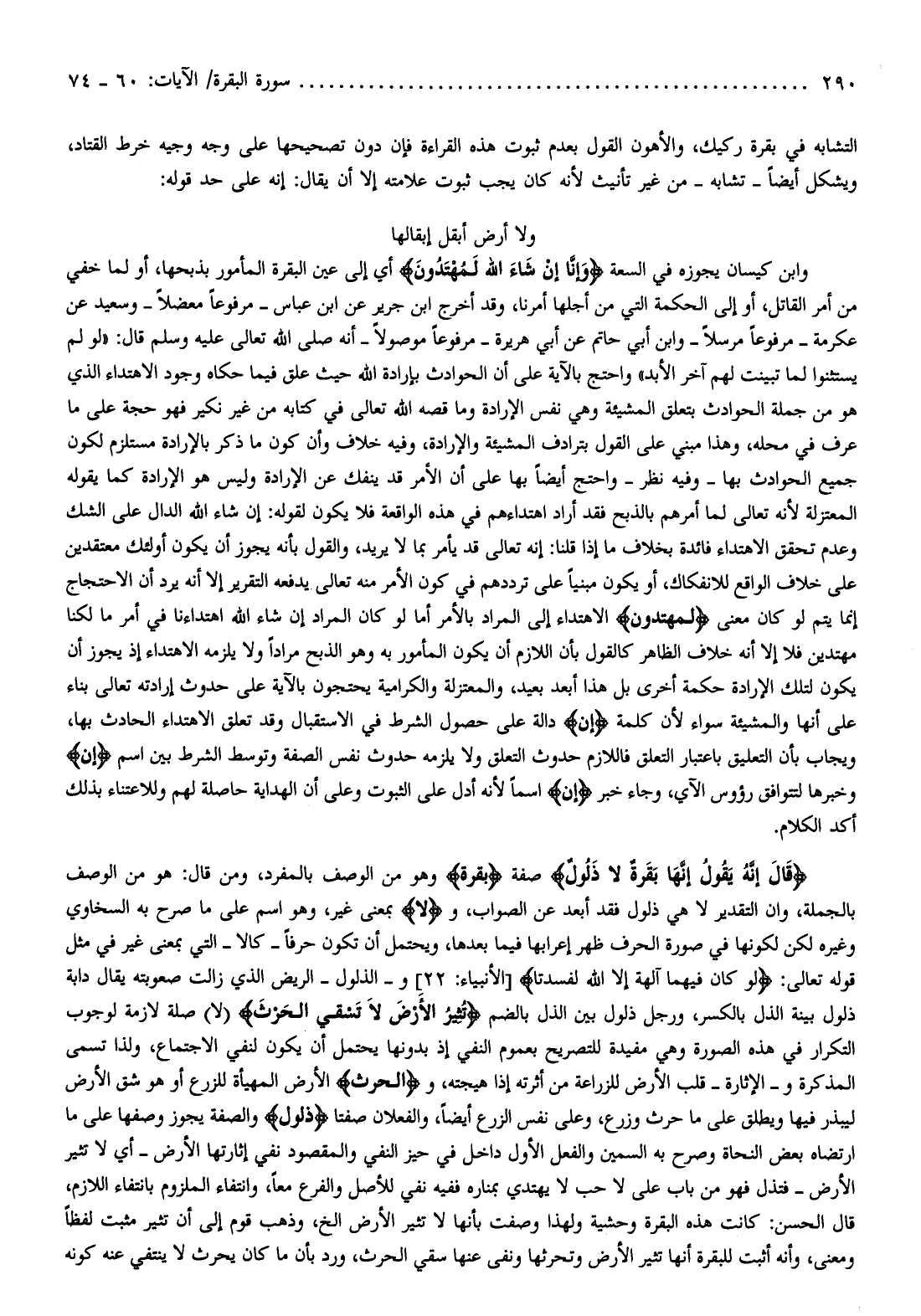 ولا أرض أبقل إبقالها وابن كيسان يجوزه في السعة وَإِنَّا إِنْ شاءَ اللَّهُ لَمُهْتَدُونَ أي إلى عين البقرة المأمور بذبحها، أو لما خفي من أمر القاتل، أو إلى الحكمة التي من أجلها أمرنا،