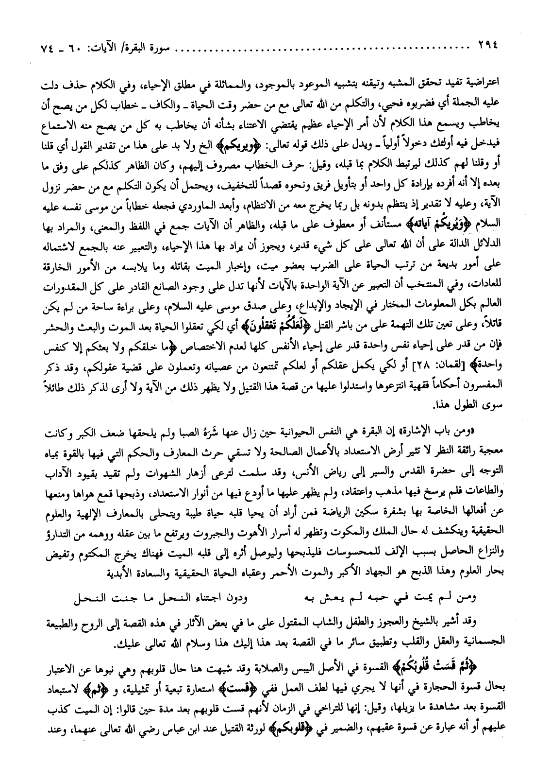 «ومن باب الإشارة» إن البقرة هي النفس الحيوانية حين زال عنها شره الصبا ولم يلحقها ضعف الكبر وكانت معجبة رائقة النظر لا تثير أرض الاستعداد بالأعمال الصالحة ولا تسقي حرث المعارف والحكم التي فيها بالقوة بمياه التوجه إلى حضرة القدس والسير إلى رياض الأنس، وقد سلمت لترعى أزهار الشهوات ولم تقيد بقيود الآداب والطاعات فلم يرسخ فيها مذهب واعتقاد، ولم يظهر عليها ما أودع فيها من أنوار الاستعداد، وذبحها قمع هواها ومنعها عن أفعالها الخاصة بها بشفرة سكين الرياضة فمن أراد أن يحيا قلبه حياة طيبة ويتحلى بالمعارف الإلهية والعلوم الحقيقية وينكشف له حال الملك والملكوت وتظهر له أسرار اللاهوت والجبروت ويرتفع ما بين عقله ووهمه من التدارؤ والنزاع الحاصل بسبب الإلف للمحسوسات فليذبحها وليوصل أثره إلى قلبه الميت فهناك يخرج المكتوم وتفيض بحار العلوم وهذا الذبح هو الجهاد الأكبر والموت الأحمر وعقباه الحياة الحقيقية والسعادة الأبدية