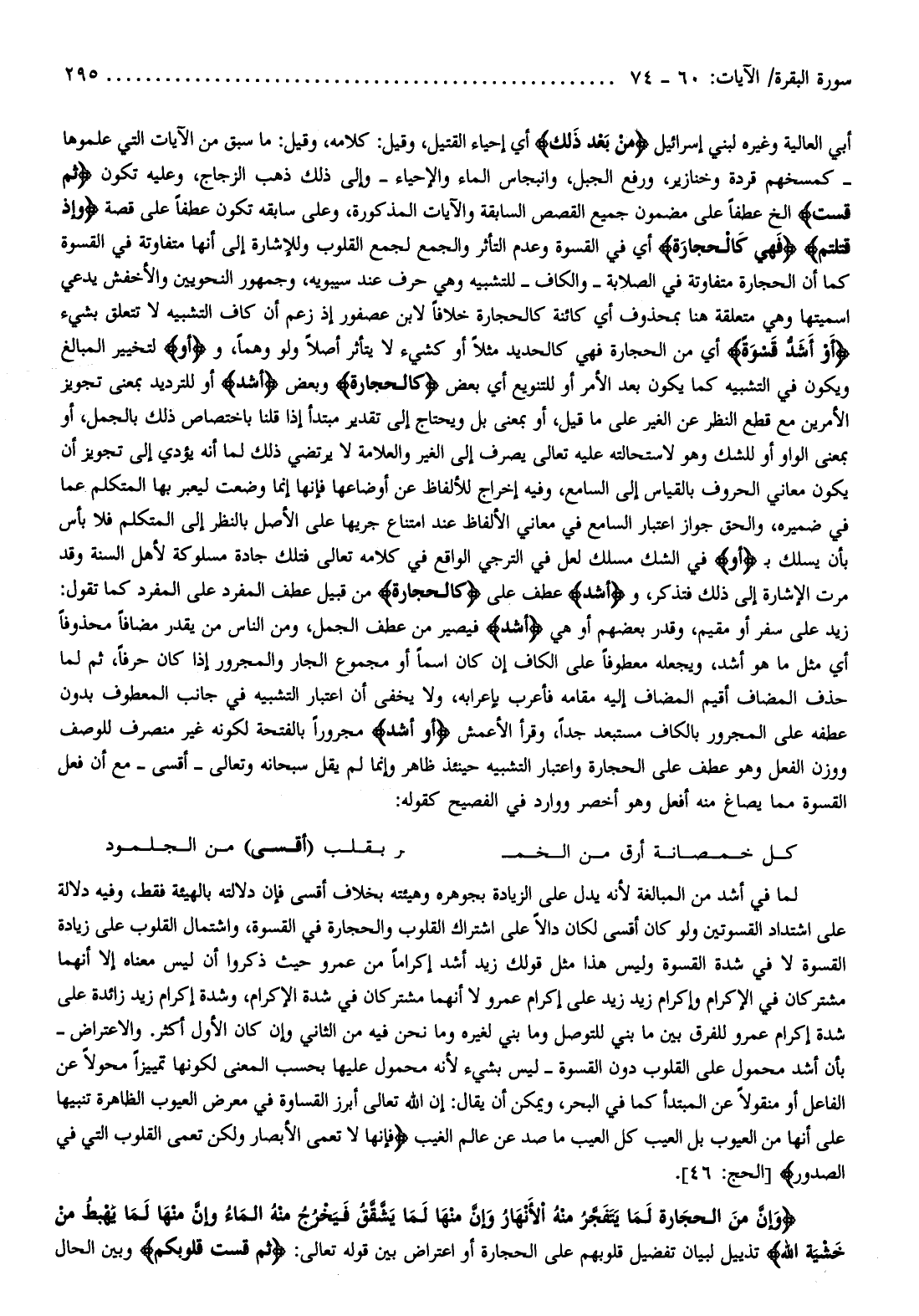 أبي العالية وغيره لبني إسرائيل مِنْ بَعْدِ ذلِكَ أي إحياء القتيل، وقيل: كلامه، وقيل: ما سبق من الآيات التي علموها- كمسخهم قردة وخنازير، ورفع الجبل، وانبجاس الماء والإحياء- وإلى ذلك ذهب الزجاج، وعليه تكون ثُمَّ قَسَتْ إلخ عطفا على مضمون جميع القصص السابقة والآيات المذكورة، وعلى سابقه تكون عطفا على قصة وَإِذْ قَتَلْتُمْ فَهِيَ كَالْحِجارَةِ أي في القسوة وعدم التأثر والجمع لجمع القلوب وللإشارة إلى أنها متفاوتة في القسوة كما أن الحجارة متفاوتة في الصلابة- والكاف- للتشبيه وهي حرف عند سيبويه، وجمهور النحويين والأخفش يدعي اسميتها وهي متعلقة هنا بمحذوف أي كائنة كالحجارة خلافا لابن عصفور إذ زعم أن كاف التشبيه لا تتعلق بشيء أَوْ أَشَدُّ قَسْوَةً أي من الحجارة فهي كالحديد مثلا أو كشيء لا يتأثر أصلا ولو وهما، وأَوْ لتخيير المبالغ ويكون في التشبيه كما يكون بعد الأمر أو للتنويع أي بعض كَالْحِجارَةِ وبعض أَشَدُّ أو للترديد بمعنى تجويز الأمرين مع قطع النظر عن الغير على ما قيل، أو بمعنى بل ويحتاج إلى تقدير مبتدأ إذا قلنا باختصاص ذلك بالجمل، أو بمعنى الواو أو للشك وهو لاستحالته عليه تعالى يصرف إلى الغير والعلامة لا يرتضي ذلك لما أنه يؤدي إلى تجويز أن يكون معاني الحروف بالقياس إلى السامع، وفيه إخراج للألفاظ عن أوضاعها فإنها إنما وضعت ليعبر بها المتكلم عما في ضميره، والحق جواز اعتبار السامع في معاني الألفاظ عند امتناع جريها على الأصل بالنظر إلى المتكلم فلا بأس بأن يسلك ب أَوْ في الشك مسلك لعل في الترجي الواقع في كلامه تعالى فتلك جادة مسلوكة لأهل السنة وقد مرت الإشارة إلى ذلك فتذكر، وأَشَدُّ عطف على كَالْحِجارَةِ من قبيل عطف المفرد على المفرد كما تقول: