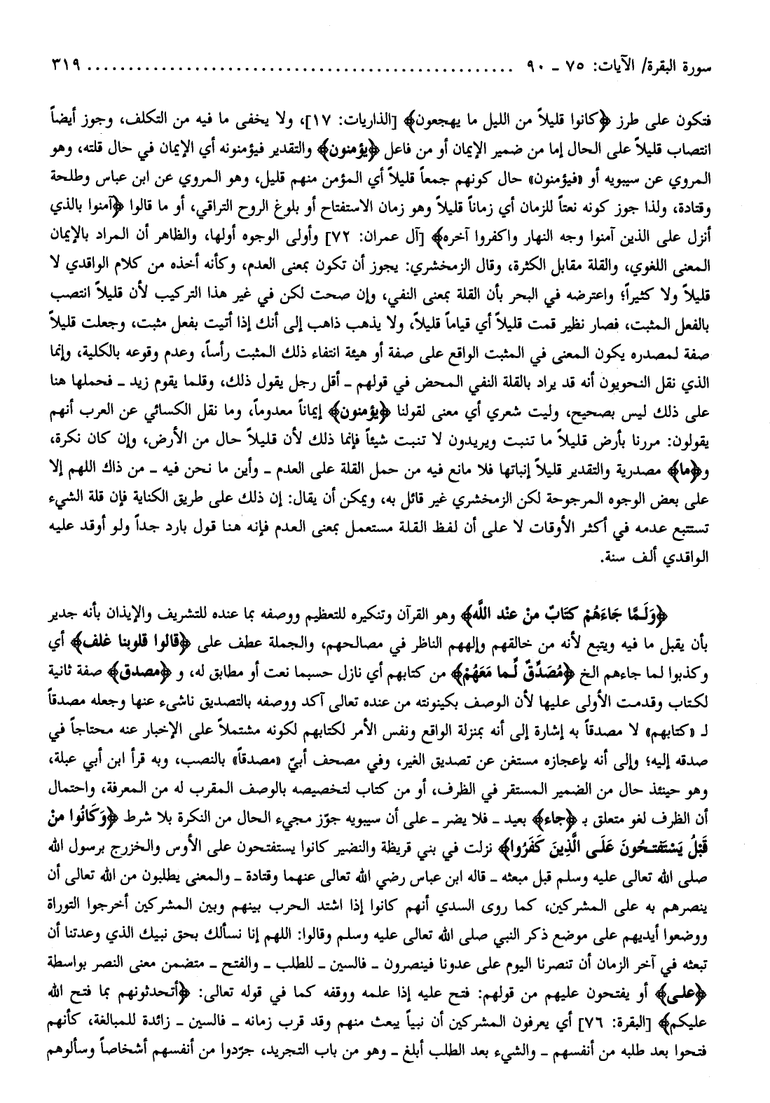 فتكون على طرز كانُوا قَلِيلًا مِنَ اللَّيْلِ ما يَهْجَعُونَ [الذاريات: 17] ، ولا يخفى ما فيه من التكلف، وجوز أيضا انتصاب قليلا على الحال إما من ضمير الإيمان أو من فاعل يُؤْمِنُونَ والتقدير فيؤمنونه أي الإيمان في حال قلته، وهو المروي عن سيبويه أو «فيؤمنون» حال كونهم جمعا قليلا أي المؤمن منهم قليل، وهو المروي عن ابن عباس وطلحة وقتادة، ولذا جوز كونه نعتا للزمان أي زمانا قليلا وهو زمان الاستفتاح أو بلوغ الروح التراقي، أو ما قالوا آمِنُوا بِالَّذِي أُنْزِلَ عَلَى الَّذِينَ آمَنُوا وَجْهَ النَّهارِ وَاكْفُرُوا آخِرَهُ [آل عمران: 72] وأولى الوجوه أولها، والظاهر أن المراد بالإيمان المعنى اللغوي، والقلة مقابل الكثرة، وقال الزمخشري: يجوز أن تكون بمعنى العدم، وكأنه أخذه من كلام الواقدي لا قليلا ولا كثيرا واعترضه في البحر بأن القلة بمعنى النفي، وإن صحت لكن في غير هذا التركيب لأن قليلا انتصب بالفعل المثبت، فصار نظير قمت قليلا أي قياما قليلا، ولا يذهب ذاهب إلى أنك إذا أتيت بفعل مثبت، وجعلت قليلا صفة لمصدره يكون المعنى في المثبت الواقع على صفة أو هيئة انتفاء ذلك المثبت رأسا، وعدم وقوعه بالكلية، وإنما الذي نقل النحويون أنه قد يراد بالقلة النفي المحض في قولهم- أقل رجل يقول ذلك، وقلما يقوم زيد- فحملها هنا على ذلك ليس بصحيح، وليت شعري أي معنى لقولنا يُؤْمِنُونَ إيمانا معدوما، وما نقل الكسائي عن العرب أنهم يقولون: مررنا بأرض قليلا ما تنبت ويريدون لا تنبت شيئا فإنما ذلك لأن قليلا حال من الأرض، وإن كان نكرة، وما مصدرية والتقدير قليلا إنباتها فلا مانع فيه من حمل القلة على العدم- وأين ما نحن فيه- من ذاك اللهم إلا على بعض الوجوه المرجوحة لكن الزمخشري غير قائل به، ويمكن أن يقال: إن ذلك على طريق الكناية فإن قلة الشيء تستتبع عدمه في أكثر الأوقات لا على أن لفظ القلة مستعمل بمعنى العدم فإنه هنا قول بارد جدا ولو أوقد عليه الواقدي ألف سنة.