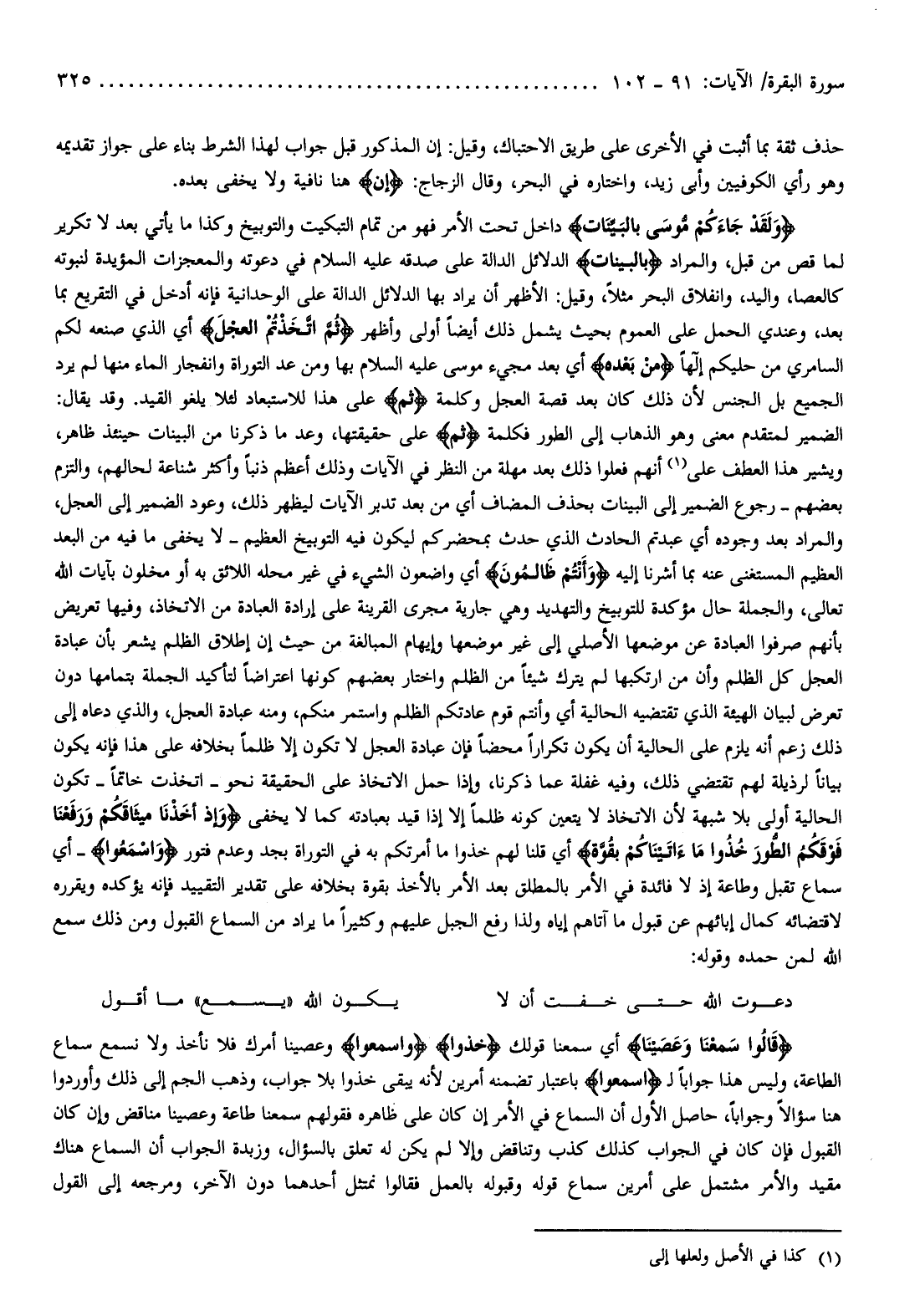قالُوا سَمِعْنا وَعَصَيْنا أي سمعنا قولك خُذُوا وَاسْمَعُوا وعصينا أمرك فلا نأخذ ولا نسمع سماع الطاعة، وليس هذا جوابا ل اسْمَعُوا باعتبار تضمنه أمرين لأنه يبقى خذوا بلا جواب، وذهب الجم إلى ذلك وأوردوا هنا سؤالا وجوابا، حاصل الأول أن السماع في الأمر إن كان على ظاهره فقولهم سمعنا طاعة وعصينا مناقض وإن كان القبول فإن كان في الجواب كذلك كذب وتناقض وإلا لم يكن له تعلق بالسؤال، وزبدة الجواب أن السماع هناك مقيد والأمر مشتمل على أمرين سماع قوله وقبوله بالعمل فقالوا نمتثل أحدهما دون الآخر، ومرجعه إلى القول