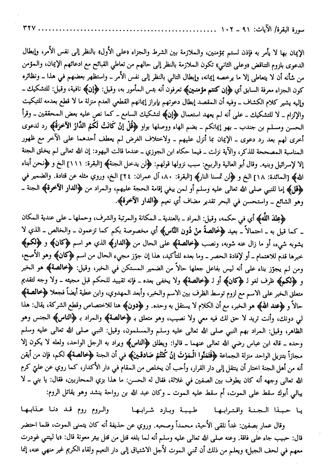 عِنْدَ اللَّهِ أي في حكمه، وقيل: المراد- بالعندية- المكانة والمرتبة والشرف، وحملها- على عندية المكان- كما قيل به- احتمالا- بعيد خالِصَةً مِنْ دُونِ النَّاسِ أي مخصوصة بكم كما تزعمون- والخالص- الذي لا يشوبه شيء، أو ما زال عنه شوبه، ونصب خالِصَةً على الحال من الدَّارُ الذي هو اسم كان ولَكُمُ خبرها قدم للاهتمام- أو لإفادة الحصر- وما بعده للتأكيد، هذا إن جوّز مجيء الحال من اسم كان وهو الأصح، ومن لم يجوّز بناء على أنه ليس بفاعل جعلها حالا من الضمير المستكن في الخبر، وقيل: خالِصَةً هو الخبر ولَكُمُ ظرف لغو لكان أو ل خالِصَةً ولا يخفى بعده- فإنه تقييد للحكم قبل مجيئه- ولا وجه لتقديم متعلق الخبر على الاسم مع لزوم توسط الظرف بين الاسم والخبر، وأبعد المهدوي، وابن عطية أيضا فجعلا خالِصَةً حالا وعِنْدَ اللَّهِ هو الخبر، مع أن الكلام لا يستقل به وحده. ودُونِ هنا للاختصاص وقطع الشركة، يقال: هذا لي دونك، وأنت تريد لا حق لك فيه معي ولا نصيب، وهو متعلق ب خالِصَةً والمراد ب النَّاسِ الجنس وهو الظاهر، وقيل: المراد بهم النبي صلى الله تعالى عليه وسلم والمسلمون، وقيل: النبي صلى الله تعالى عليه وسلم وحده- قاله ابن عباس رضي الله تعالى عنهما- قالوا: ويطلق النَّاسِ ويراد به الرجل الواحد، ولعله لا يكون إلا مجازا بتنزيل الواحد منزلة الجماعة فَتَمَنَّوُا الْمَوْتَ إِنْ كُنْتُمْ صادِقِينَ في أن الجنة خالِصَةً لكم، فإن من أيقن أنه من أهل الجنة اختار أن ينتقل إلى دار القرار، وأحب أن يخلص من المقام في دار الأكدار، كما