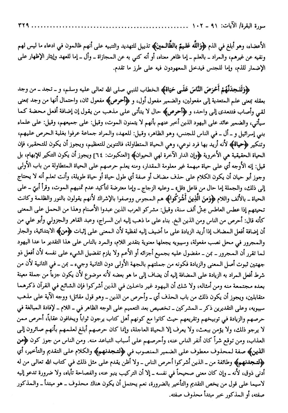 وَلَتَجِدَنَّهُمْ أَحْرَصَ النَّاسِ عَلى حَياةٍ الخطاب للنبي صلى الله تعالى عليه وسلم، وتجد- من وجد بعقله بمعنى علم المتعدية إلى مفعولين، والضمير مفعول أول، وأَحْرَصَ مفعول ثان، واحتمال أنها من وجد بمعنى لقي وأصاب فتتعدى إلى واحد، وأَحْرَصَ حال لا يتأتى على مذهب من يقول إن إضافة أفعل محضة كما سيأتي، والضمير عائد على اليهود الذين أخبر عنهم بأنهم لا يتمنون الموت، وقيل: على جميعهم، وقيل: على علماء بني إسرائيل وأل- في الناس للجنس، وهو الظاهر، وقيل: للعهد، والمراد جماعة عرفوا بغلبة الحرص عليهم، وتنكير حَياةٍ لأنه أريد بها فرد نوعي، وهي الحياة المتطاولة، فالتنوين للتعظيم، ويجوز أن يكون للتحقير، فإن الحياة الحقيقية هي الأخروية وَإِنَّ الدَّارَ الْآخِرَةَ لَهِيَ الْحَيَوانُ [العنكبوت: 64] ويجوز أن يكون التنكير للإبهام، بل قيل: إنه الأوجه أي على حياة مبهمة غير معلومة المقدار، ومنه يعلم حرصهم على الحياة المتطاولة من باب الأولى وجوز أبو حيان أن يكون الكلام على حذف مضاف أو صفة أي طول حياة أو حياة طويلة، وأنت تعلم أنه لا يحتاج إلى ذلك، والجملة إما حال من فاعل «قل» - وعليه الزجاج- وإما معترضة لتأكيد عدم تمنيهم الموت، وقرأ أبيّ- على الحياة- بالألف واللام وَمِنَ الَّذِينَ أَشْرَكُوا هم المجوس ووصفوا بالإشراك لأنهم يقولون بالنور والظلمة وكانت تحيتهم إذا عطس العاطس عش ألف سنة، وقيل: مشركو العرب الذين عبدوا الأصنام وهذا من الحمل على المعنى كأنه قال: أحرص من الناس ومن الذين إلخ. بناء على ما ذهب إليه ابن السراج، وعبد القاهر والجزولي وأبو علي من أن إضافة أفعل المضاف إذا أريد الزيادة على ما أضيف إليه لفظية لأن المعنى على إثبات مِنَ الابتدائية، والجار والمجرور في محل نصب مفعولة، وسيبويه يجعلها معنوية بتقدير اللام، والمرد بالناس على هذا التقدير ما عدا اليهود لما تقرر أن المجرور- بمن- مفضول عليه بجميع أجزائه أو الأعم ولا يلزم تفضيل الشيء على نفسه لأن أفعل ذو جهتين ثبوت أصل المعنى والزيادة فكونه من جملتهم بالجهة الأولى دون الثانية وجيء- بمن- في الثانية لأن من شرط أفعل المراد به الزيادة على المضافة إليه أن يضاف إلى ما هو بعضه لأنه موضوع لأن يكون جزءا من جملة معينة بعده مجتمعة منه ومن أمثاله، ولا شك أن اليهود غير داخلين في الذين أشركوا فإن الشائع في القرآن ذكرهما متقابلين، ويجوز أن يكون ذلك من باب الحذف أي- وأحرص من الذين- وهو قول مقاتل ووجه الآية على مذهب سيبويه، وعلى التقديرين ذكر- المشركين- تخصيص بعد التعميم على الوجه الظاهر في- اللام- لإفادة المبالغة في حرصهم والزيادة في توبيخهم وتقريعهم حيث كانوا مع كونهم أهل كتاب يرجون ثوابا ويخافون عقابا، أحرص ممن لا يرجو ذلك، ولا يؤمن ببعث، ولا يعرف إلا الحياة العاجلة، وإنما كان حرصهم أبلغ لعلمهم بأنهم صائرون إلى العذاب، ومن توقع شرا كان أنفر الناس عنه، وأحرصهم على أسباب التباعد منه. ومن الناس من جوز كون مِنَ الَّذِينَ صفة لمحذوف معطوف على الضمير المنصوب في لَتَجِدَنَّهُمْ والكلام على التقديم والتأخير، أي لَتَجِدَنَّهُمْ وطائفة من- الذين أشركوا أحرص الناس- ولا أظن يقدم على مثل ذلك في كتاب الله تعالى من له أدنى ذوق، لأنه- وإن كان معنى صحيحا في نفسه- إلا أن التركيب ينبو عنه، والفصاحة تأباه، ولا ضرورة تدعو إليه لا سيما على قول من يخص التقديم والتأخير بالضرورة، نعم يحتمل أن يكون هناك محذوف- هو مبتدأ- والمذكور صفته، أو المذكور خبر مبتدأ محذوف صفته.