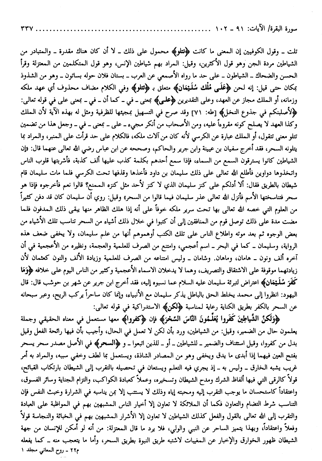وَلكِنَّ الشَّياطِينَ كَفَرُوا يُعَلِّمُونَ النَّاسَ السِّحْرَ فإن كَفَرُوا معها مستعمل في معناه الحقيقي وجملة يعلمون حال من الضمير، وقيل: من الشياطين، ورد بأن لكن لا تعمل في الحال، وأجيب بأن فيها رائحة الفعل وقيل بدل من كفروا، وقيل استئناف والضمير- للشياطين- أو- للذين اتبعوا- والسِّحْرَ في الأصل مصدر سحر يسحر بفتح العين فيهما إذا أبدى ما يدق ويخفى وهو من المصادر الشاذة، ويستعمل بما لطف وخفي سببه، والمراد به أمر غريب يشبه الخارق- وليس به- إذ يجري فيه التعلم ويستعان في تحصيله بالتقرب إلى الشيطان بارتكاب القبائح، قولا كالرقى التي فيها ألفاظ الشرك ومدح الشيطان وتسخيره، وعملا كعبادة الكواكب، والتزام الجناية وسائر الفسوق، واعتقادا كاستحسان ما يوجب التقرب إليه ومحبته إياه وذلك لا يستتب إلا بمن يناسبه في الشرارة وخبث النفس فإن التناسب شرط التضام والتعاون فكما أن الملائكة لا تعاون إلا أخيار الناس المشبهين بهم في المواظبة على العبادة والتقرب إلى الله تعالى بالقول والفعل كذلك الشياطين لا تعاون إلا الأشرار المشبهين بهم في الخباثة والنجاسة قولا وفعلا واعتقادا، وبهذا يتميز الساحر عن النبي والولي، فلا يرد ما قال المعتزلة: من أنه لو أمكن للإنسان من جهة الشيطان ظهور الخوارق والإخبار عن المغيبات لاشتبه طريق النبوة بطريق السحر، وأما ما يتعجب منه- كما يفعله