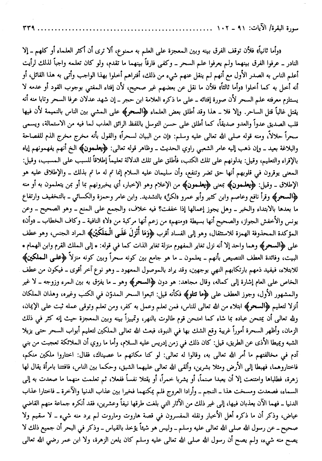 «وأما ثانيا» فلأن توقف الفرق بينه وبين المعجزة على العلم به ممنوع، ألا ترى أن أكثر العلماء أو كلهم- إلا النادر- عرفوا الفرق بينهما ولم يعرفوا علم السحر- وكفى فارقا بينهما ما تقدم، ولو كان تعلمه واجبا لذلك لرأيت أعلم الناس به الصدر الأول مع أنهم لم ينقل عنهم شيء من ذلك، أفتراهم أخلوا بهذا الواجب وأتى به هذا القائل، أو أنه أخل به كما أخلوا «وأما ثالثا» فلأن ما نقل عن بعضهم غير صحيح، لأن إفتاء المفتي بوجوب القود أو عدمه لا يستلزم معرفته علم السحر لأن صورة إفتائه- على ما ذكره العلامة ابن حجر- إن شهد عدلان عرفا السحر وتابا منه أنه يقتل غالبا قتل الساحر. وإلا فلا- هذا وقد أطلق بعض العلماء السِّحْرَ على المشي بين الناس بالنميمة لأن فيها قلب الصديق عدوا والعدو صديقا، كما أطلق على حسن التوسل باللفظ الرائق العذاب لما فيه من الاستمالة، ويسمى سحرا حلالا، ومنه
