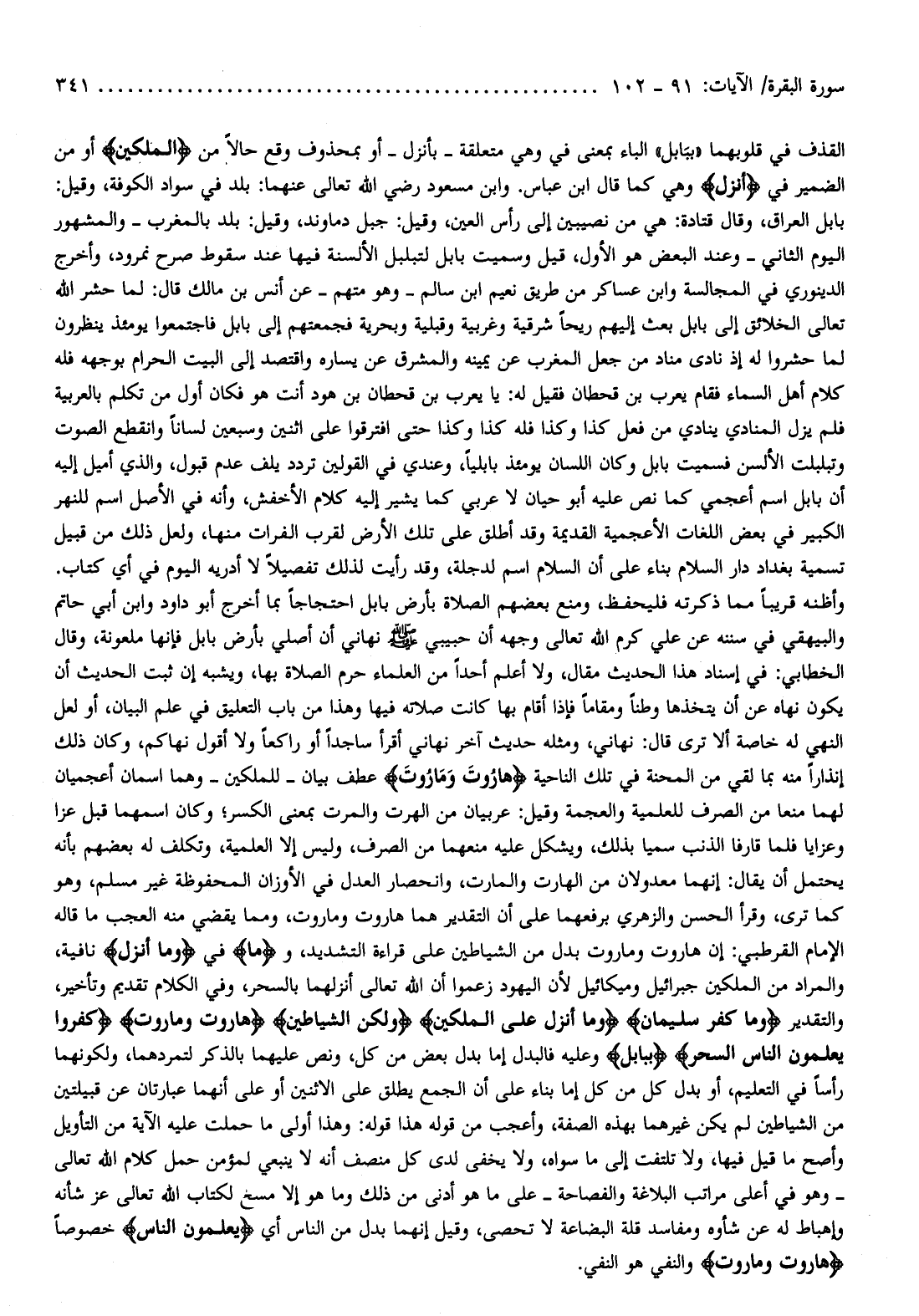 القذف في قلوبهما «ببابل» الباء بمعنى في وهي متعلقة- بأنزل- أو بمحذوف وقع حالا من الْمَلَكَيْنِ أو من الضمير في أُنْزِلَ وهي كما قال ابن عباس. وابن مسعود رضي الله تعالى عنهما: بلد في سواد الكوفة، وقيل:
