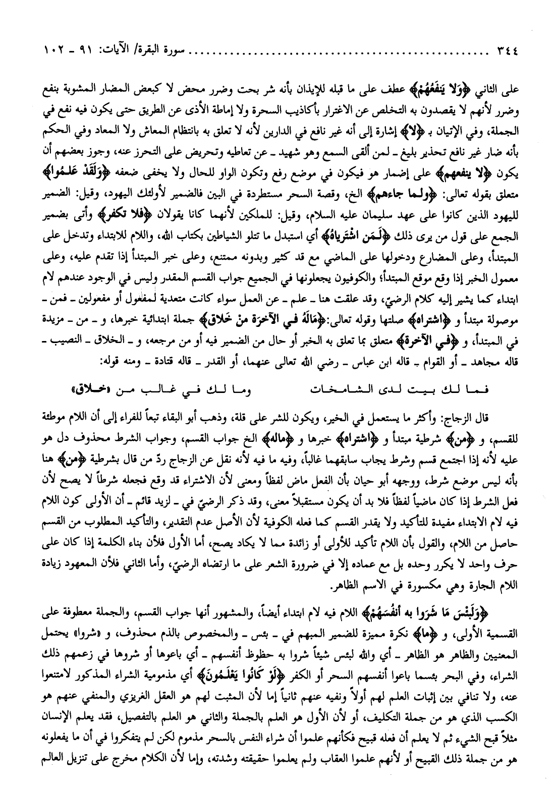 على الثاني وَلا يَنْفَعُهُمْ عطف على ما قبله للإيذان بأنه شر بحت وضرر محض لا كبعض المضار المشوبة بنفع وضرر لأنهم لا يقصدون به التخلص عن الاغترار بأكاذيب السحرة ولا إماطة الأذى عن الطريق حتى يكون فيه نفع في الجملة، وفي الإتيان ب لا إشارة إلى أنه غير نافع في الدارين لأنه لا تعلق به بانتظام المعاش ولا المعاد وفي الحكم بأنه ضار غير نافع تحذير بليغ- لمن ألقى السمع وهو شهيد- عن تعاطيه وتحريض على التحرز عنه، وجوز بعضهم أن يكون لا يَنْفَعُهُمْ على إضمار هو فيكون في موضع رفع وتكون الواو للحال ولا يخفى ضعفه وَلَقَدْ عَلِمُوا متعلق بقوله تعالى: وَلَمَّا جاءَهُمْ إلخ، وقصة السحر مستطردة في البين فالضمير لأولئك اليهود، وقيل: الضمير لليهود الذين كانوا على عهد سليمان عليه السلام، وقيل: للملكين لأنهما كانا يقولان فَلا تَكْفُرْ وأتى بضمير الجمع على قول من يرى ذلك لَمَنِ اشْتَراهُ أي استبدل ما تتلو الشياطين بكتاب الله، واللام للابتداء وتدخل على المبتدأ، وعلى المضارع ودخولها على الماضي مع قد كثير وبدونه ممتنع، وعلى خبر المبتدأ إذا تقدم عليه، وعلى معمول الخبر إذا وقع موقع المبتدأ والكوفيون يجعلونها في الجميع جواب القسم المقدر وليس في الوجود عندهم لام ابتداء كما يشير إليه كلام الرضيّ، وقد علقت هنا- علم- عن العمل سواء كانت متعدية لمفعول أو مفعولين- فمن- موصولة مبتدأ واشْتَراهُ صلتها وقوله تعالى: ما لَهُ فِي الْآخِرَةِ مِنْ خَلاقٍ جملة ابتدائية خبرها، ومن- مزيدة في المبتدأ، وفِي الْآخِرَةِ متعلق بما تعلق به الخبر أو حال من الضمير فيه أو من مرجعه، والخلاق- النصيب- قاله مجاهد- أو القوام- قاله ابن عباس- رضي الله تعالى عنهما، أو القدر- قاله قتادة- ومنه قوله: